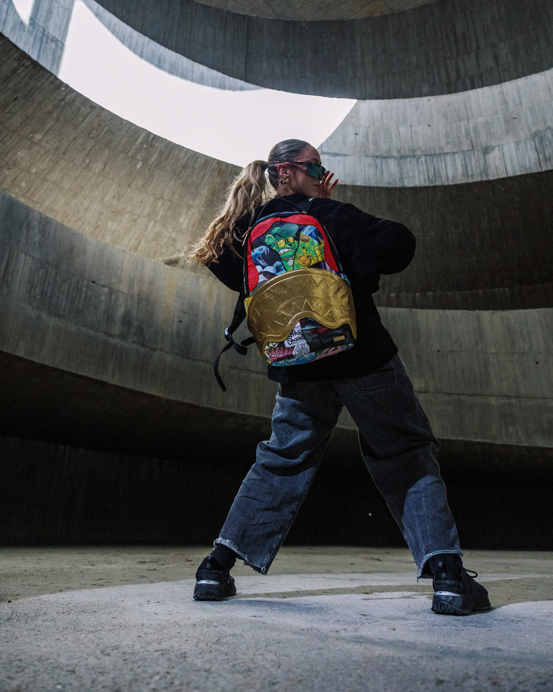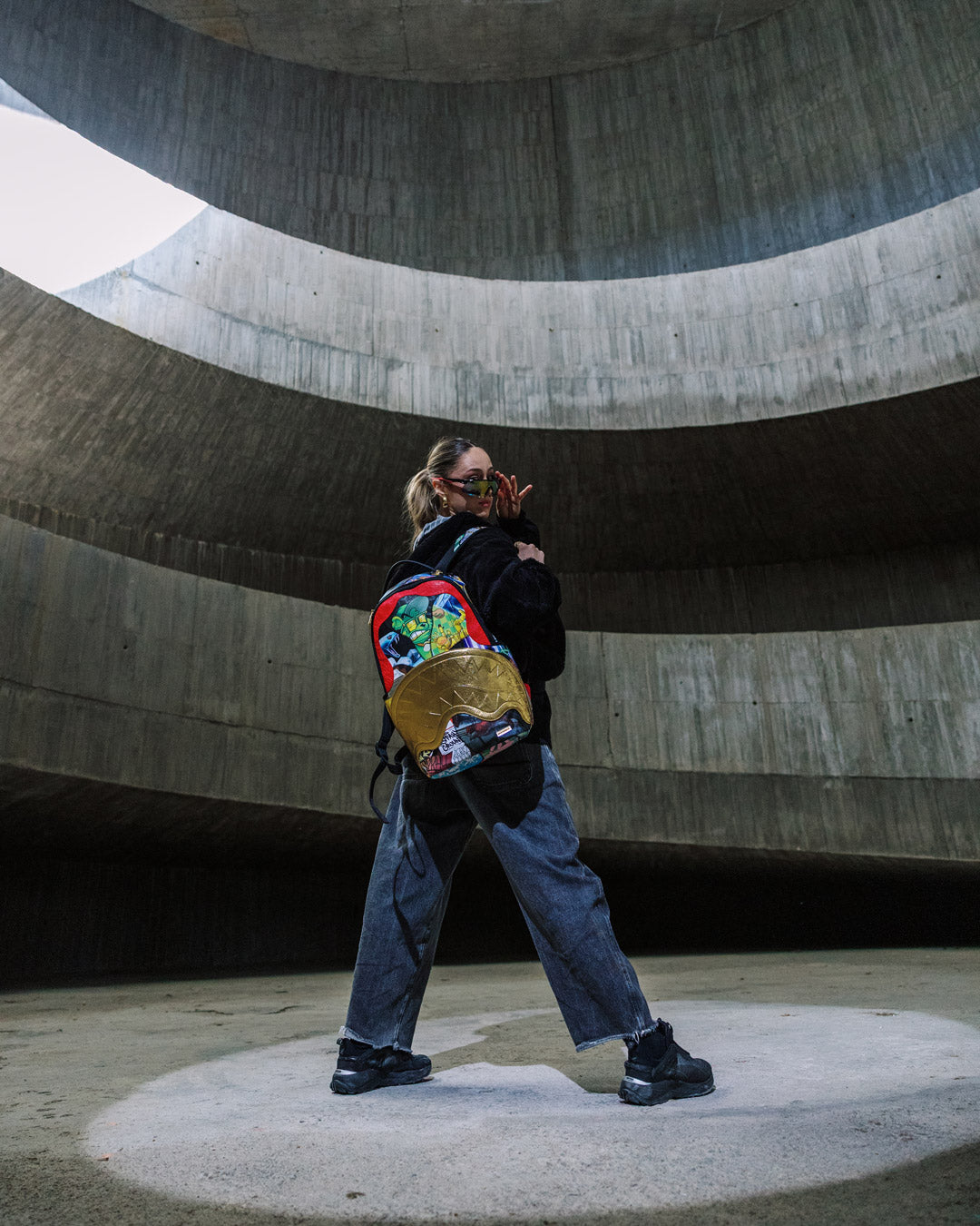 Dimensions: 18' x 6' x 11.5' • Front zipper pocket • Side pockets • Zippered Stash pocket • Separate velour sunglass compartment • Ergonomic mesh back padding • Adjustable Straps for custom sizing • Gold zippers with metal hardware • Metal 'Sprayground Authentic' badge • Slide through back sleeve connects to carry-on luggage to free your hands