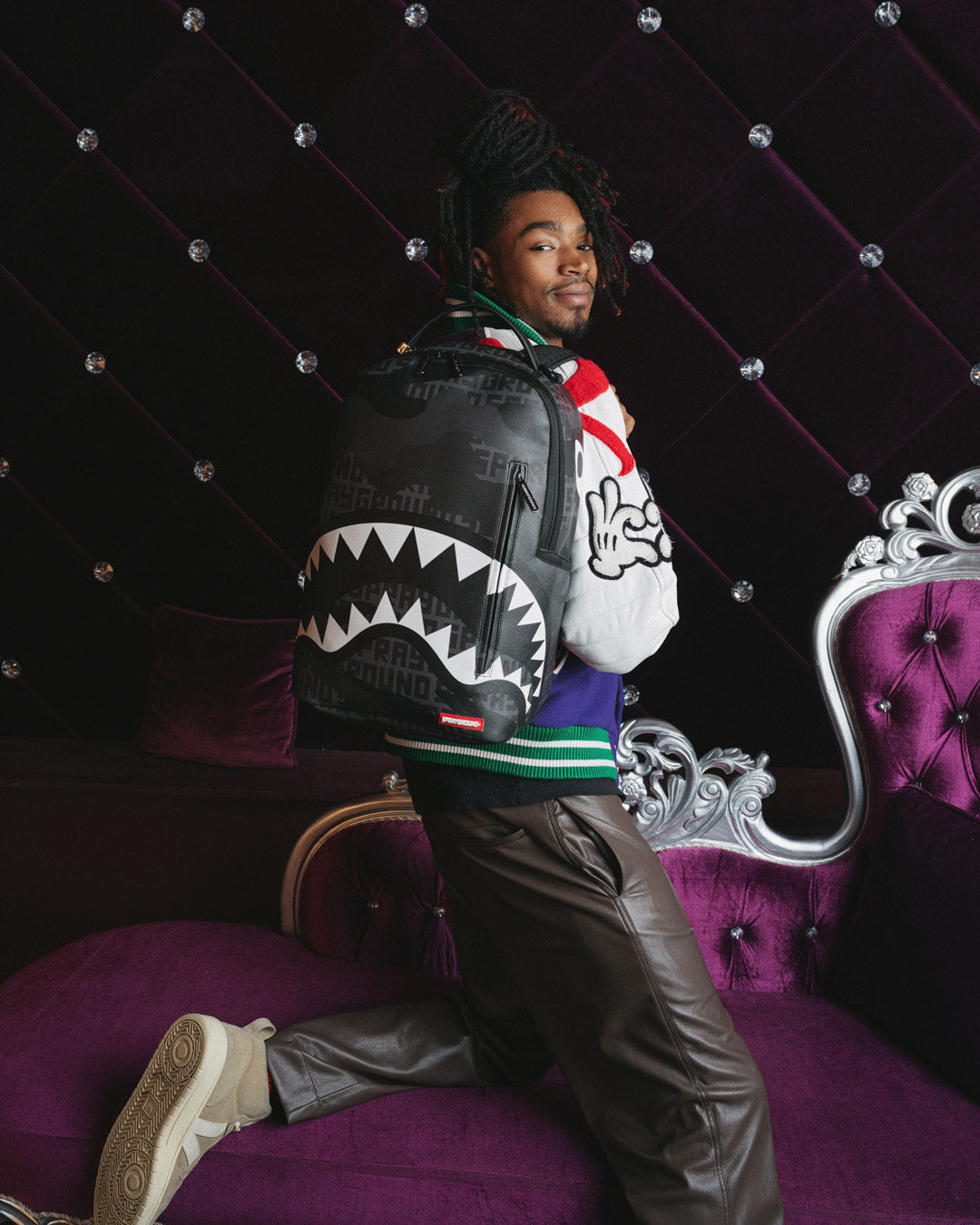 Dimensions: 18' x 6' x 11.5' • Front zipper pocket • Side pockets • Zippered Stash pocket • Separate velour sunglass compartment • Ergonomic mesh back padding • Adjustable Straps for custom sizing • Gold zippers with metal hardware • Metal 'Sprayground Authentic' badge • Slide through back sleeve connects to carry-on luggage to free your hands