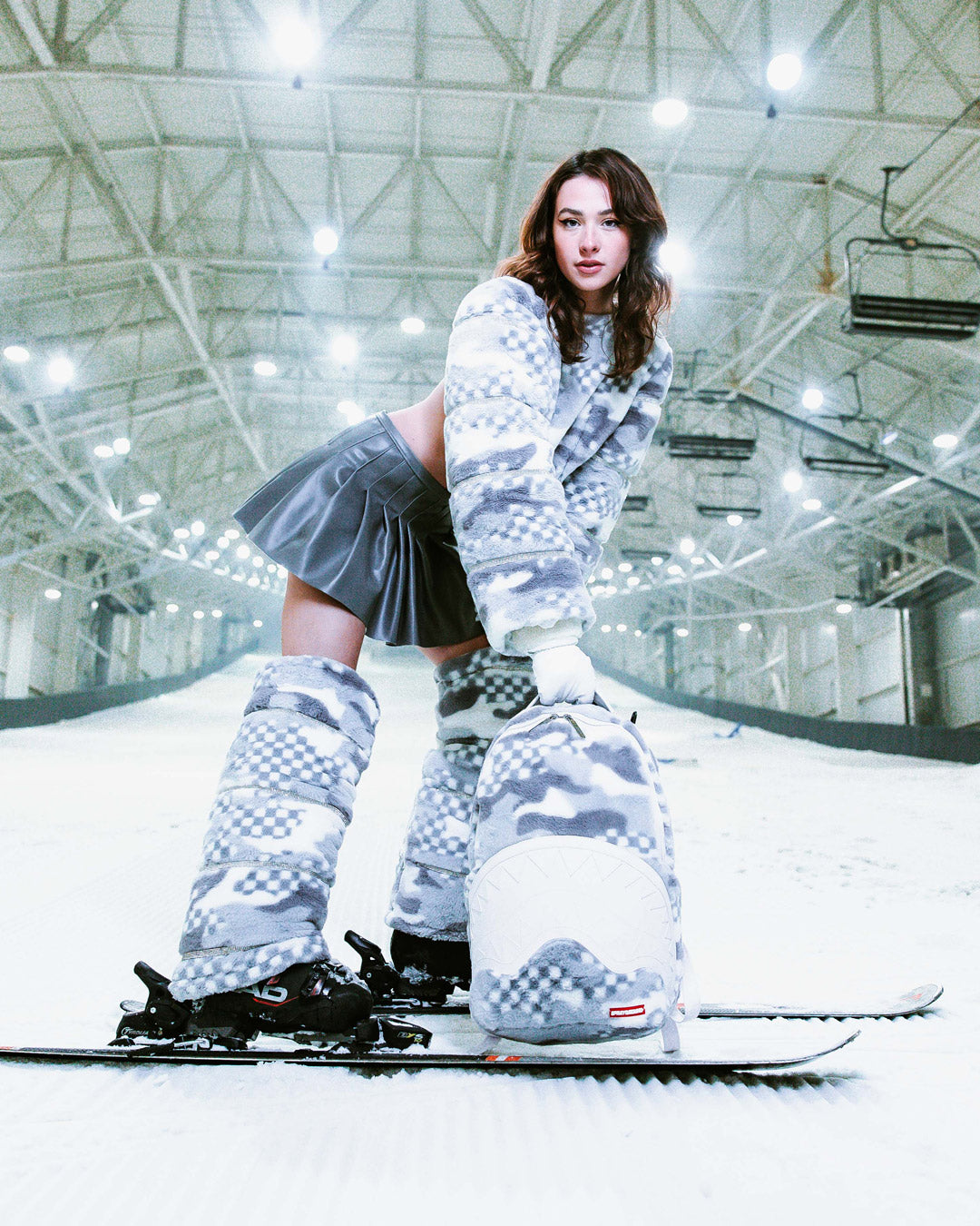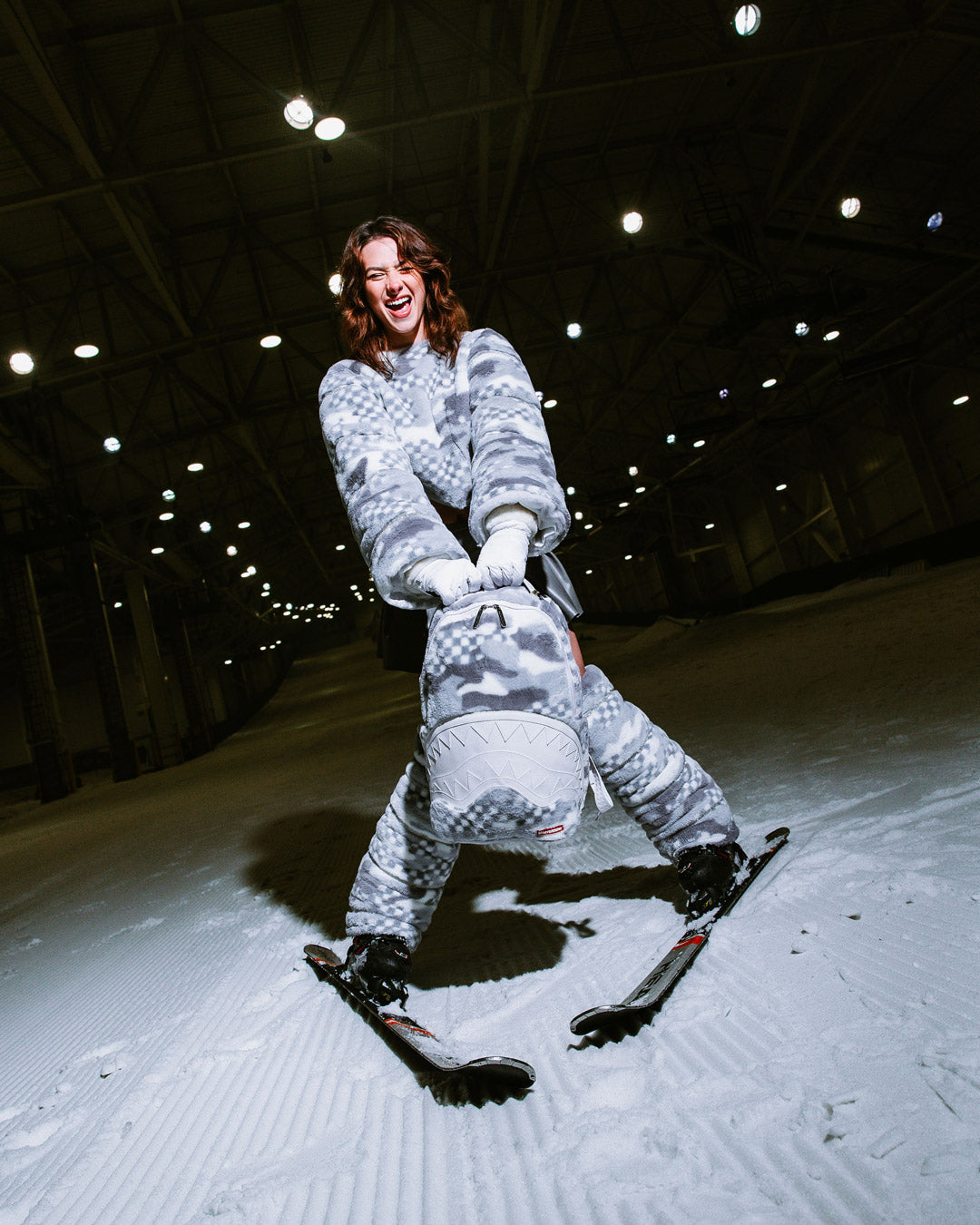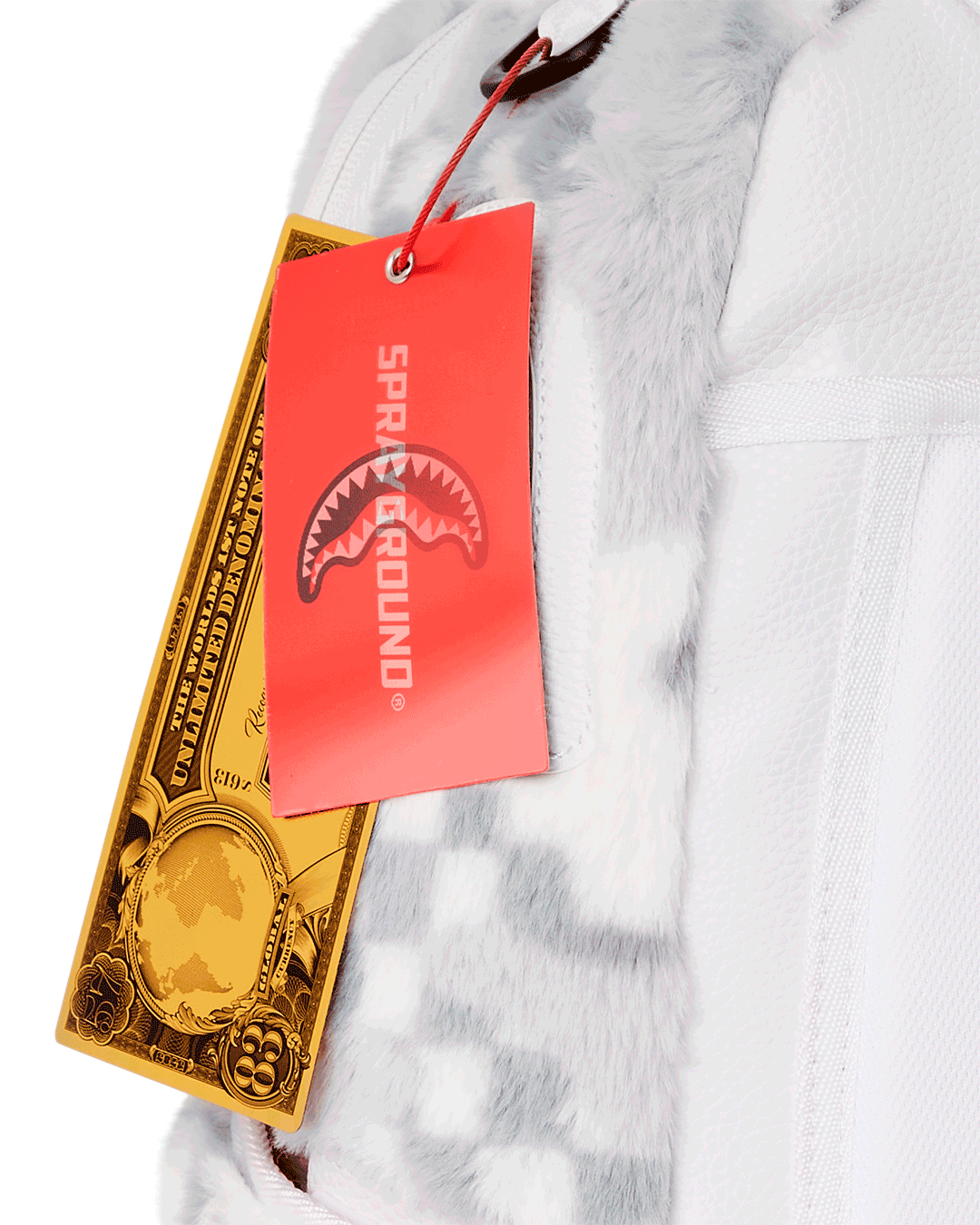 Dimensions: 18' x 6' x 11.5' • Front zipper pocket • Side pockets • Zippered Stash pocket • Separate velour sunglass compartment • Ergonomic mesh back padding • Adjustable Straps for custom sizing • Gold zippers with metal hardware • Metal 'Sprayground Authentic' badge • Slide through back sleeve connects to carry-on luggage to free your hands