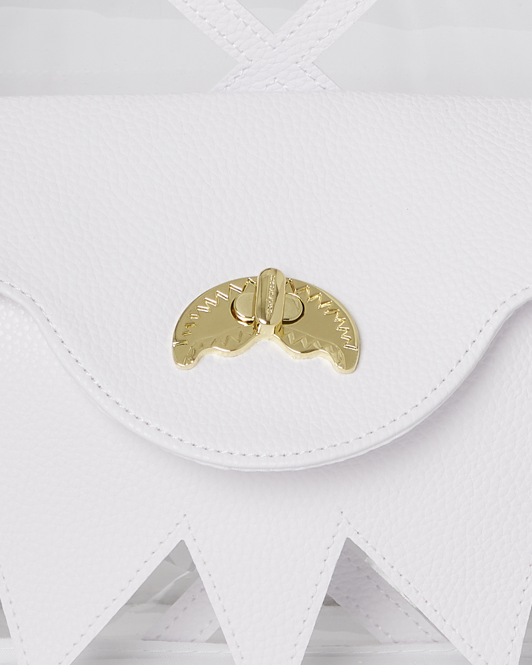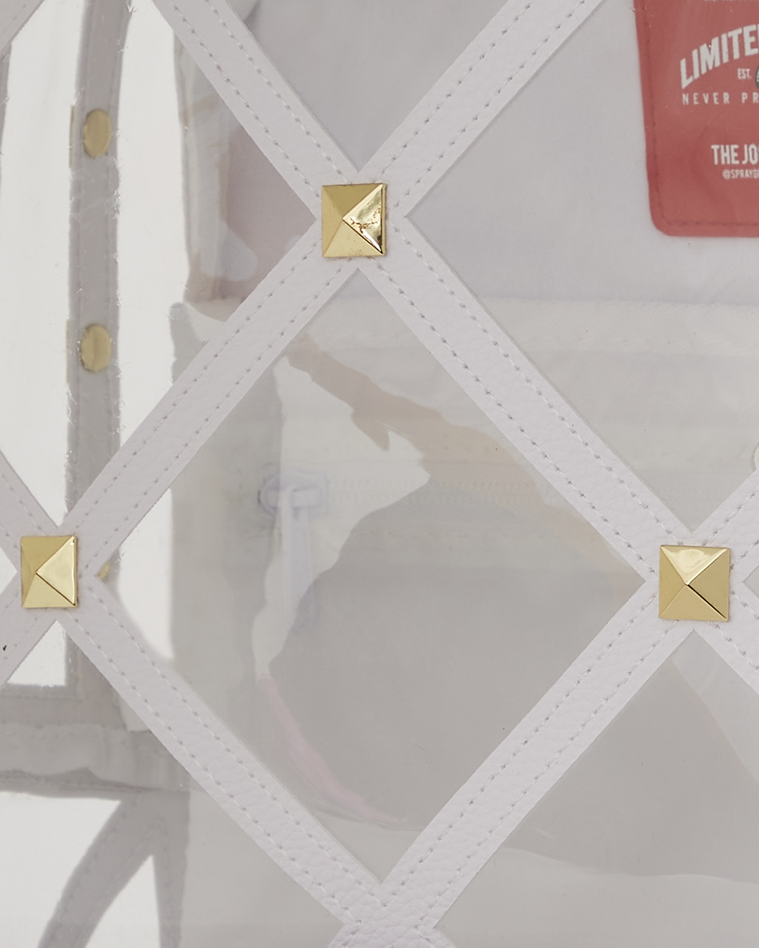 Cut and sew clear vinyl + texturized faux leather with gold pyramid studs