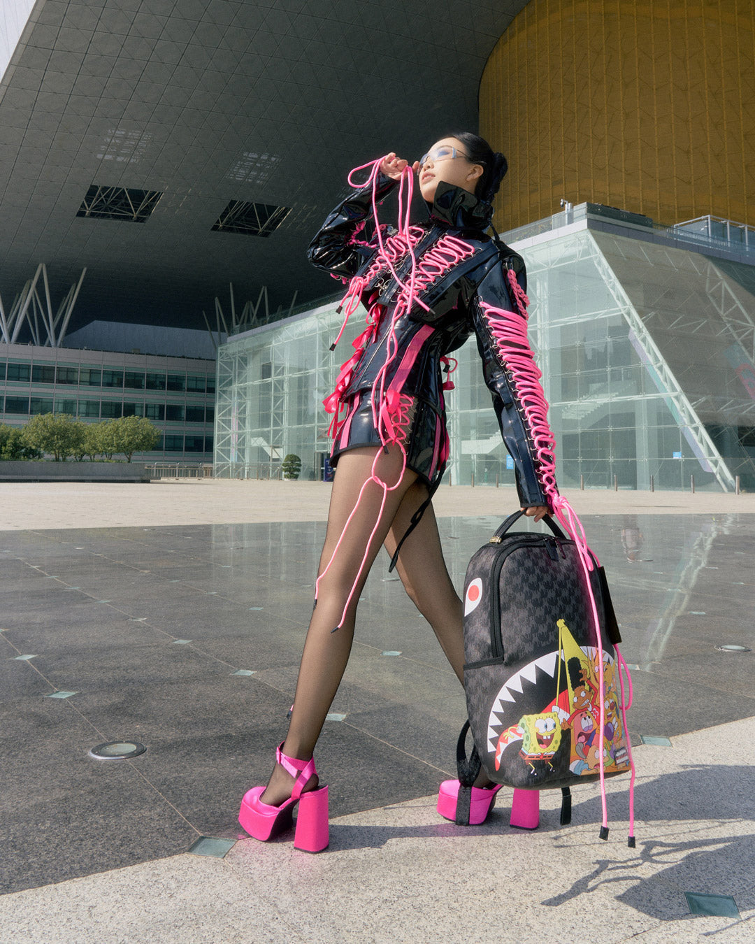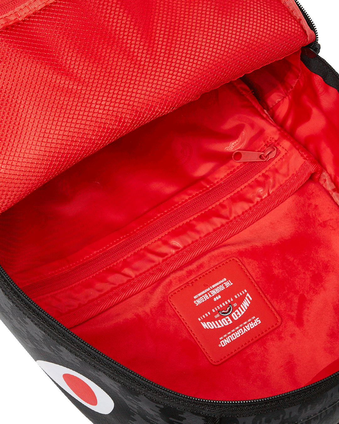 Dimensions: 18' x 6' x 11.5' • Front zipper pocket • Side pockets • Zippered Stash pocket • Separate velour sunglass compartment • Ergonomic mesh back padding • Adjustable Straps for custom sizing • Gold zippers with metal hardware • Metal 'Sprayground Authentic' badge • Slide through back sleeve connects to carry-on luggage to free your hands