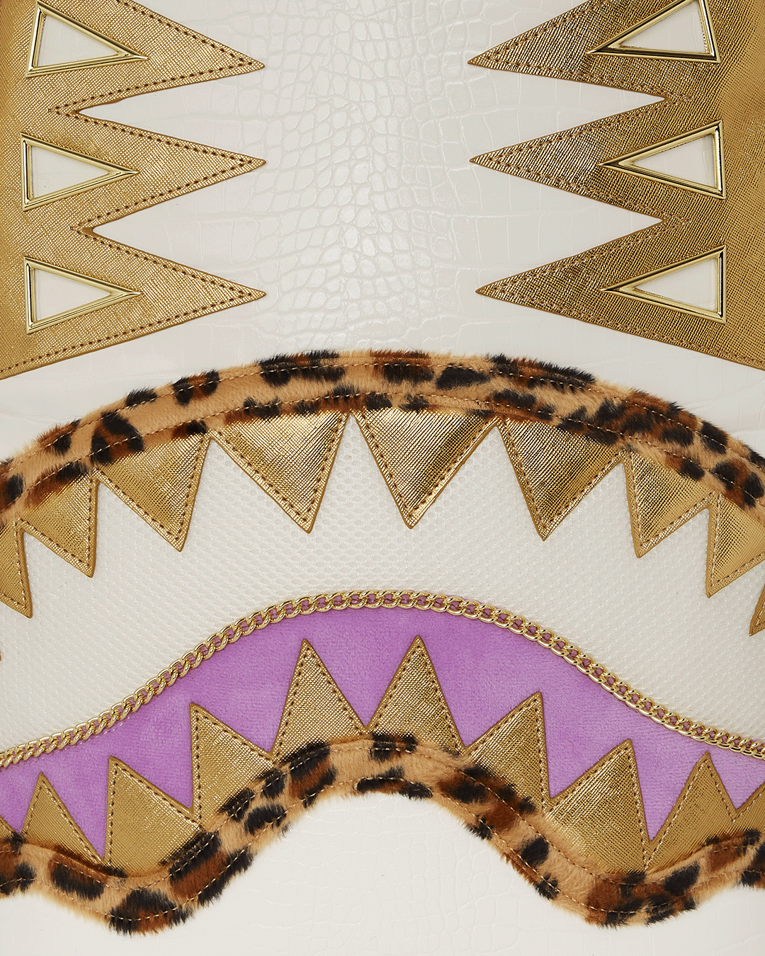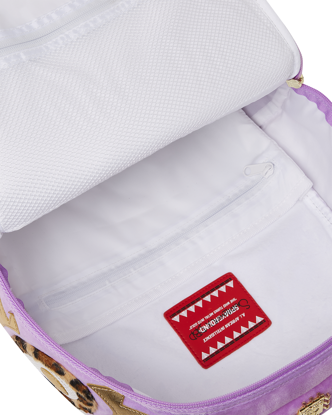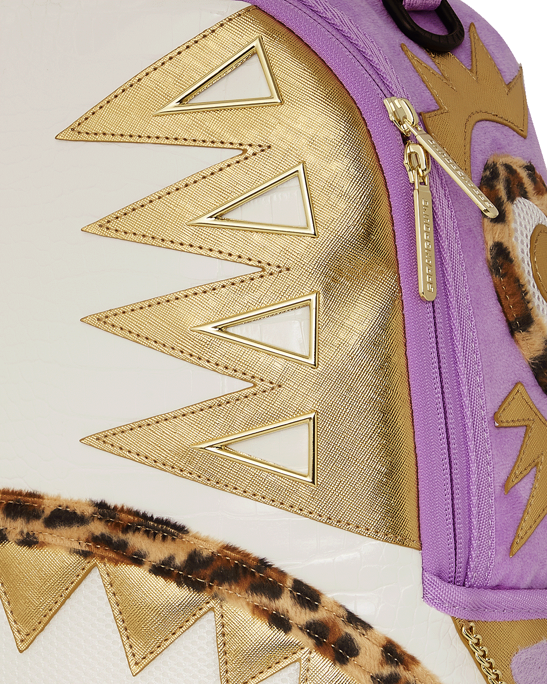 Dimensions: 18' x 6' x 11.5' • Front zipper pocket • Side pockets • Zippered Stash pocket • Separate velour sunglass compartment • Ergonomic mesh back padding • Adjustable Straps for custom sizing • Gold zippers with metal hardware • Metal 'Sprayground Authentic' badge • Slide through back sleeve connects to carry-on luggage to free your hands
