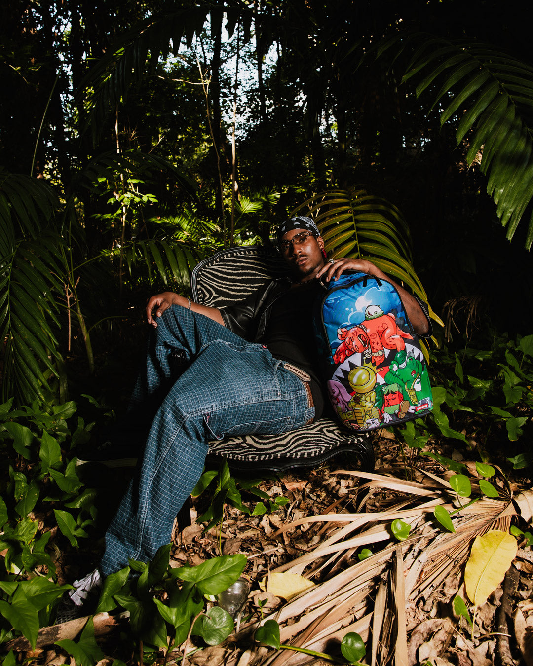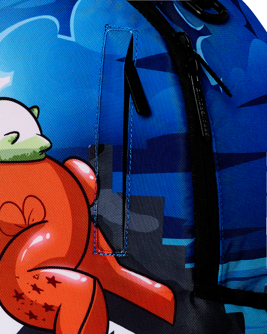 Dimensions: 18' x 6' x 11.5' • Front zipper pocket • Side pockets • Zippered Stash pocket • Separate velour sunglass compartment • Ergonomic mesh back padding • Adjustable Straps for custom sizing • Gold zippers with metal hardware • Metal 'Sprayground Authentic' badge • Slide through back sleeve connects to carry-on luggage to free your hands