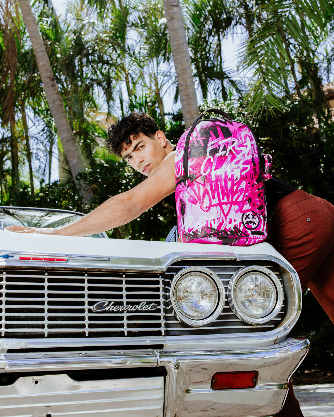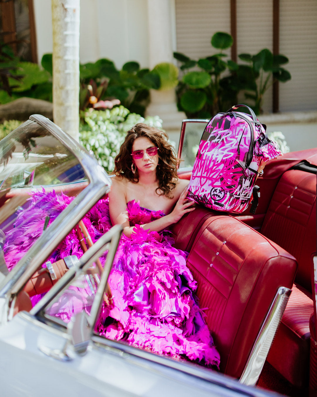 Dimensions: 18' x 6' x 11.5' • Front zipper pocket • Side pockets • Zippered Stash pocket • Separate velour sunglass compartment • Ergonomic mesh back padding • Adjustable Straps for custom sizing • Gold zippers with metal hardware • Metal 'Sprayground Authentic' badge • Slide through back sleeve connects to carry-on luggage to free your hands