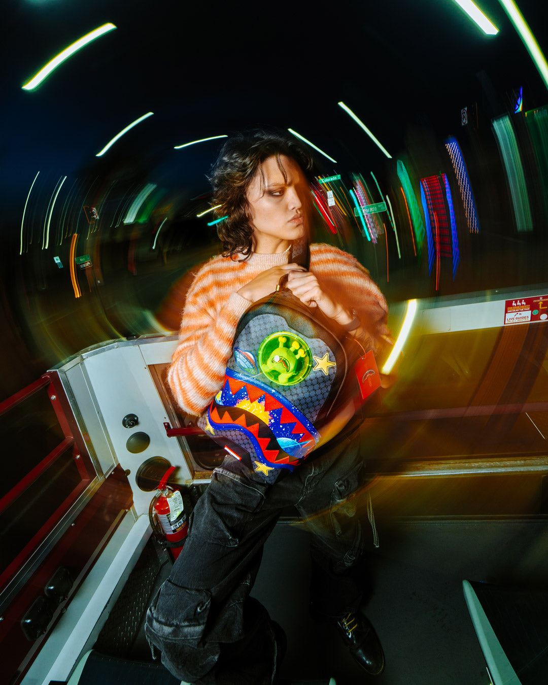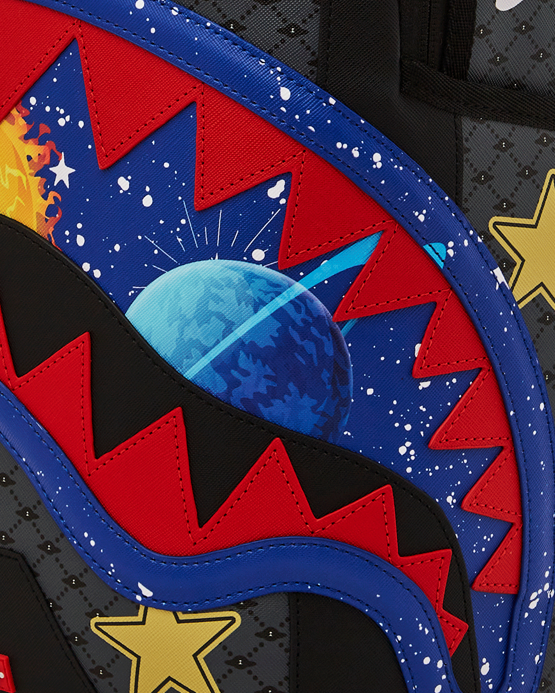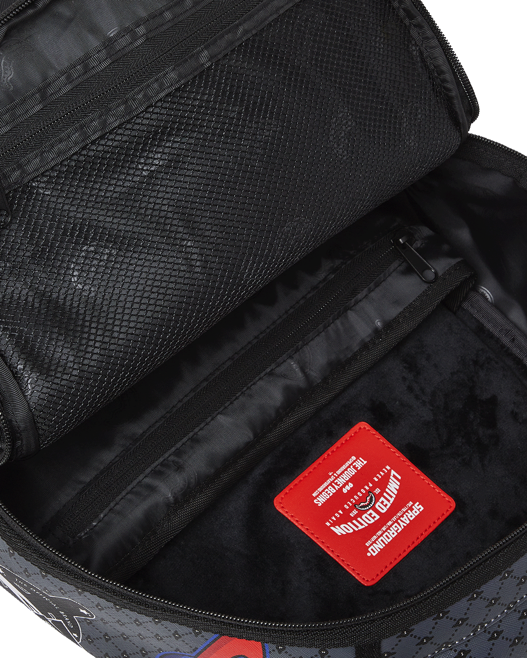 Dimensions: 18' x 6' x 11.5' • Front zipper pocket • Side pockets • Zippered Stash pocket • Separate velour sunglass compartment • Ergonomic mesh back padding • Adjustable Straps for custom sizing • Gold zippers with metal hardware • Metal 'Sprayground Authentic' badge • Slide through back sleeve connects to carry-on luggage to free your hands