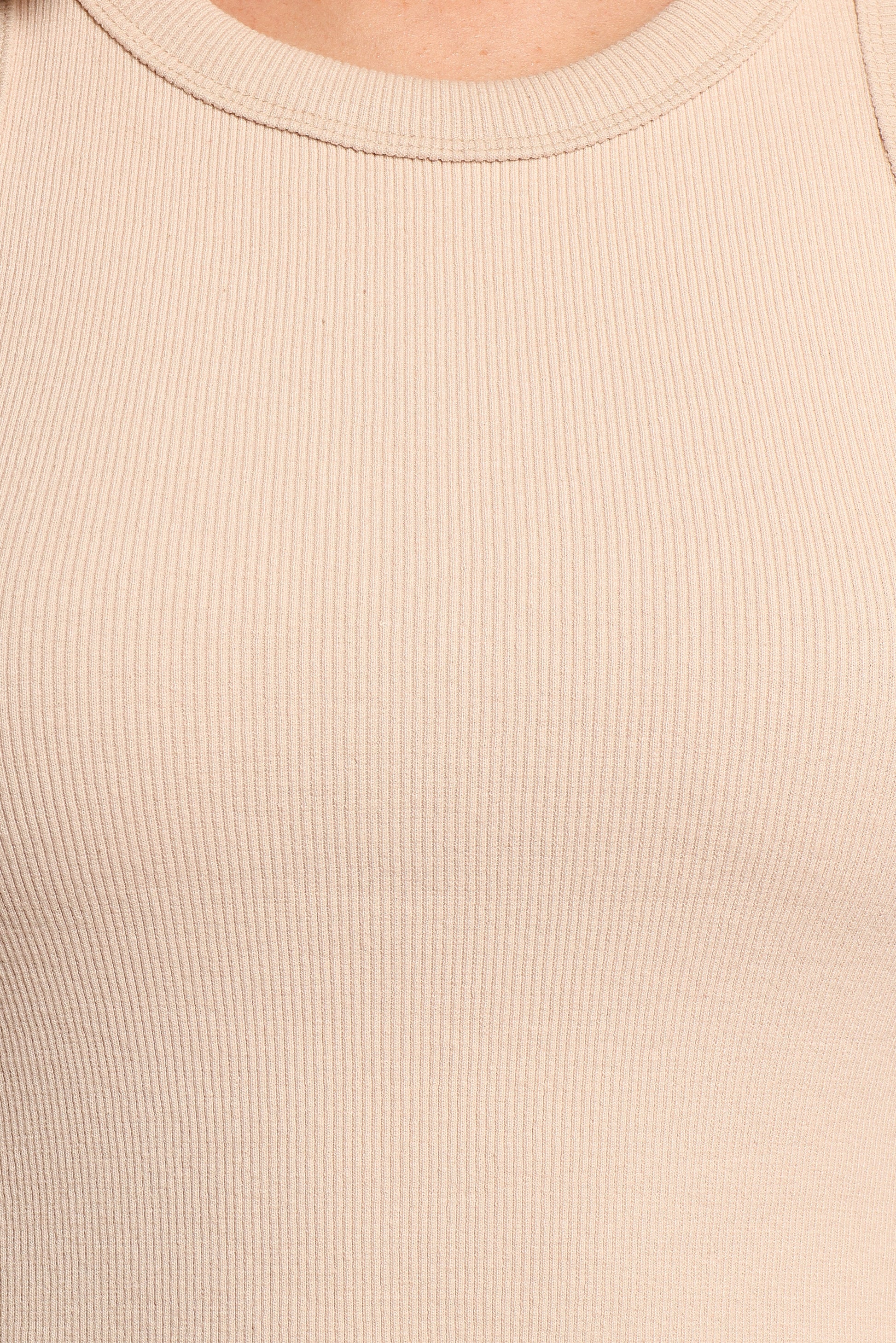 DETAILS Crafted from a ribbed stretch knit, this sleeveless bodycon silhouette is designed to hug your curves in all the right places, offering both comfort and style. The versatile midi length and round neckline make it perfect for layering or wearing as is, while the subtle yet striking side split adds just the right hint of edge.