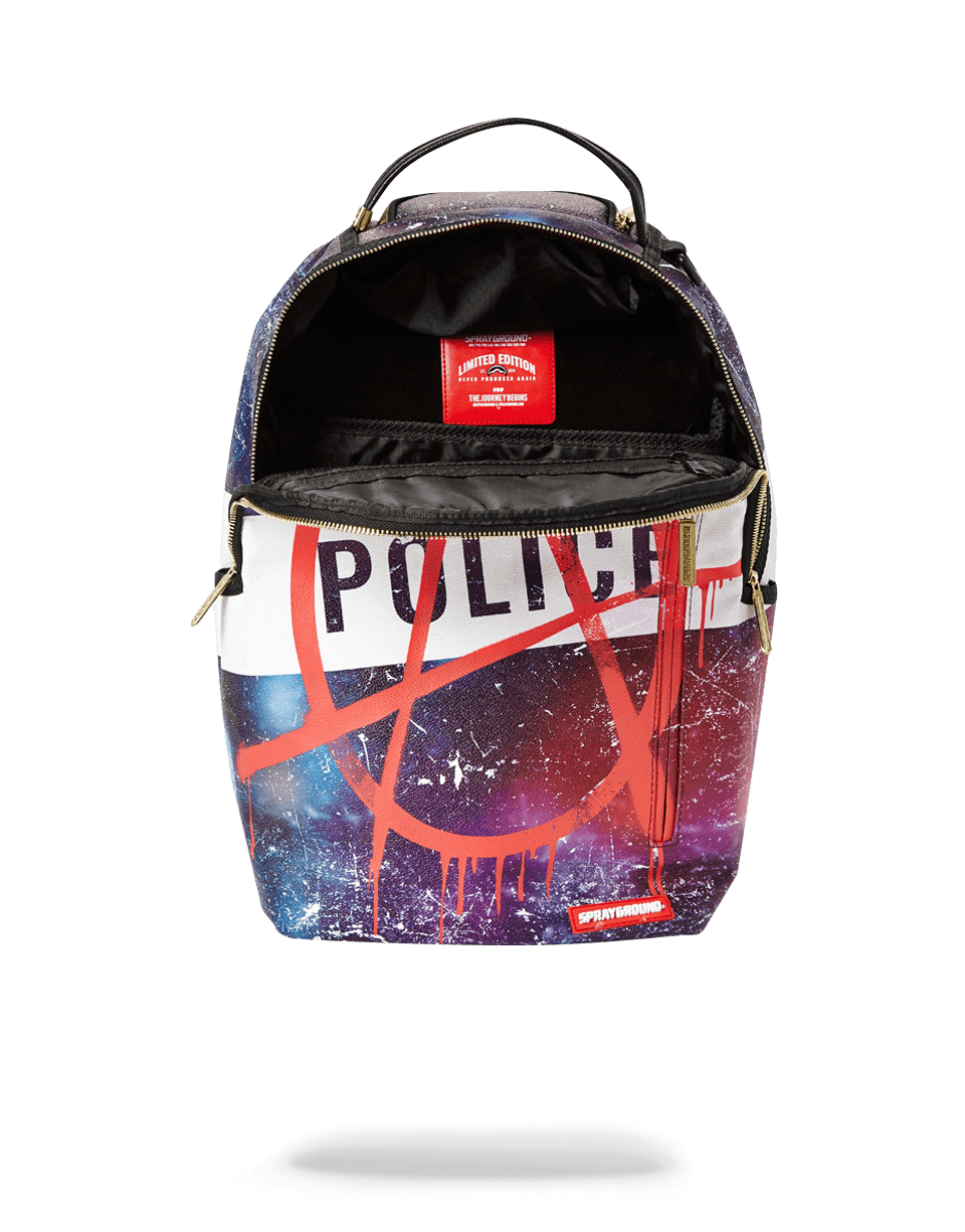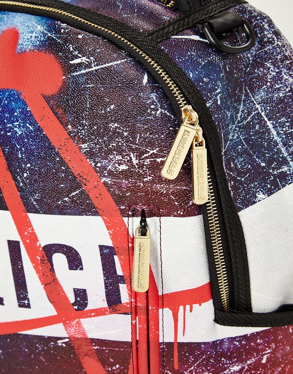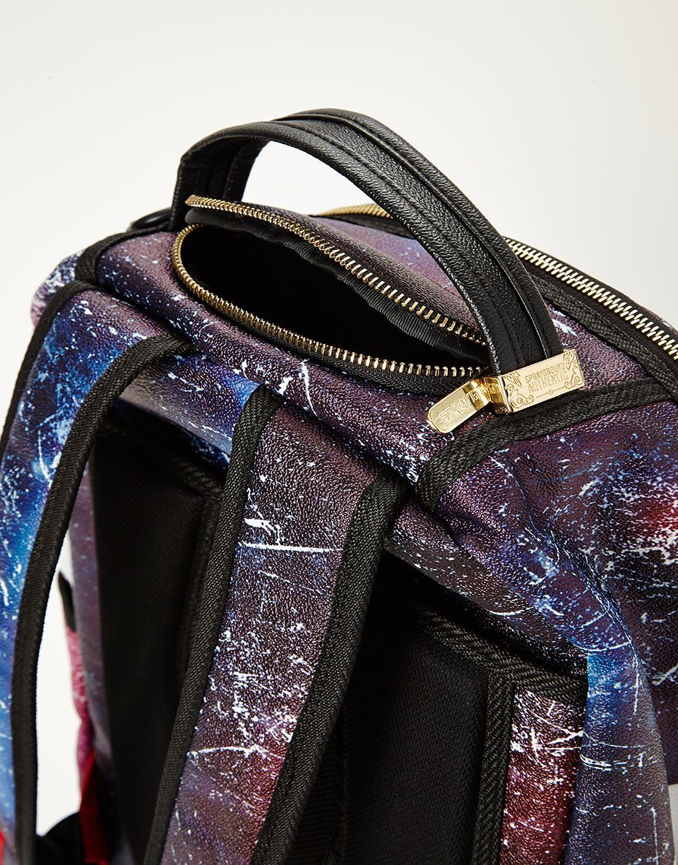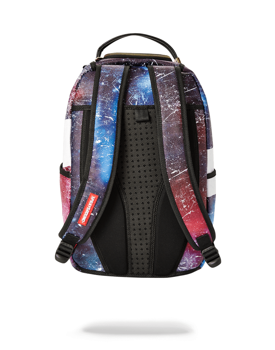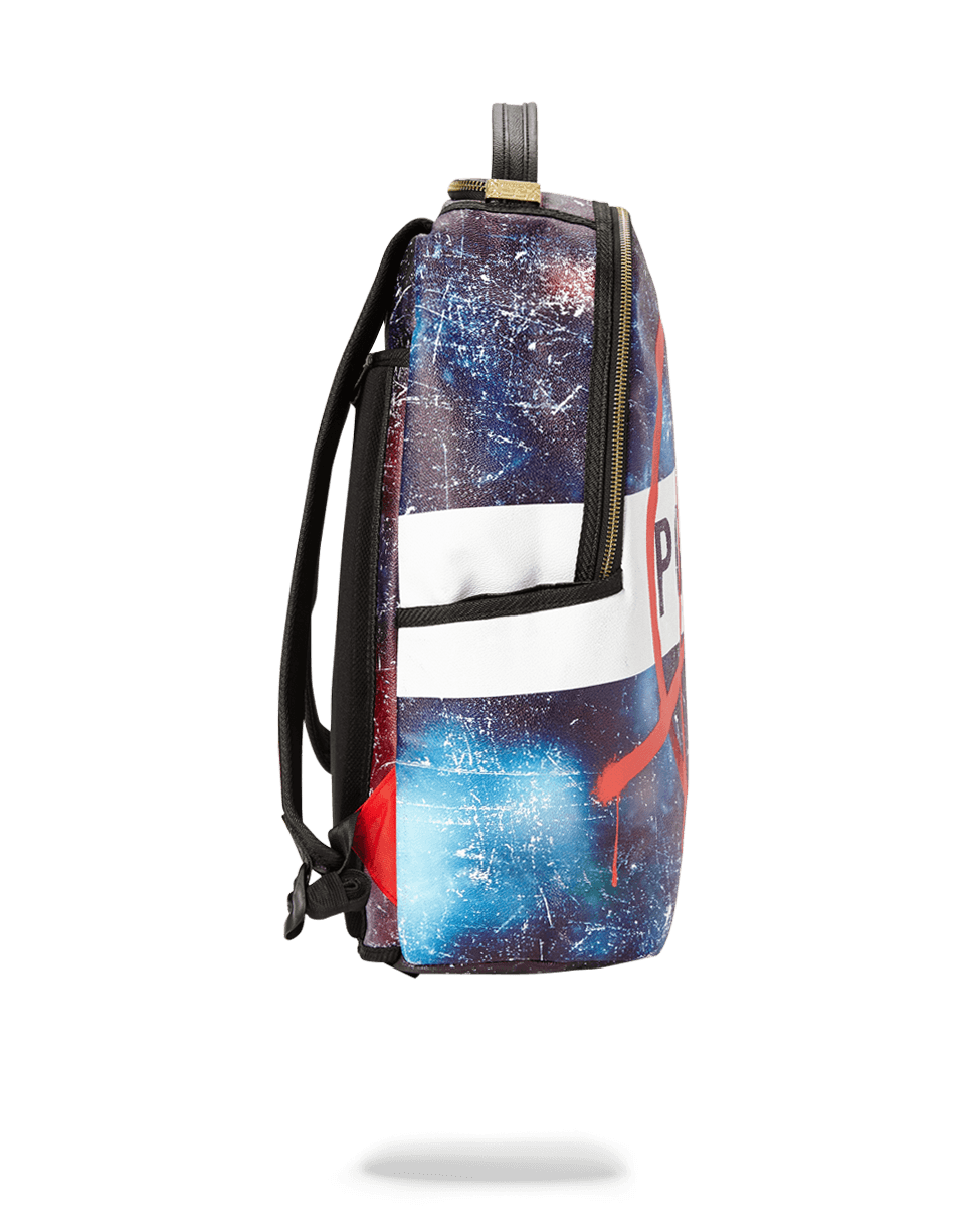 ExteriorDimensions: 18' x 6' x 11.5' ∙ Front zipper pocket ∙ Side pockets ∙ Zippered Stash pocket ∙ Ergonomic mesh back padding ∙ Adjustable Straps for custom sizing ∙ Nylon Zippers with Metal Hardware ∙ Metal 'Sprayground Authentic' badge ∙ Slide through back sleeve connects to Carry on luggage to free your hands