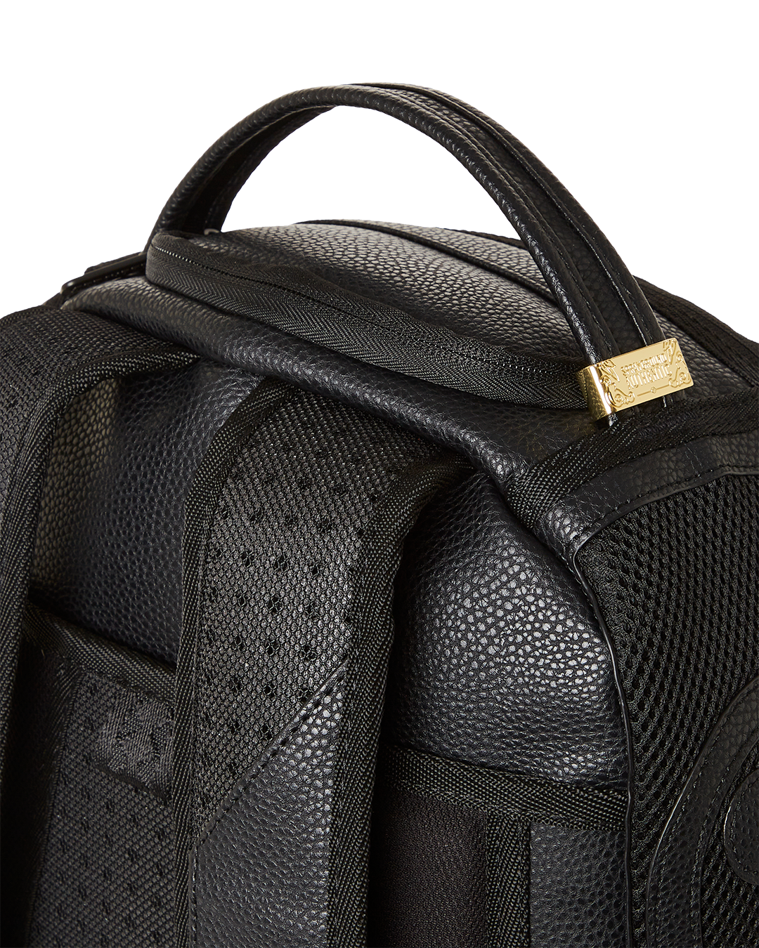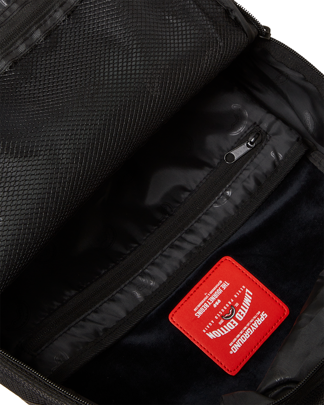 Dimensions: 18' x 6' x 11.5' • Front zipper pocket • Side pockets • Zippered Stash pocket • Separate velour sunglass compartment • Ergonomic mesh back padding • Adjustable Straps for custom sizing • Gold zippers with metal hardware • Metal 'Sprayground Authentic' badge • Slide through back sleeve connects to carry-on luggage to free your hands