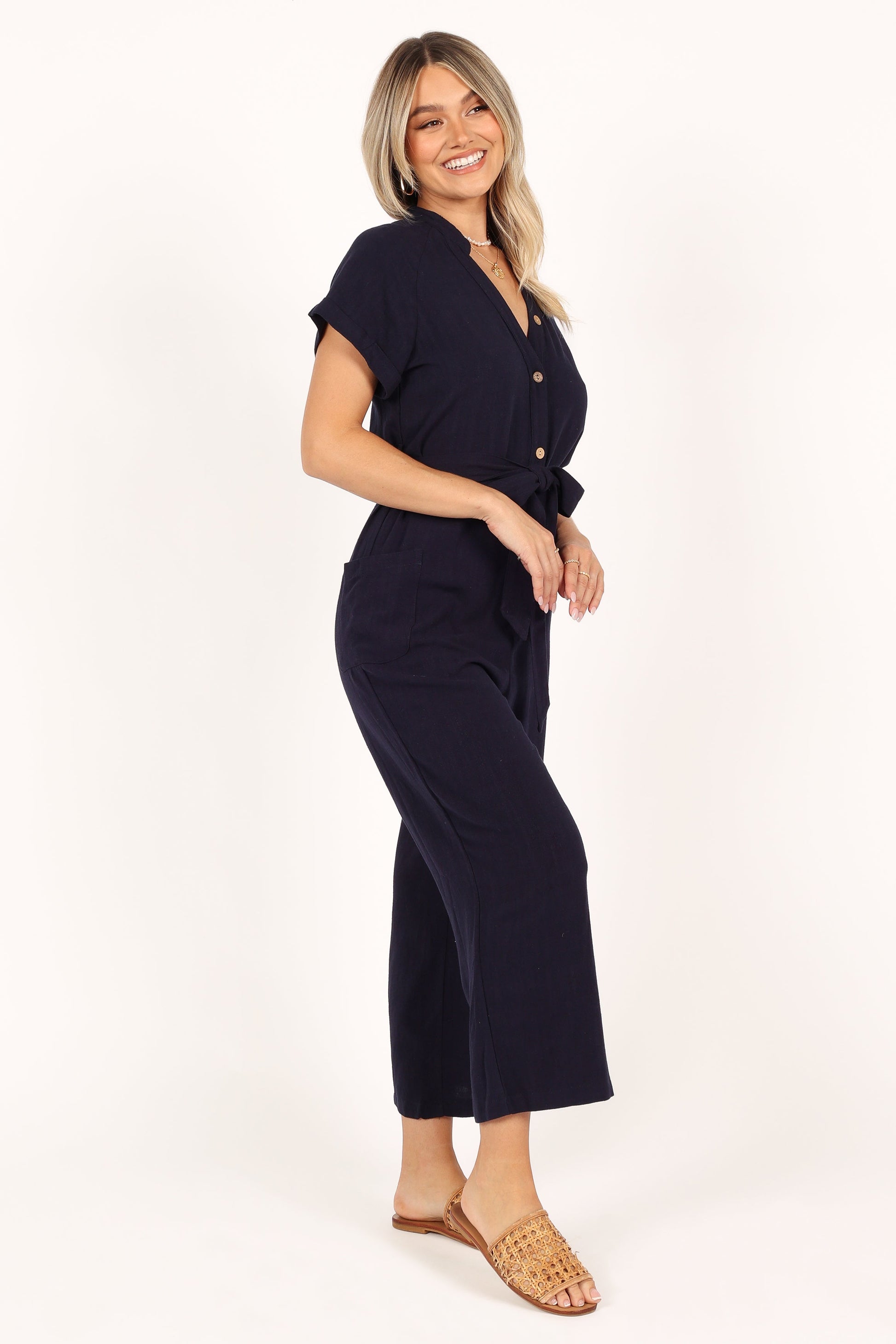 DETAILS This jumpsuit is the perfect easy to wear staple for your wardrobe. With a v neckline, short sleeves, front functional button close, front functional pockets and belt loops, you'll be ready for whatever comes your way. The detachable waist tie gives you the option of cinching in your waist for when you want that extra flattering silhouette.