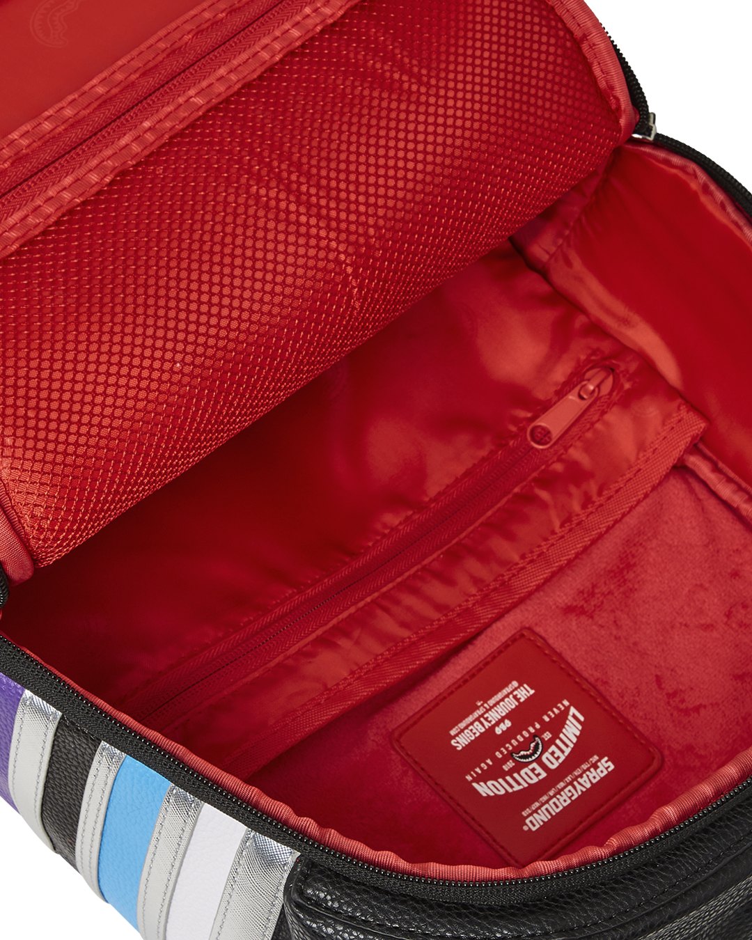 Dimensions: 18' x 6' x 11.5' • Front zipper pocket • Side pockets • Zippered Stash pocket • Separate velour sunglass compartment • Ergonomic mesh back padding • Adjustable Straps for custom sizing • Gold zippers with metal hardware • Metal 'Sprayground Authentic' badge • Slide through back sleeve connects to carry-on luggage to free your hands