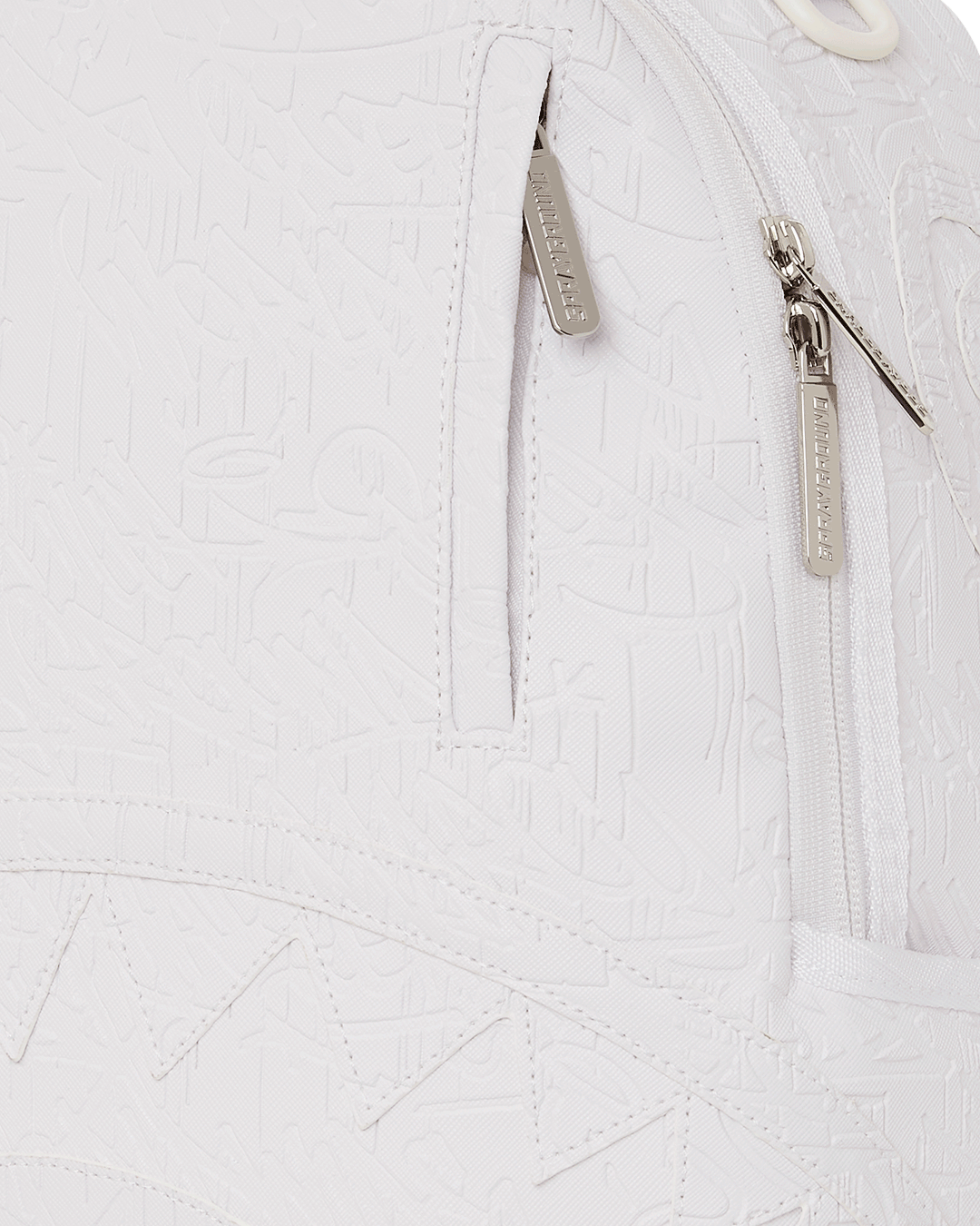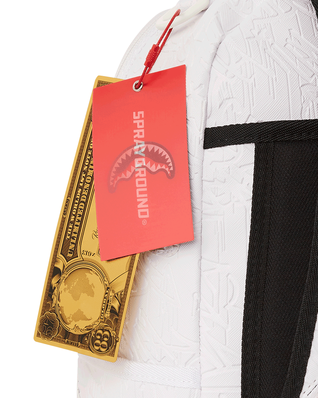 Dimensions: 18' x 6' x 11.5' • Front zipper pocket • Side pockets • Zippered Stash pocket • Separate velour sunglass compartment • Ergonomic mesh back padding • Adjustable Straps for custom sizing • Gold zippers with metal hardware • Metal 'Sprayground Authentic' badge • Slide through back sleeve connects to carry-on luggage to free your hands