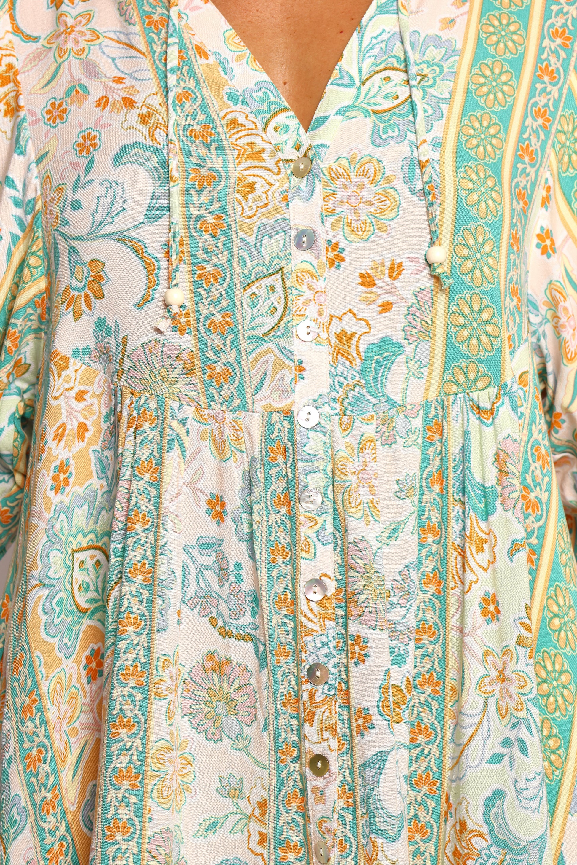 DETAILS Featuring a graceful v-neckline adorned with a delicate tie and bead detail, it adds just the right touch of elegance. The mid-length sleeves, complete with elasticised cuffs and charming beaded drawstring ties, offer both comfort and a dash of boho flair.