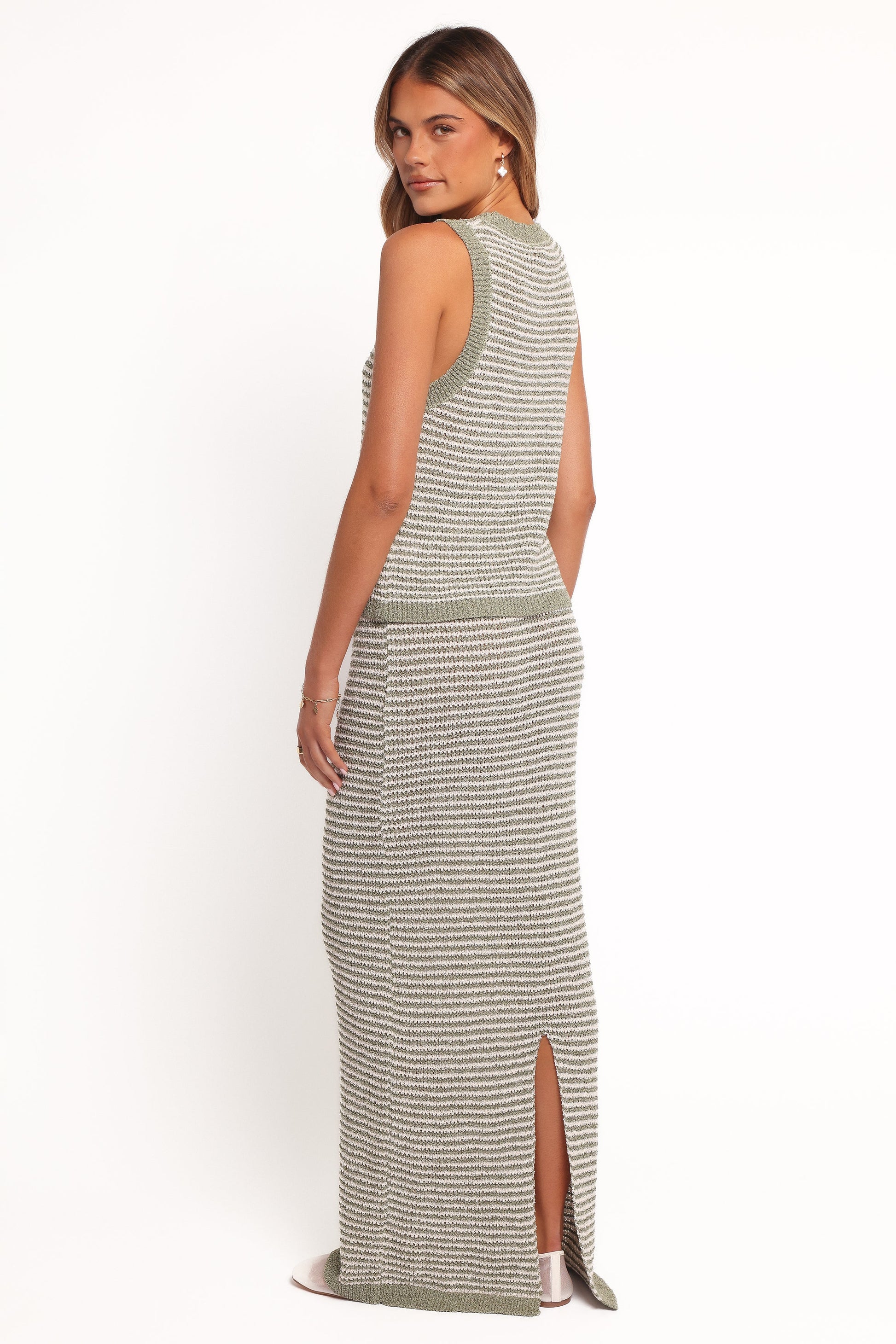 DETAILS Effortless style meets comfort with the Arella Knit Skirt in Sage/Cream. Featuring a high-rise design and an elegant maxi length, this skirt flatters every silhouette while keeping you chic and comfortable.