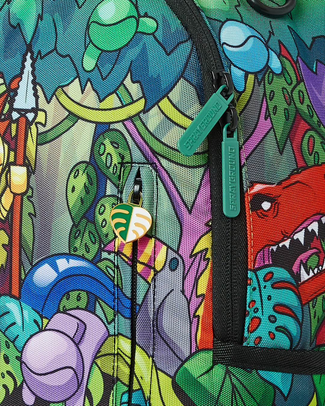 Dimensions: 18' x 6' x 11.5' • Front zipper pocket • Side pockets • Zippered Stash pocket • Separate velour sunglass compartment • Ergonomic mesh back padding • Adjustable Straps for custom sizing • Gold zippers with metal hardware • Metal 'Sprayground Authentic' badge • Slide through back sleeve connects to carry-on luggage to free your hands