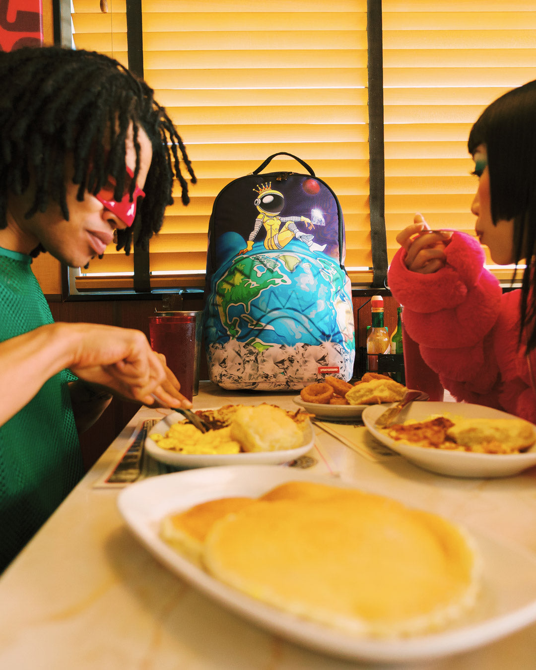 Dimensions: 18' x 6' x 11.5' • Front zipper pocket • Side pockets • Zippered Stash pocket • Separate velour sunglass compartment • Ergonomic mesh back padding • Adjustable Straps for custom sizing • Gold zippers with metal hardware • Metal 'Sprayground Authentic' badge • Slide through back sleeve connects to carry-on luggage to free your hands