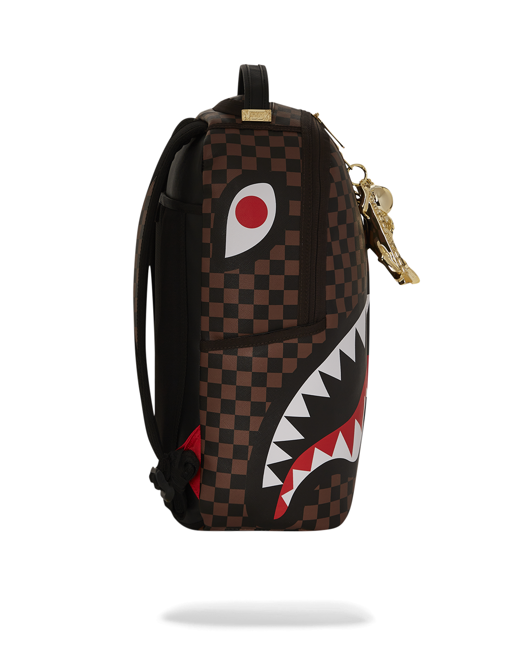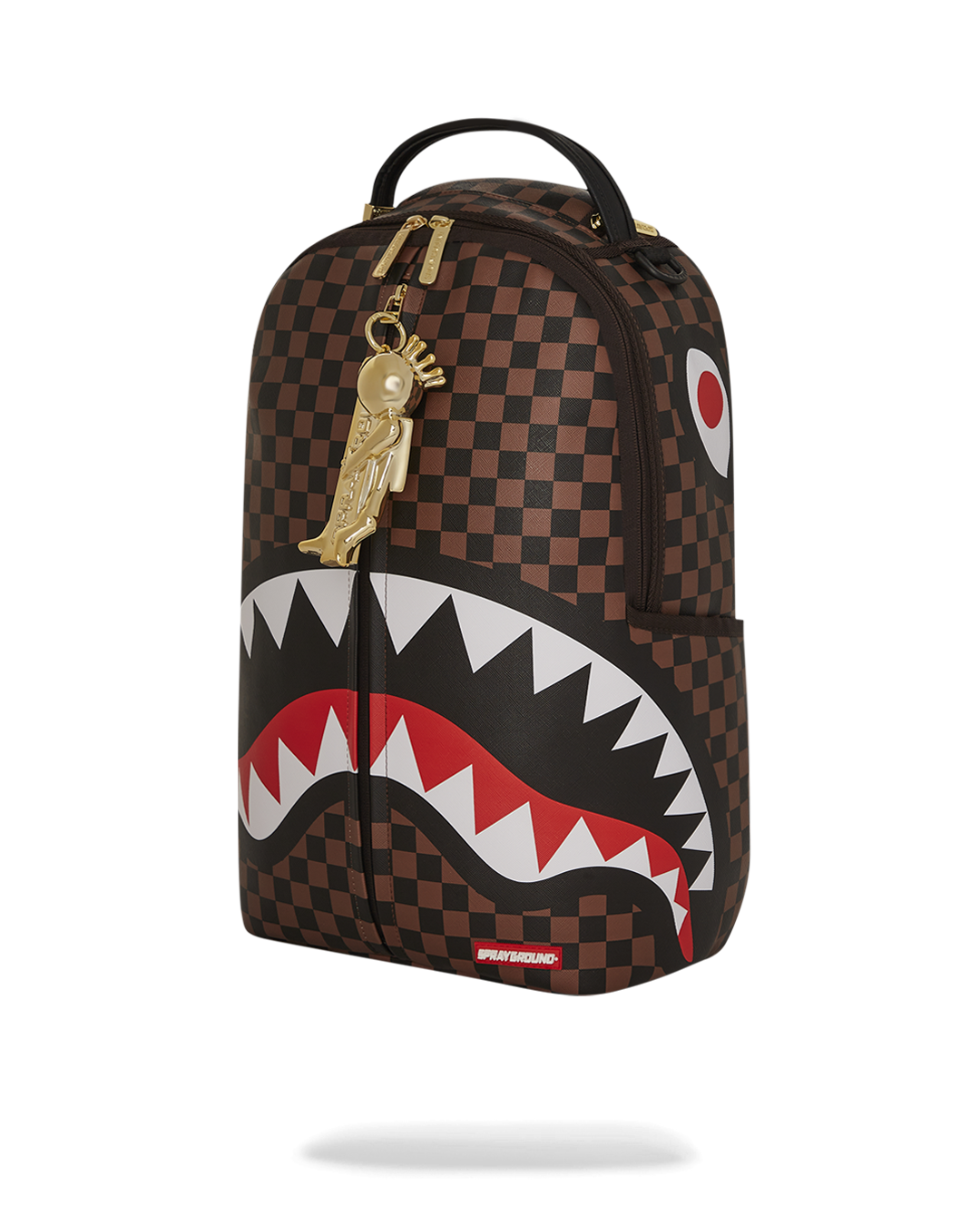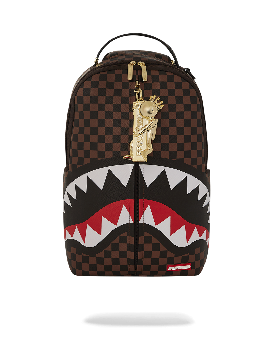 Dimensions: 18' x 6' x 11.5' • Front zipper pocket • Side pockets • Zippered Stash pocket • Separate velour sunglass compartment • Ergonomic mesh back padding • Adjustable Straps for custom sizing • Gold zippers with metal hardware • Metal 'Sprayground Authentic' badge • Slide through back sleeve connects to carry-on luggage to free your hands