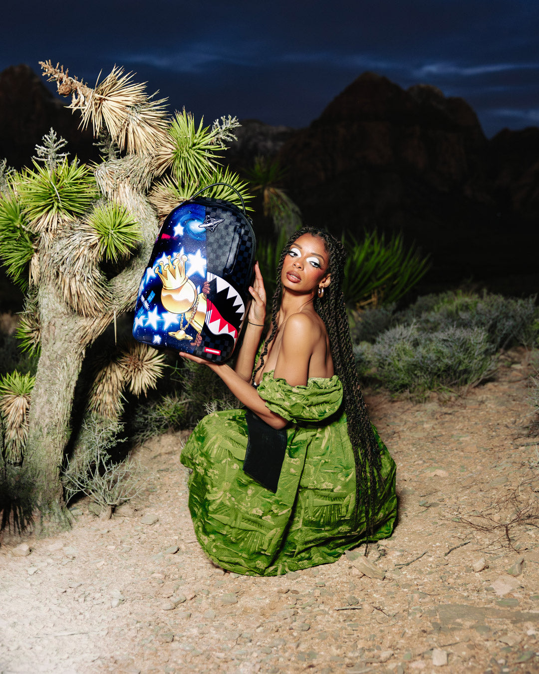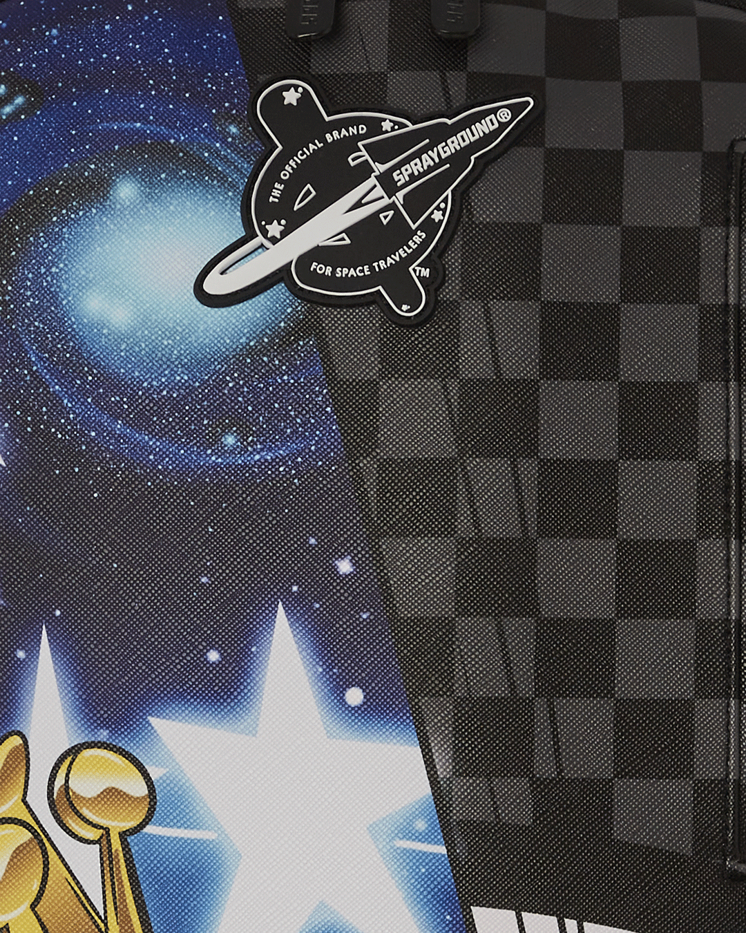 Dimensions: 18' x 6' x 11.5' • Front zipper pocket • Side pockets • Zippered Stash pocket • Separate velour sunglass compartment • Ergonomic mesh back padding • Adjustable Straps for custom sizing • Gold zippers with metal hardware • Metal 'Sprayground Authentic' badge • Slide through back sleeve connects to carry-on luggage to free your hands