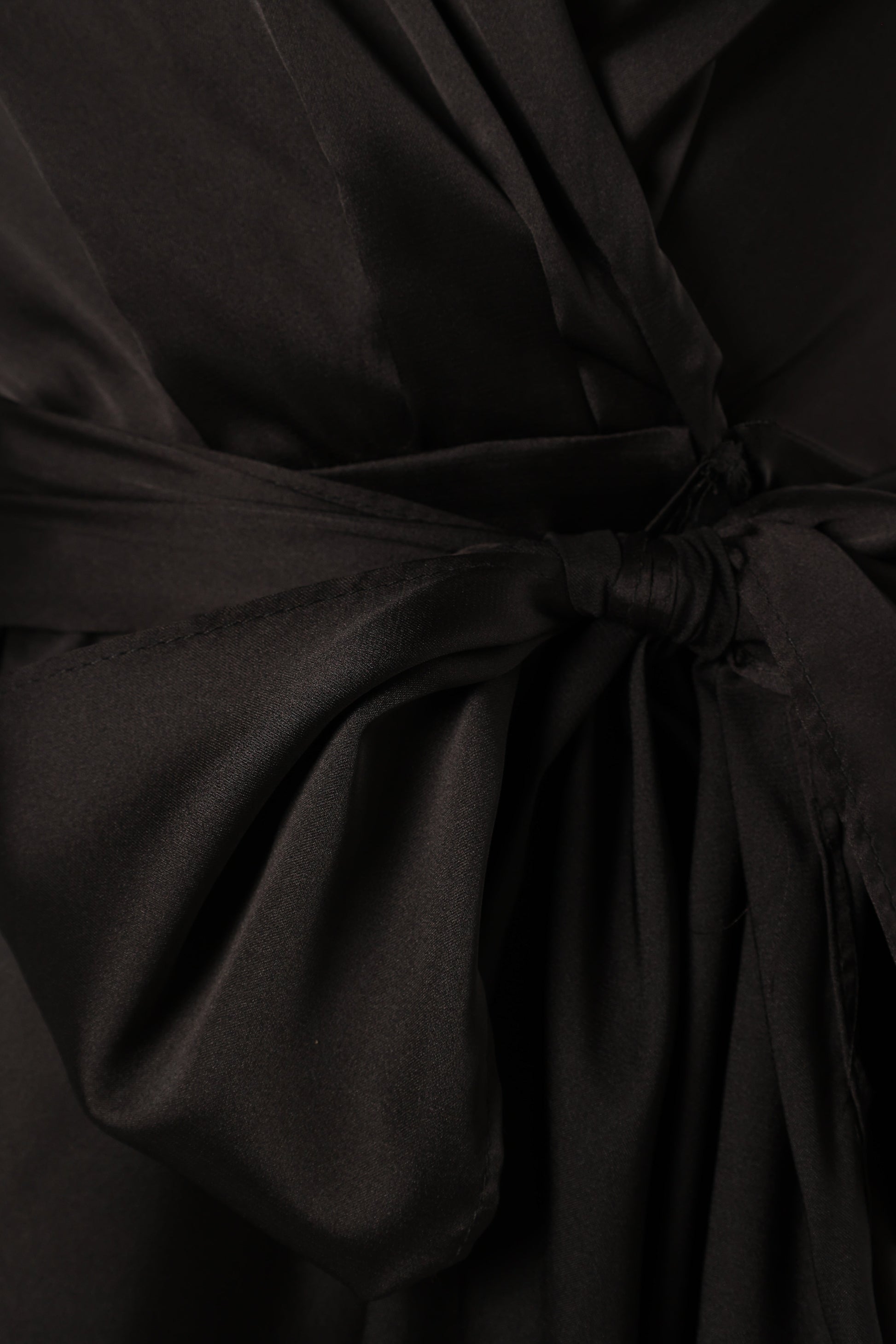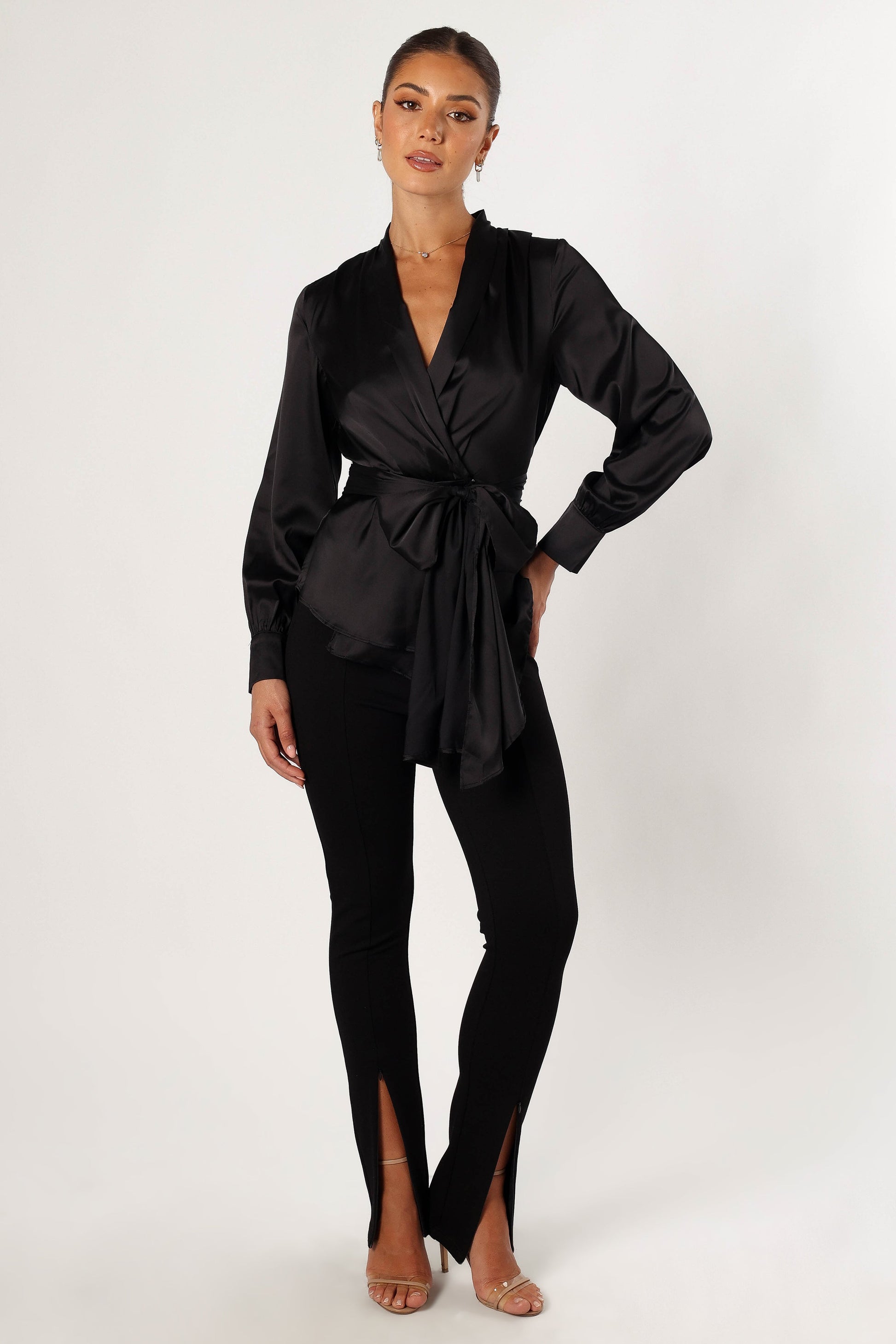 DETAILS Say hello to versatile and stylish fashion, with the Aydin Wrap Top! Crafted from a beautiful satin material that's both lightweight and incredibly comfortable. The peplum style top is perfect for creating an elegant silhouette, while the overlay neckline and long sleeves with button close cuffs give it a modern twist.