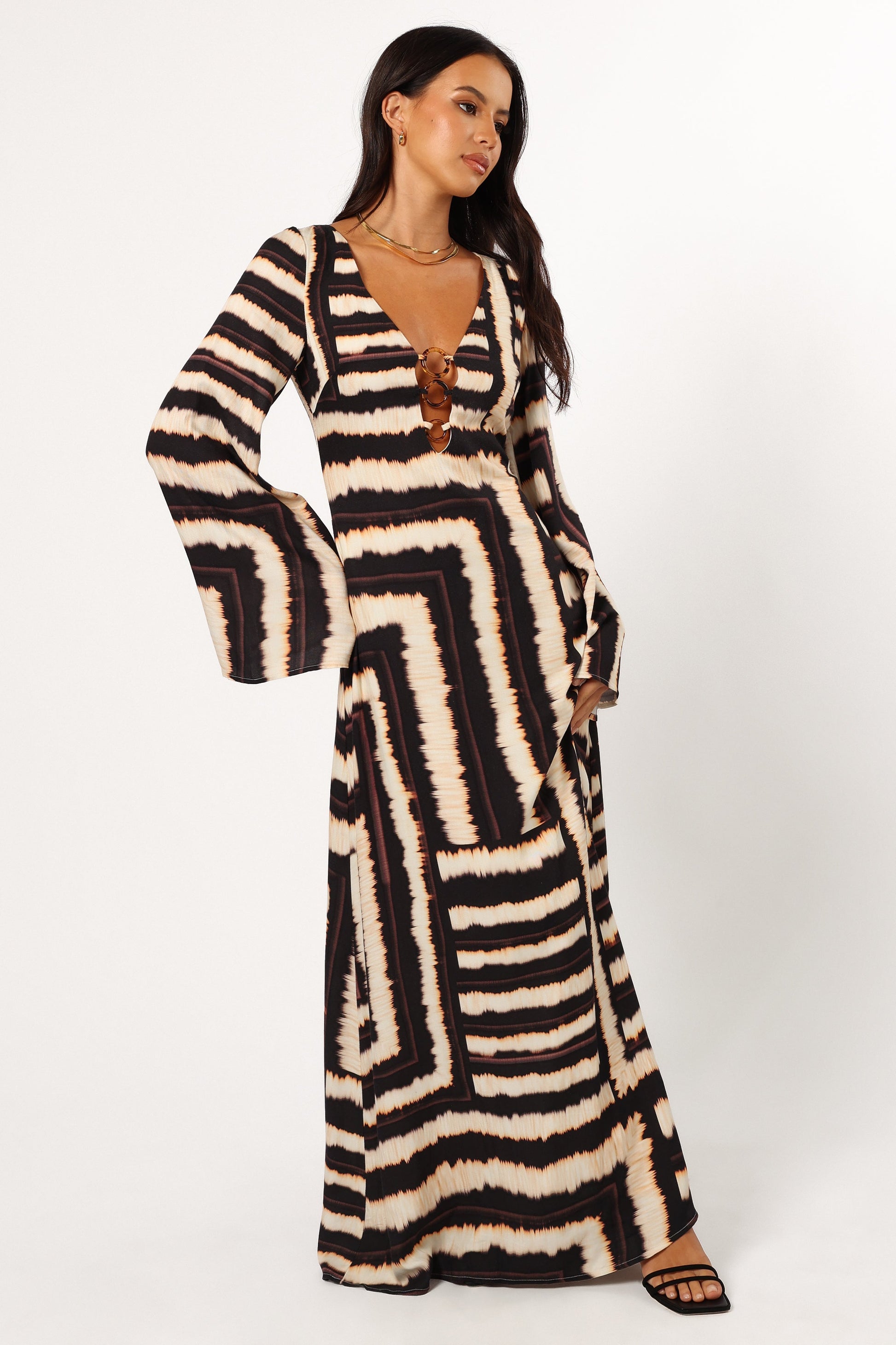 DETAILS This maxi dress is a must-have for any wardrobe. The tortoiseshell ring feature on front makes it stand out. Plus, its v neckline, long sleeves and open back design will make you look like a total dream!