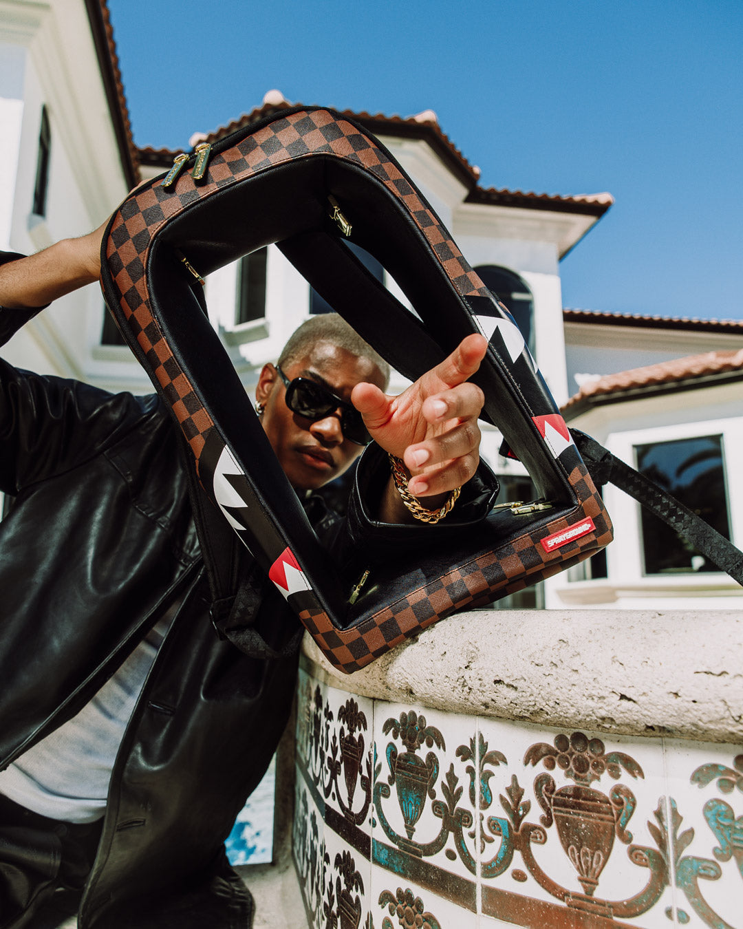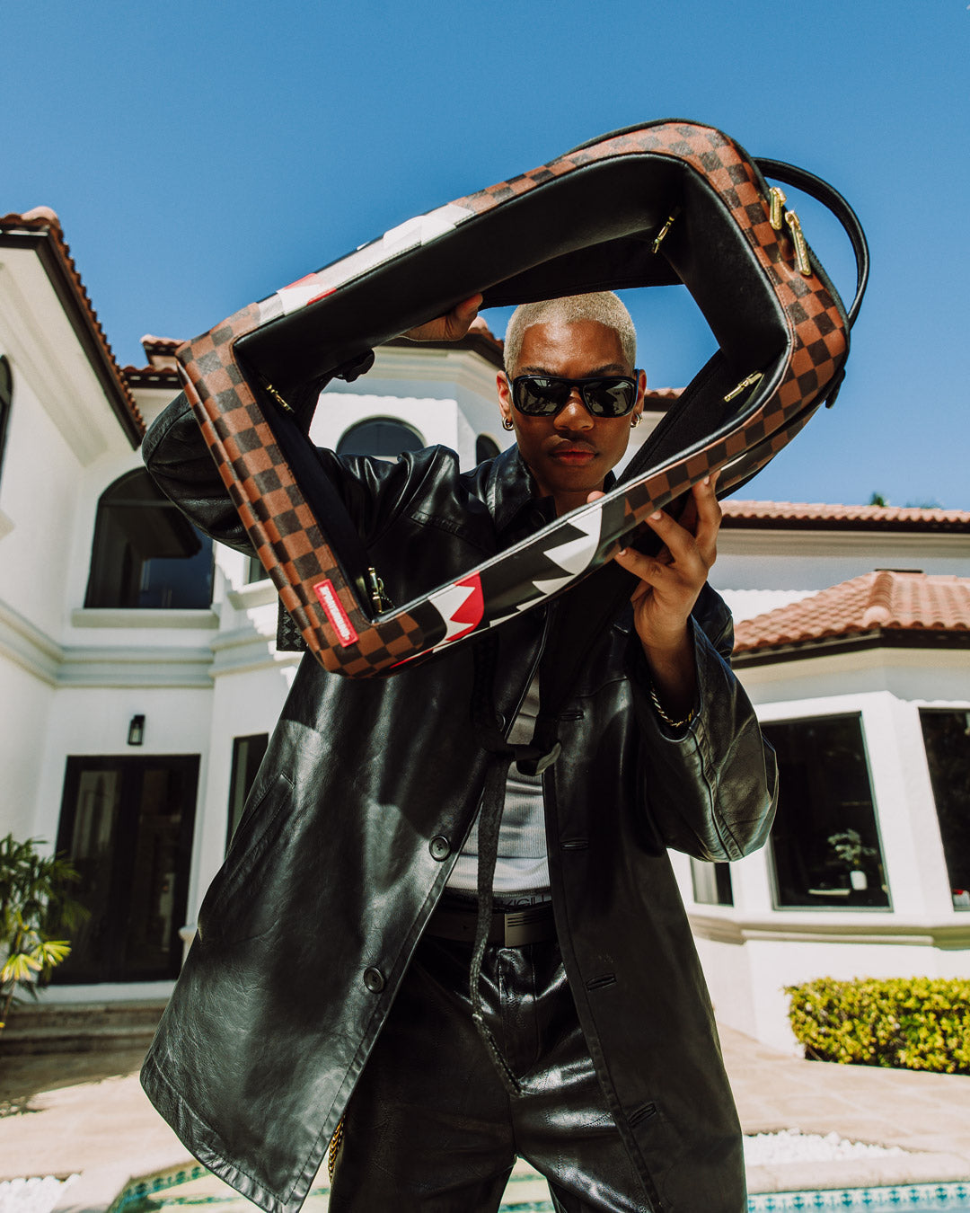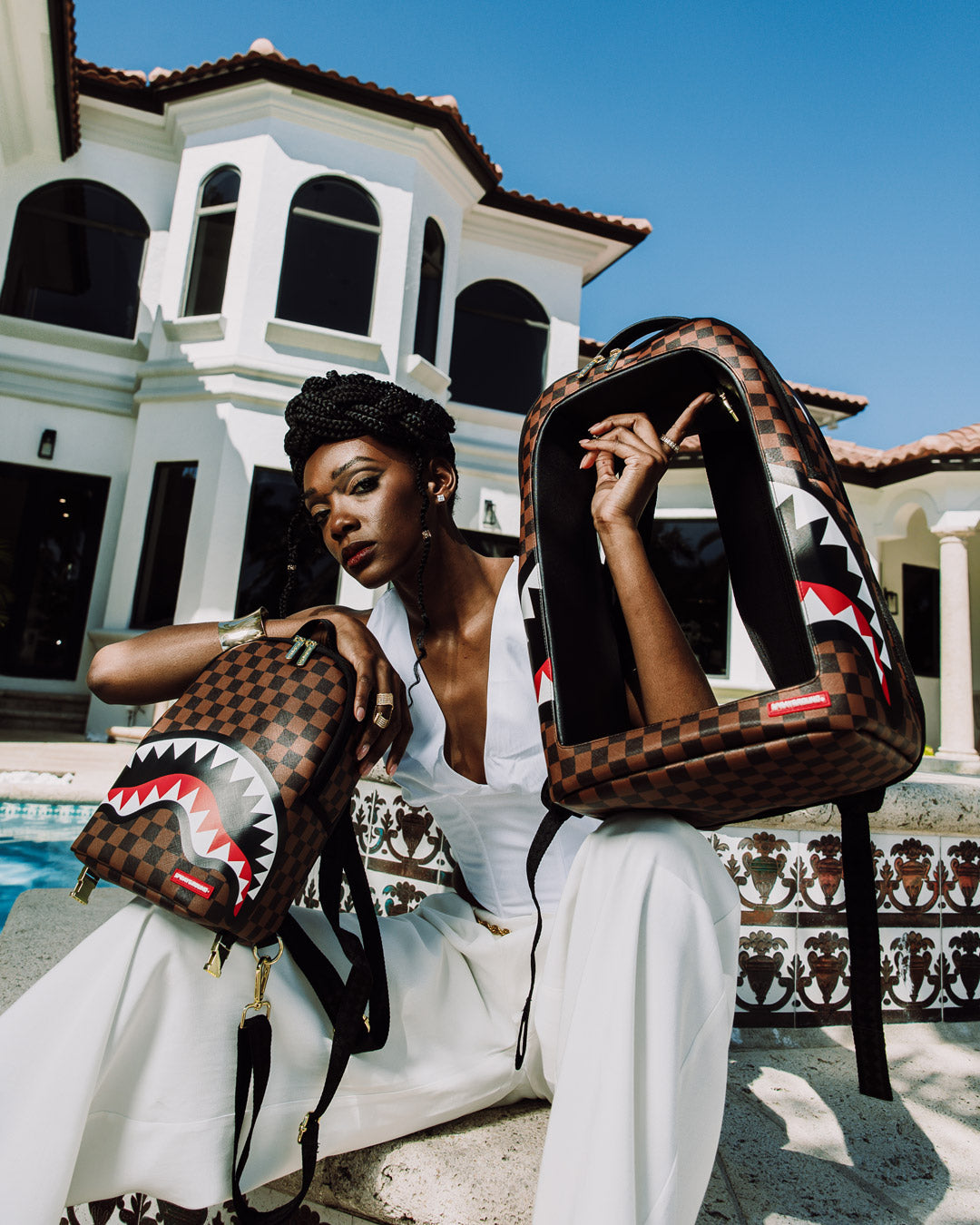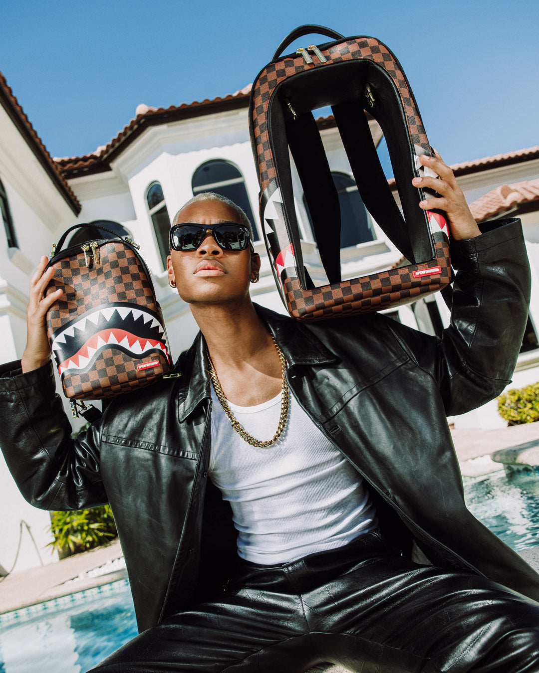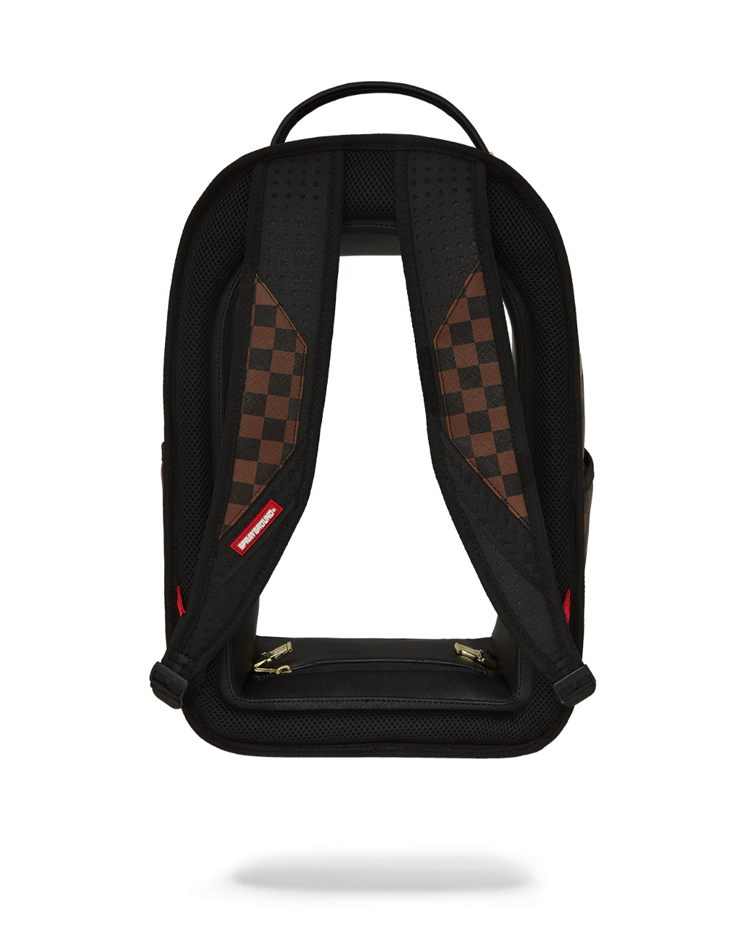 Dimensions: 18' x 6' x 11.5' • Front zipper pocket • Side pockets • Zippered Stash pocket • Separate velour sunglass compartment • Ergonomic mesh back padding • Adjustable Straps for custom sizing • Gold zippers with metal hardware • Metal 'Sprayground Authentic' badge • Slide through back sleeve connects to carry-on luggage to free your hands