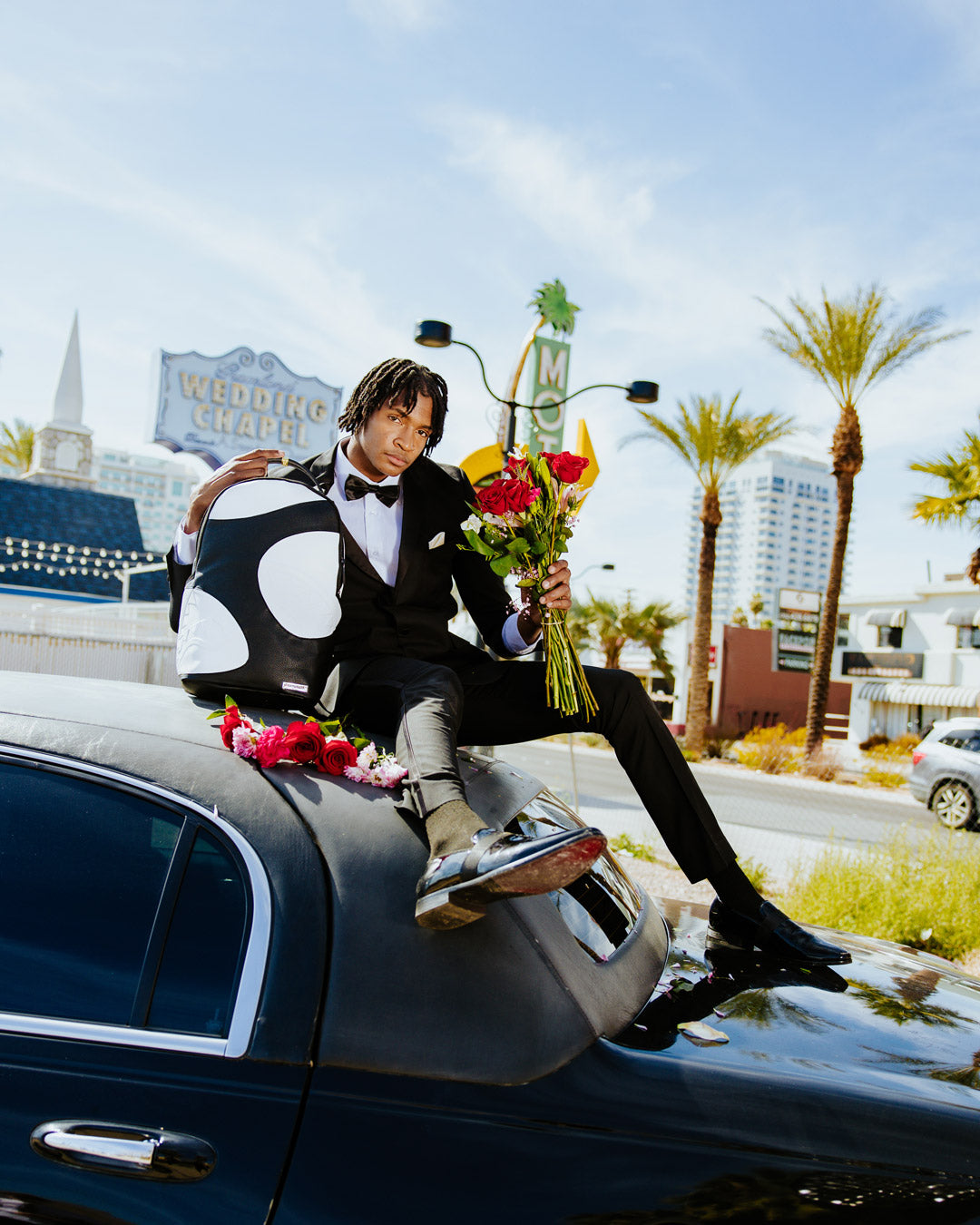 Dimensions: 18' x 6' x 11.5' • Front zipper pocket • Side pockets • Zippered Stash pocket • Separate velour sunglass compartment • Ergonomic mesh back padding • Adjustable Straps for custom sizing • Gold zippers with metal hardware • Metal 'Sprayground Authentic' badge • Slide through back sleeve connects to carry-on luggage to free your hands