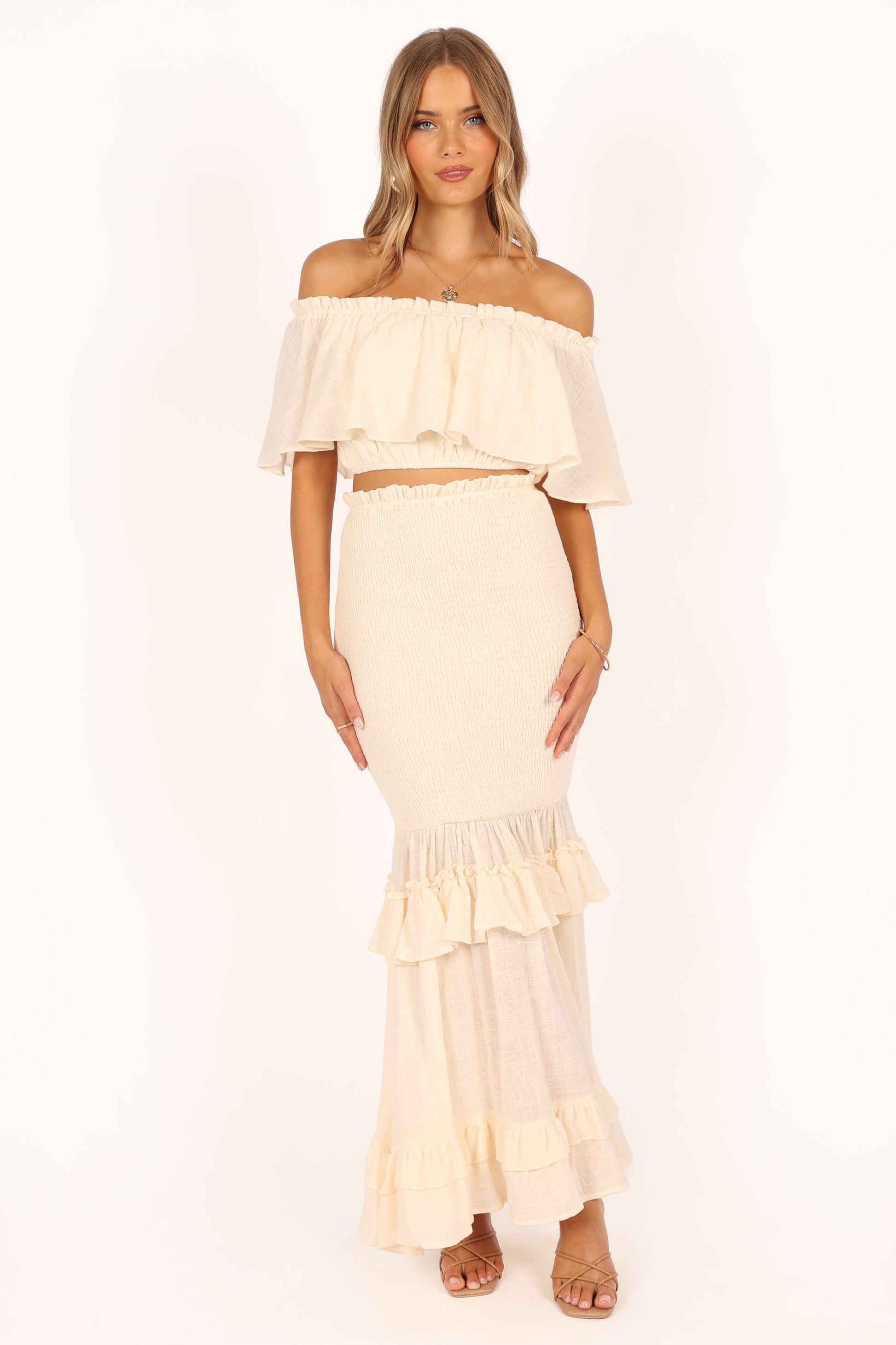DETAILS Make a statement in this stunning two-piece set! Featuring a cropped length top with an elasticised off the shoulder neckline and ruffle detail, plus peplum detailing to give you that extra feminine flair. The high waisted midi skirt is designed with an elasticated long waist band and tiered ruffle detail for added movement.