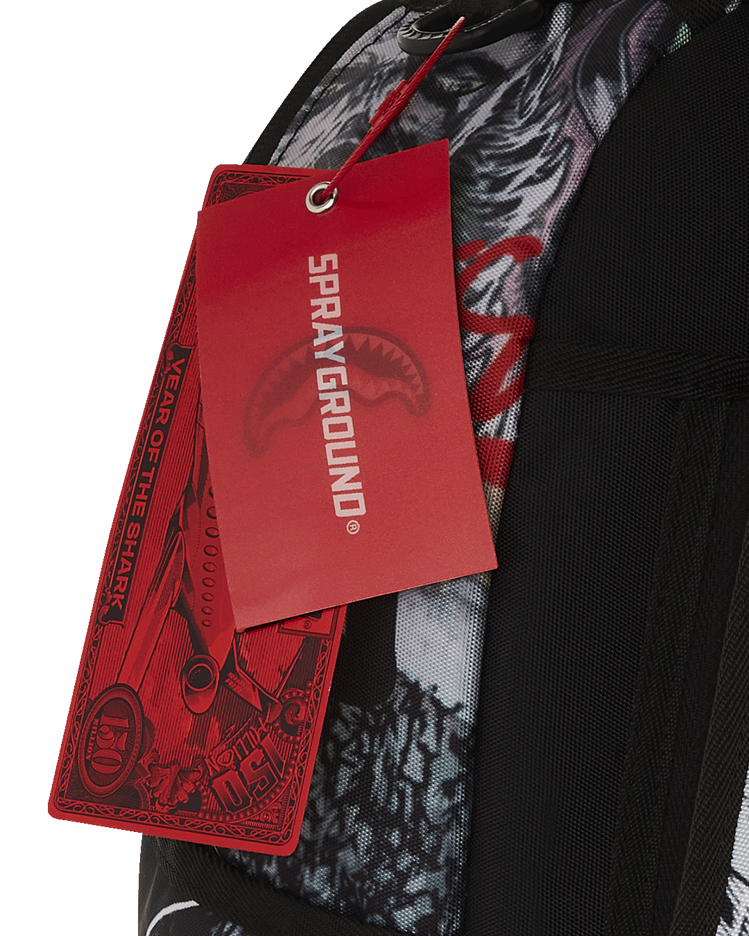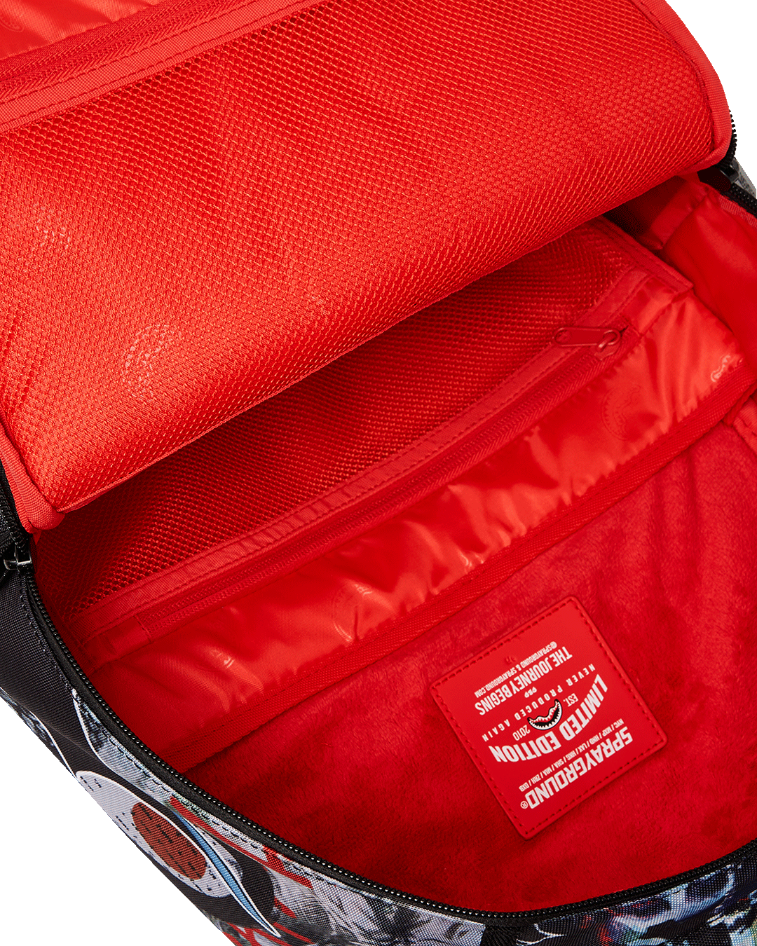 Dimensions: 18' x 6' x 11.5' • Front zipper pocket • Side pockets • Zippered Stash pocket • Separate velour sunglass compartment • Ergonomic mesh back padding • Adjustable Straps for custom sizing • Gold zippers with metal hardware • Metal 'Sprayground Authentic' badge • Slide through back sleeve connects to carry-on luggage to free your hands