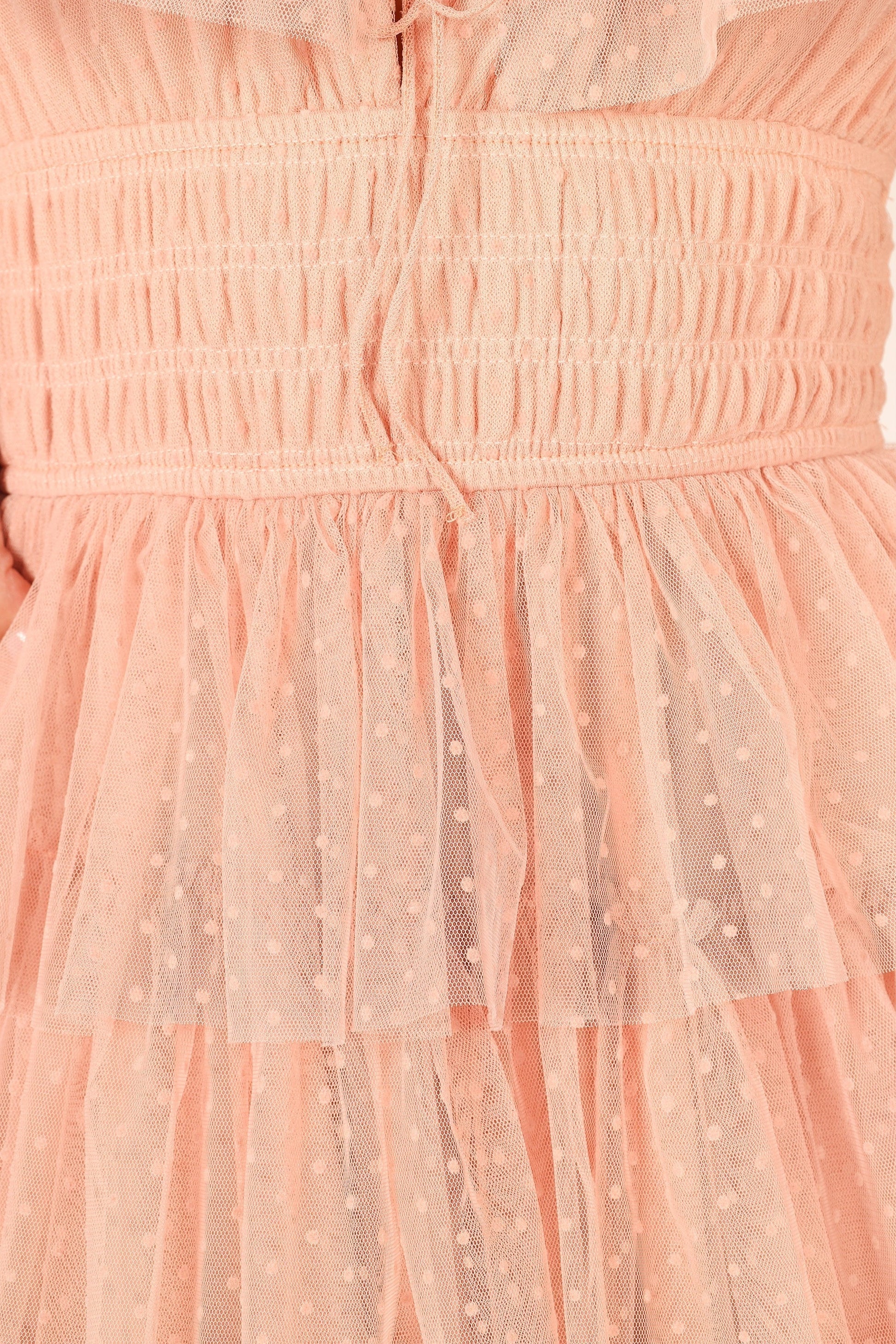 DETAILS Be the belle of the ball in this stunning tulle maxi dress! Featuring a square neckline with tie close, thin elasticised straps with ruffle detail and a front cut out on the bust, this dress is sure to turn heads.