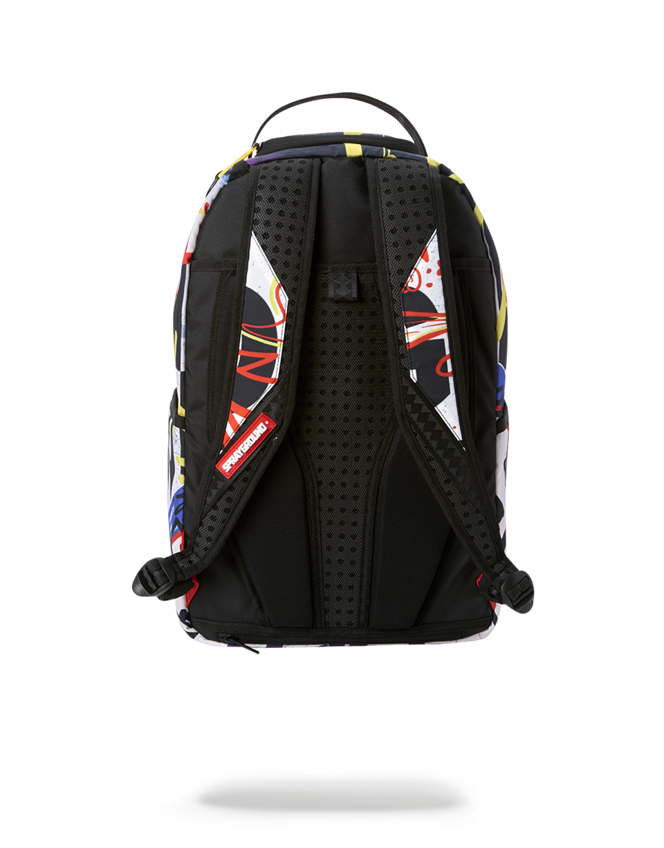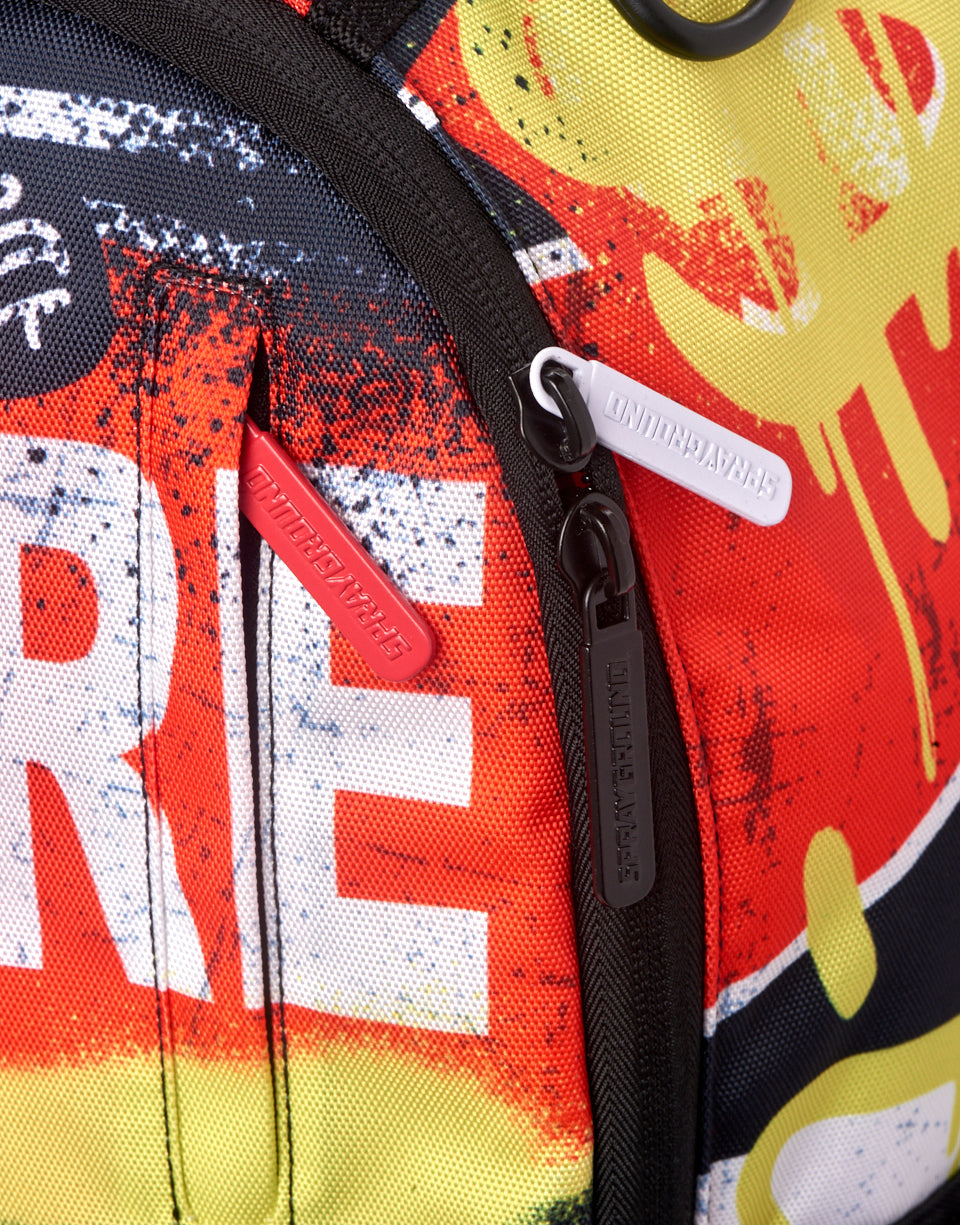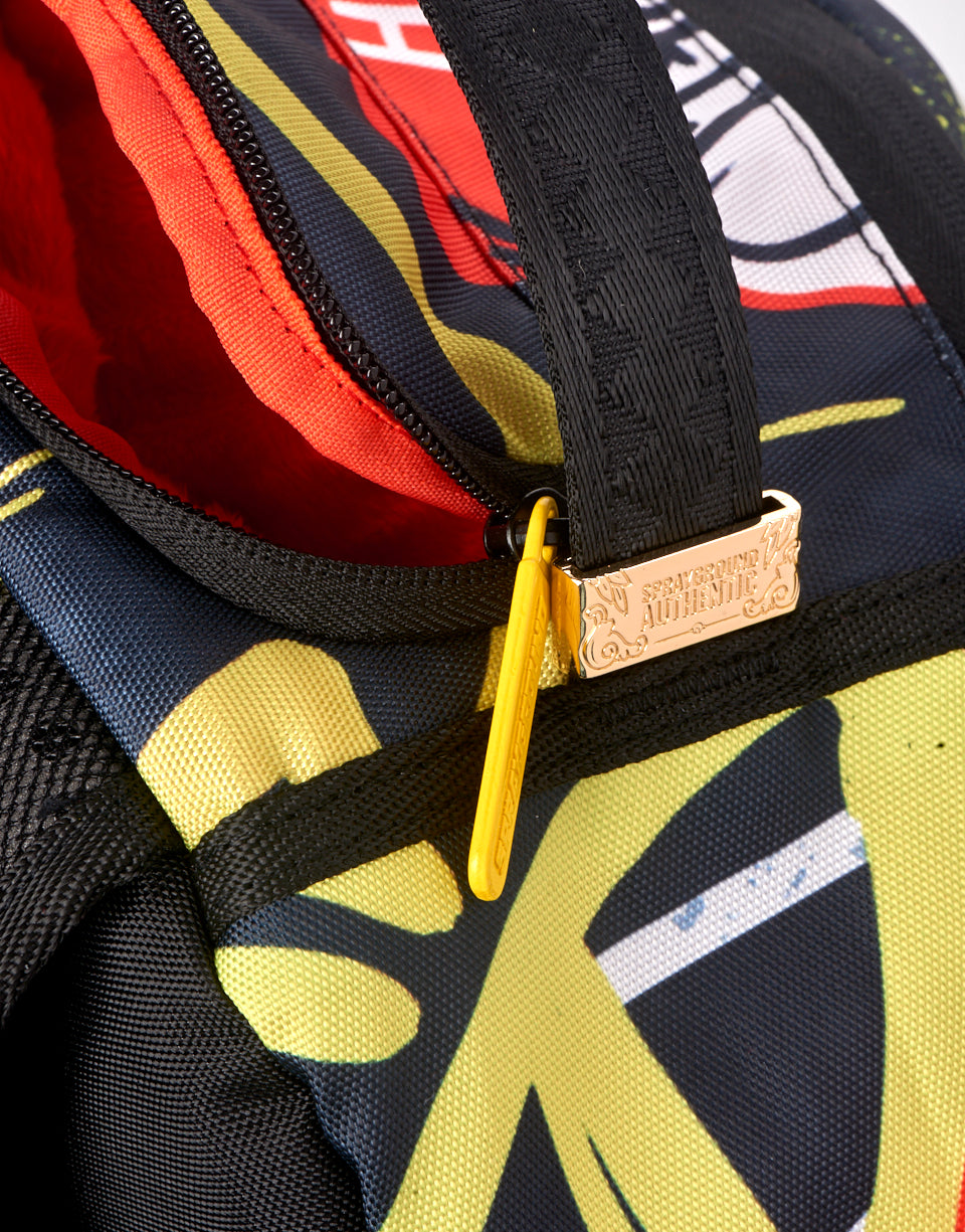 ExteriorDimensions: 18' x 6' x 11.5' • Front zipper pocket • Side pockets • Zippered Stash pocket • Separate velour sunglass compartment • Ergonomic mesh back padding • Adjustable Straps for custom sizing • Multicolor zippers with metal hardware • Metal 'Sprayground Authentic' badge • Slide through back sleeve connects to carry-on luggage to free your hands