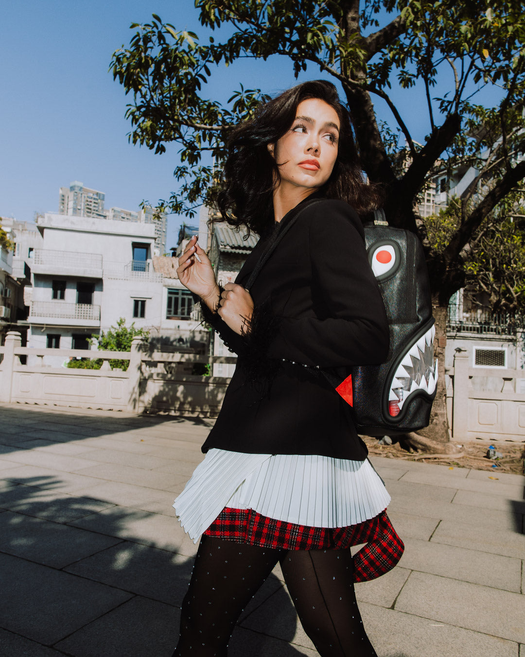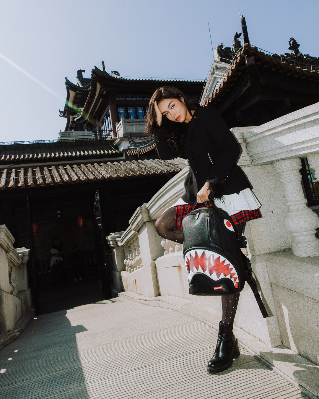 Dimensions: 18' x 6' x 11.5' • Front zipper pocket • Side pockets • Zippered Stash pocket • Separate velour sunglass compartment • Ergonomic mesh back padding • Adjustable Straps for custom sizing • Gold zippers with metal hardware • Metal 'Sprayground Authentic' badge • Slide through back sleeve connects to carry-on luggage to free your hands