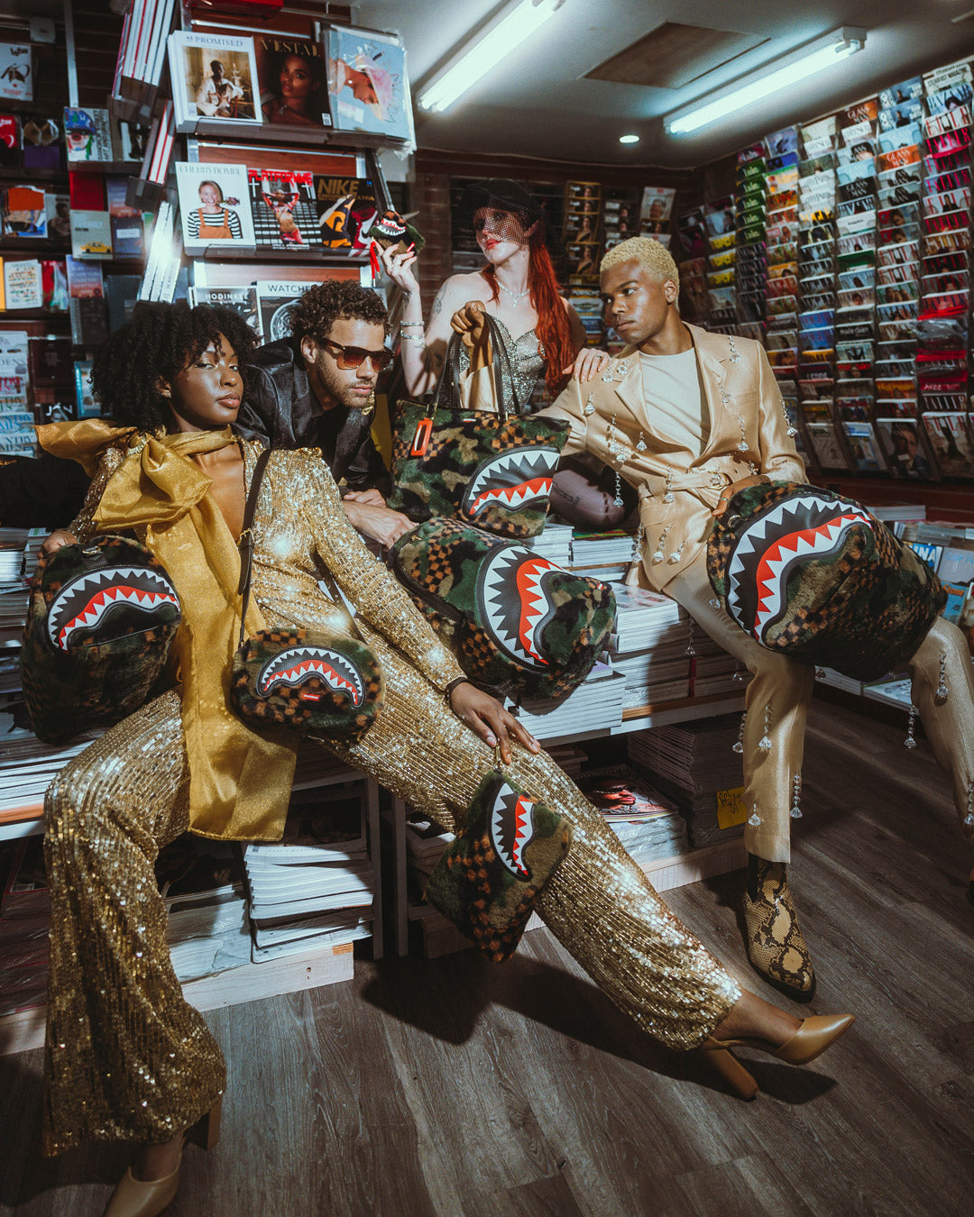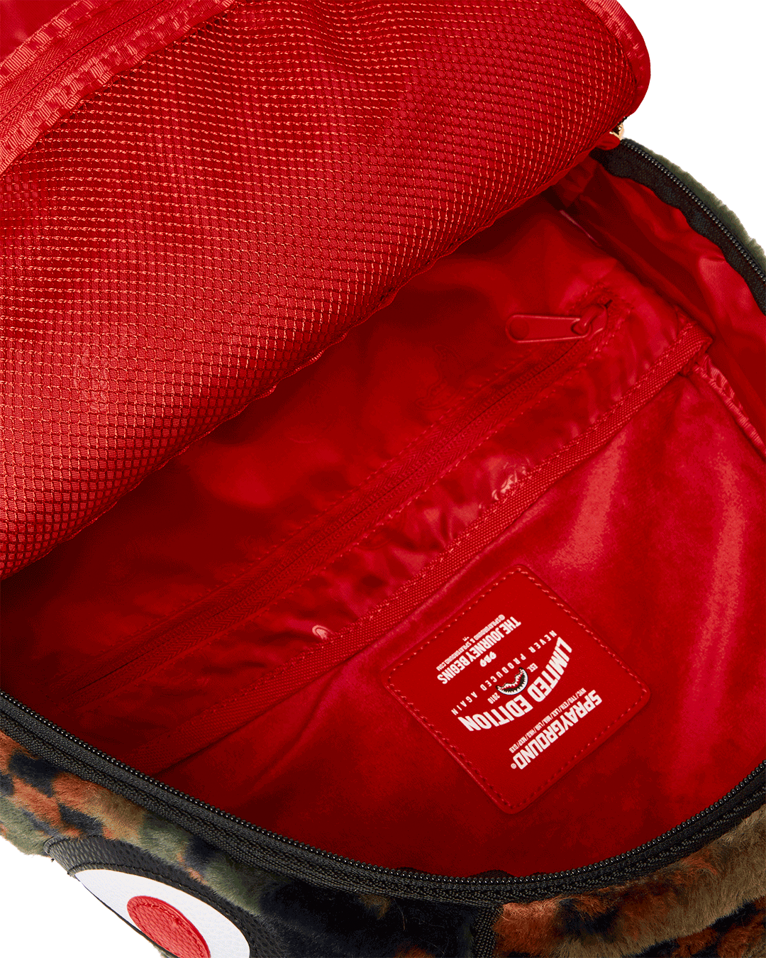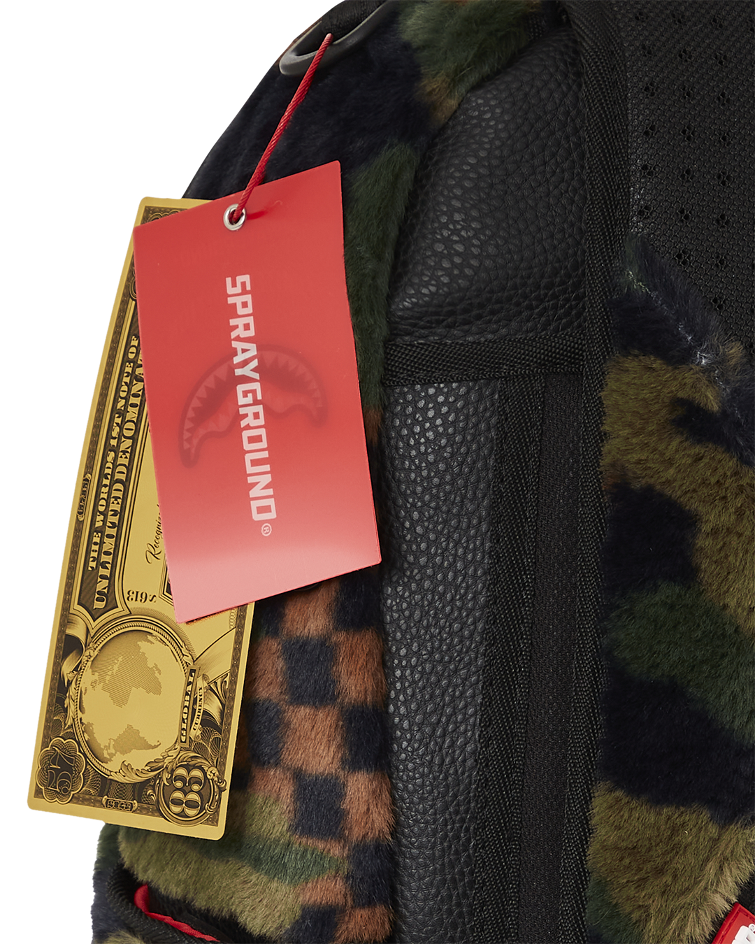 Dimensions: 18' x 6' x 11.5' • Front zipper pocket • Side pockets • Zippered Stash pocket • Separate velour sunglass compartment • Ergonomic mesh back padding • Adjustable Straps for custom sizing • Gold zippers with metal hardware • Metal 'Sprayground Authentic' badge • Slide through back sleeve connects to carry-on luggage to free your hands