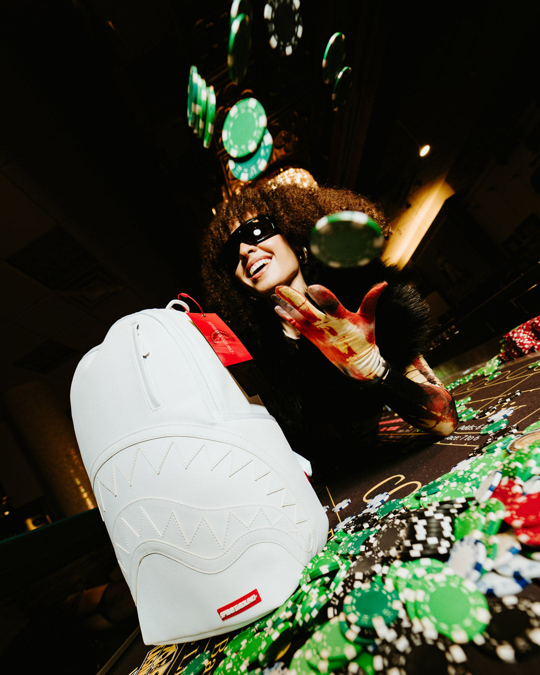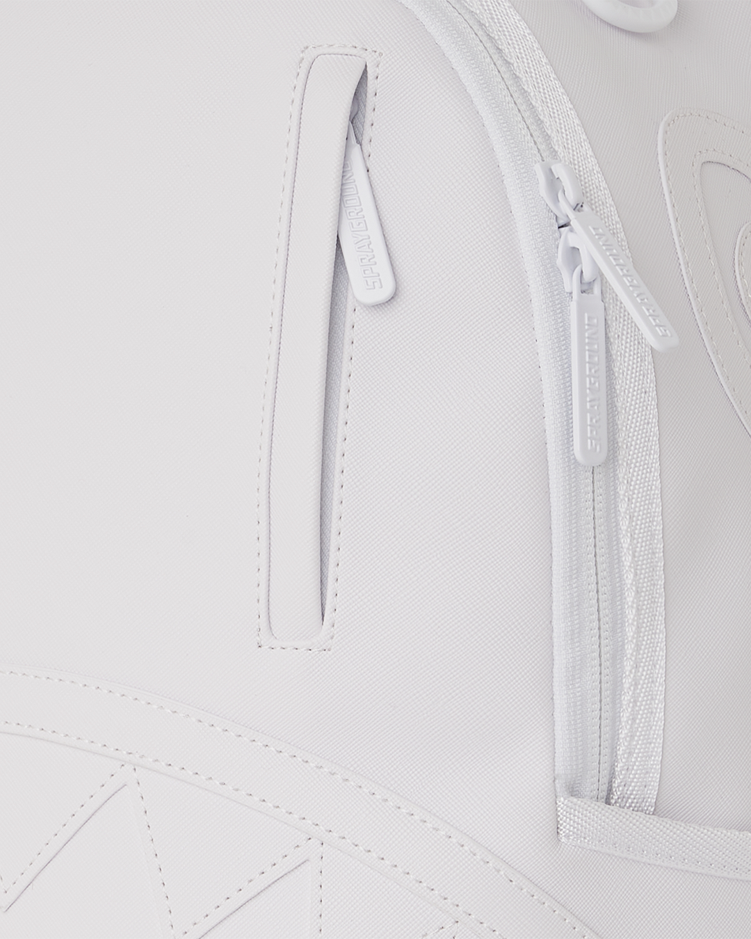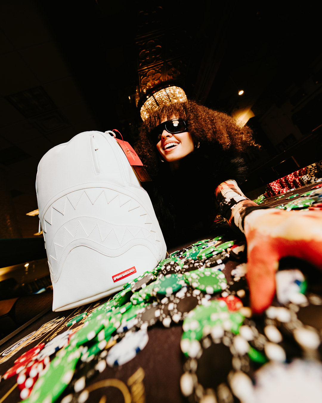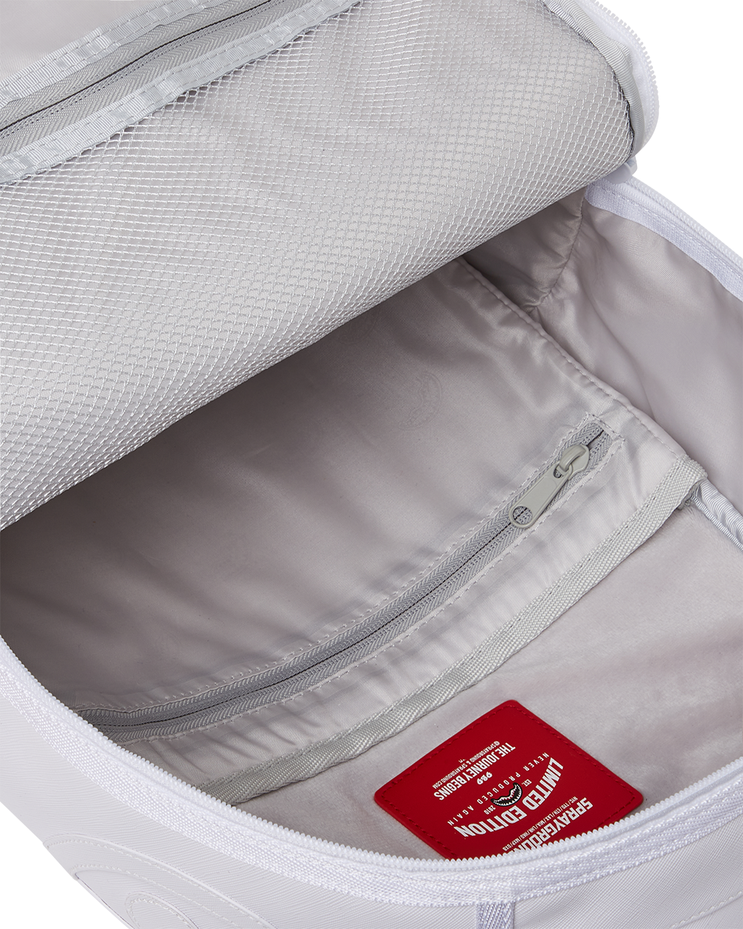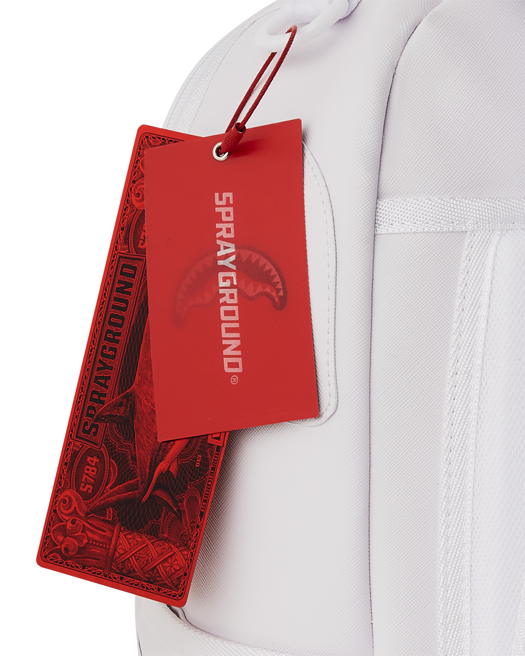 Dimensions: 18' x 6' x 11.5' • Front zipper pocket • Side pockets • Zippered Stash pocket • Separate velour sunglass compartment • Ergonomic mesh back padding • Adjustable Straps for custom sizing • Gold zippers with metal hardware • Metal 'Sprayground Authentic' badge • Slide through back sleeve connects to carry-on luggage to free your hands