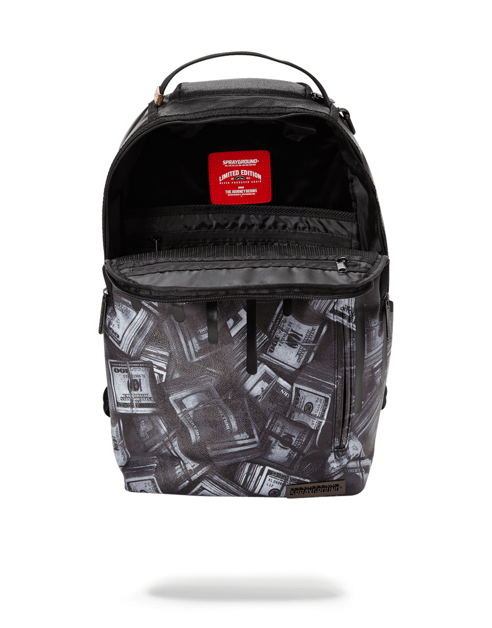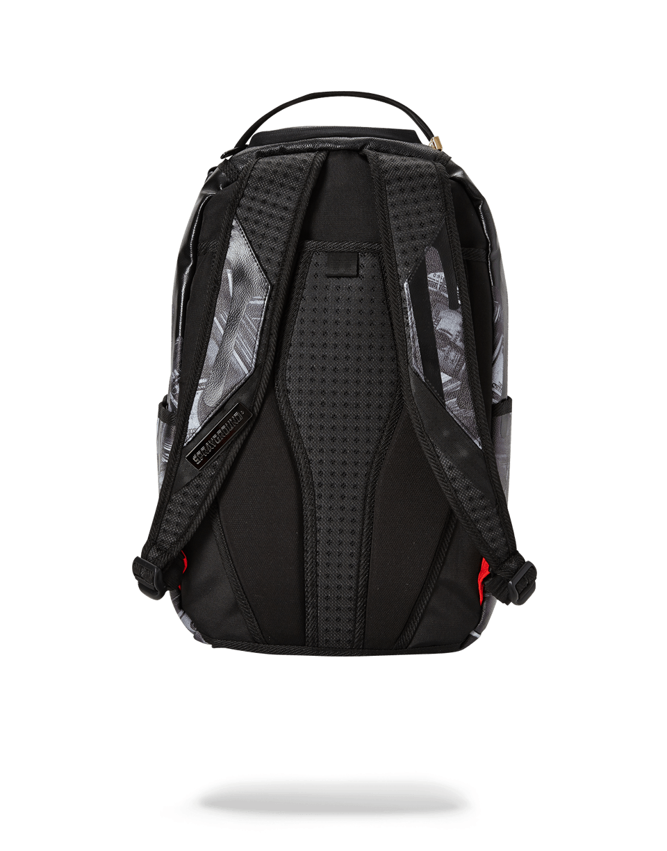 ExteriorDimensions: 18' x 6' x 11.5' ∙ Front zipper pocket ∙ Side pockets ∙ Zippered Stash pocket ∙ Ergonomic mesh back padding ∙ Adjustable Straps for custom sizing ∙ Nylon Zippers with Metal Hardware ∙ Metal 'Sprayground Authentic' badge ∙ Slide through back sleeve connects to Carry on luggage to free your hands
