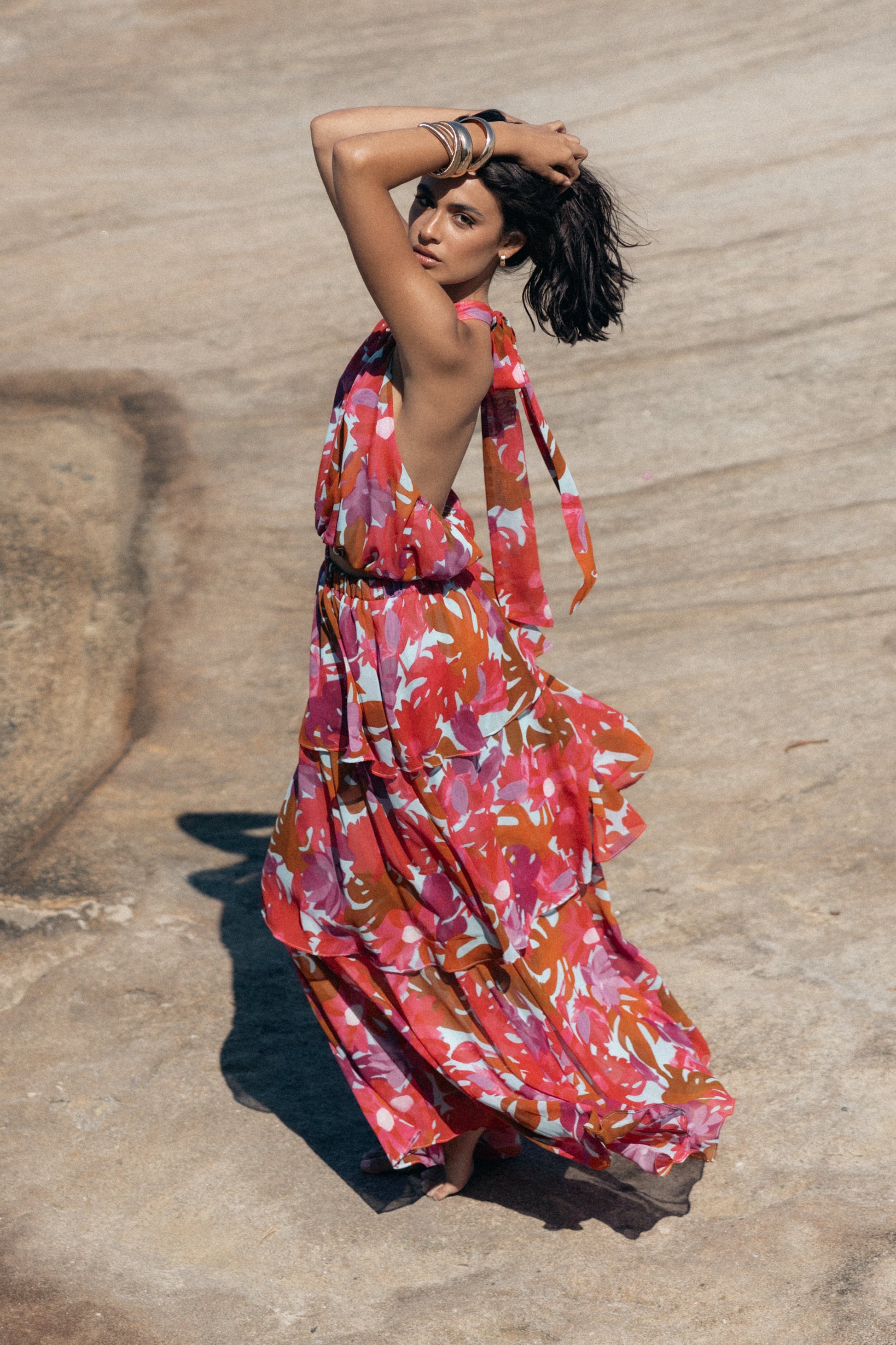 | DETAILS This maxi length skirt is perfect for creating an elegant look. It features a high waisted style with an elasticised waistband for maximum comfort. The drop tiered design gives it a flattering silhouette, and the pink floral print adds a delicate touch of femininity.
