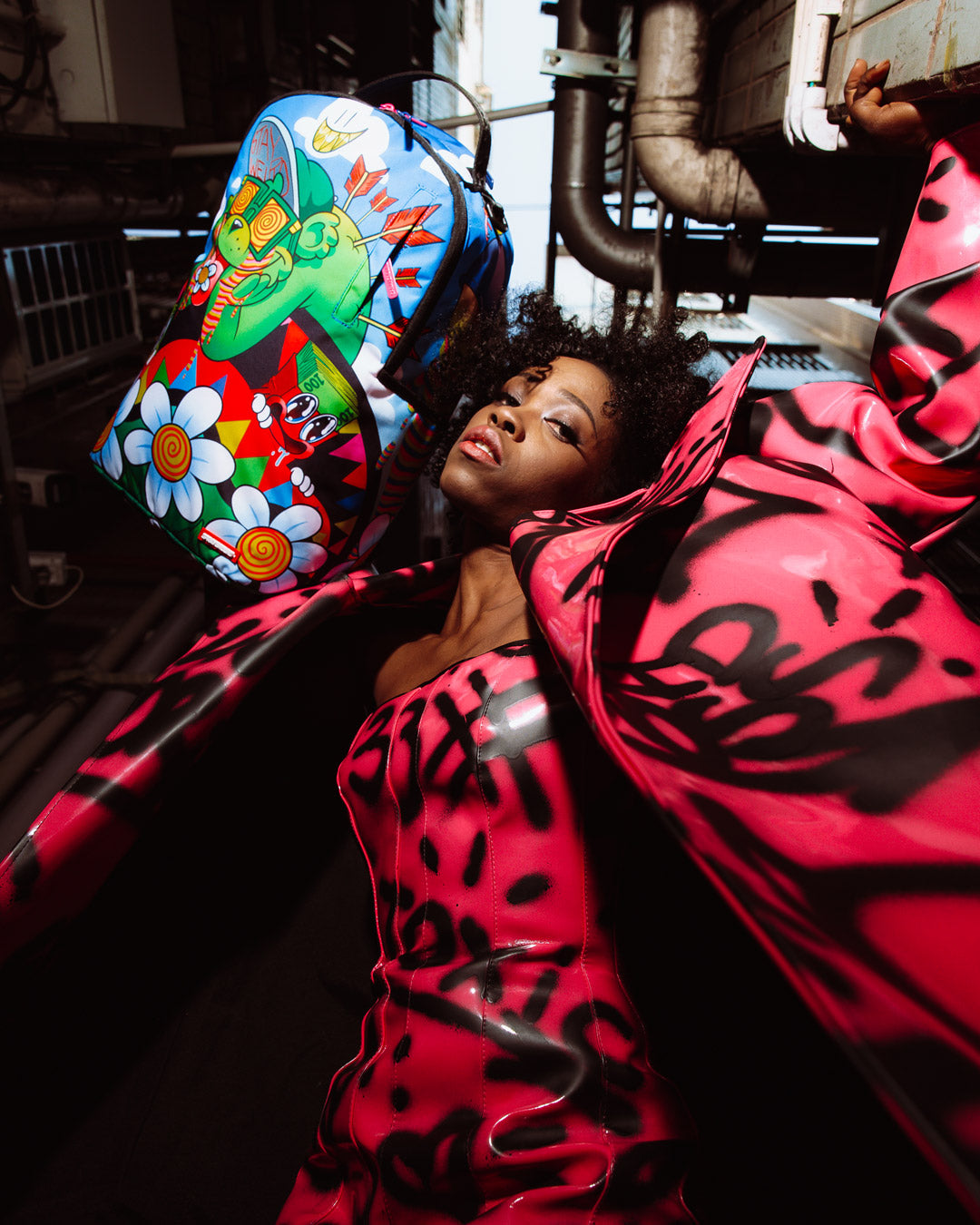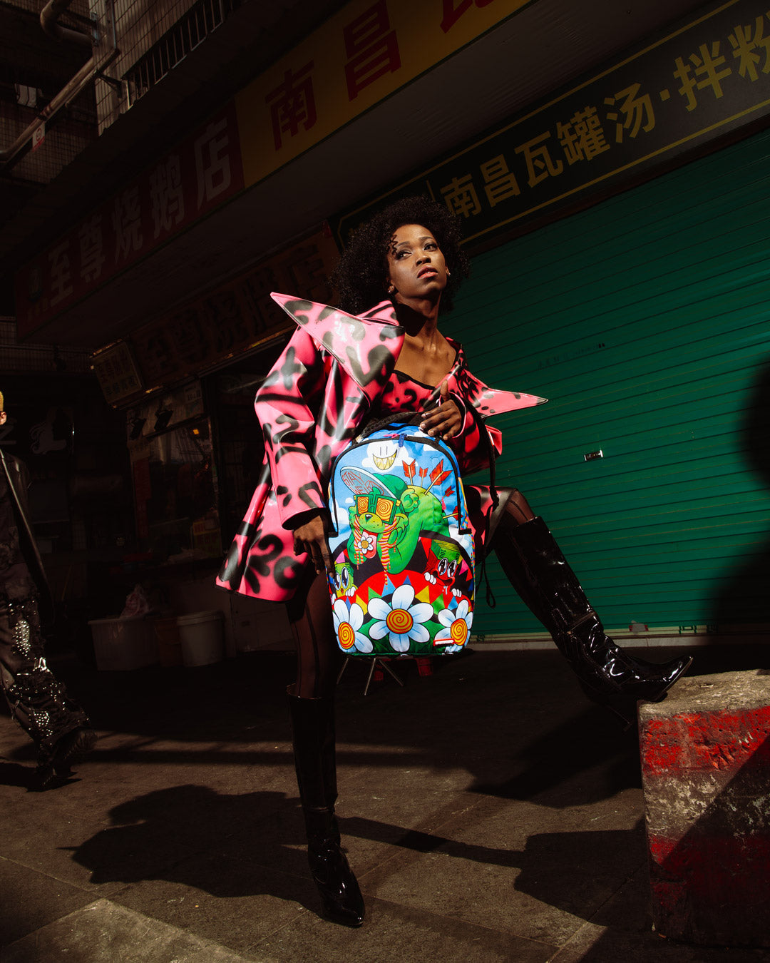 Dimensions: 18' x 6' x 11.5' • Front zipper pocket • Side pockets • Zippered Stash pocket • Separate velour sunglass compartment • Ergonomic mesh back padding • Adjustable Straps for custom sizing • Gold zippers with metal hardware • Metal 'Sprayground Authentic' badge • Slide through back sleeve connects to carry-on luggage to free your hands