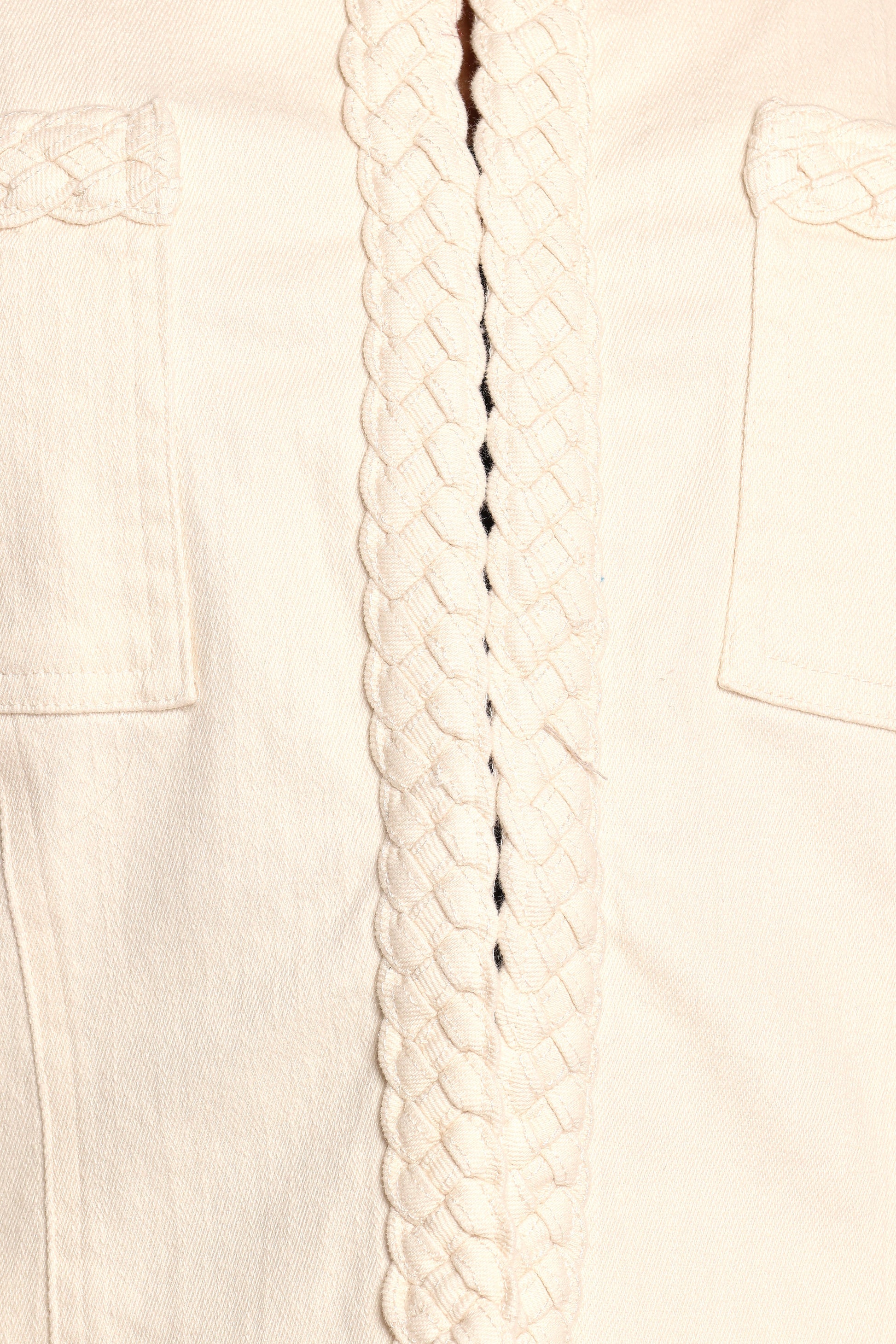 DETAILS Add a polished touch to your wardrobe with the Braided Trim Crop Jacket in Ecru. This chic piece effortlessly combines timeless sophistication with a modern edge. Featuring a stylish round neckline and long sleeves, it's perfect for layering or wearing as a standout piece.