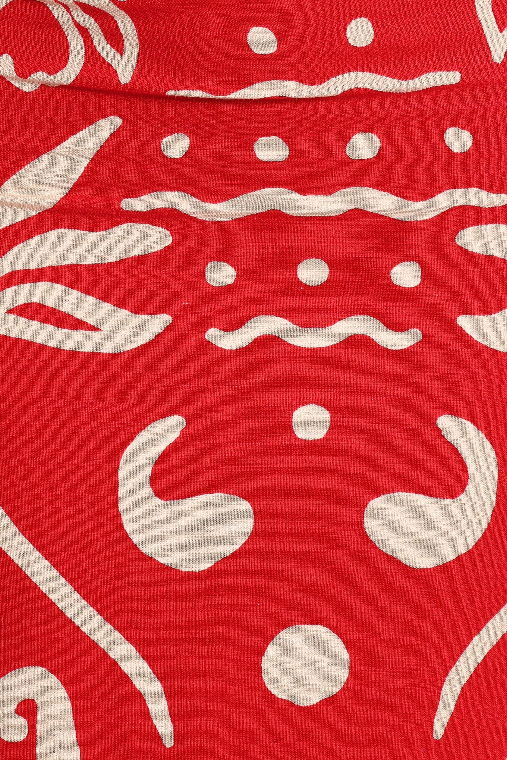 DETAILS With its off-the-shoulder neckline and adjustable tie straps, this piece merges effortless elegance with customizable comfort. The abstract print is a celebration of bold, modern style, while the side split hem detail adds just the right amount of movement and drama.