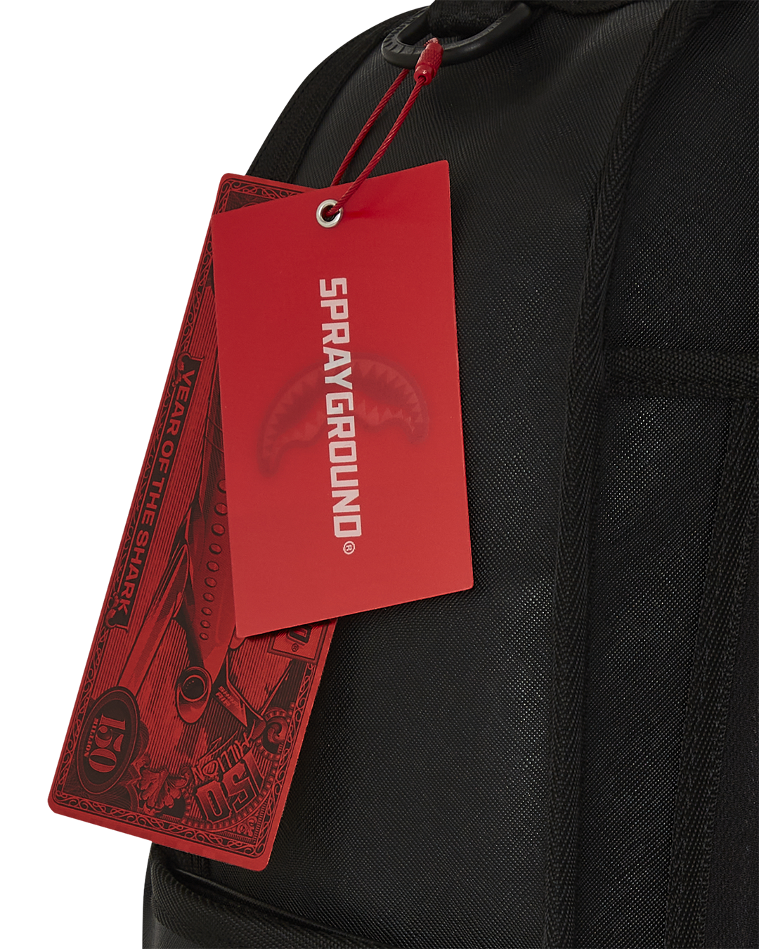Dimensions: 18' x 6' x 11.5' • Front zipper pocket • Side pockets • Zippered Stash pocket • Separate velour sunglass compartment • Ergonomic mesh back padding • Adjustable Straps for custom sizing • Gold zippers with metal hardware • Metal 'Sprayground Authentic' badge • Slide through back sleeve connects to carry-on luggage to free your hands