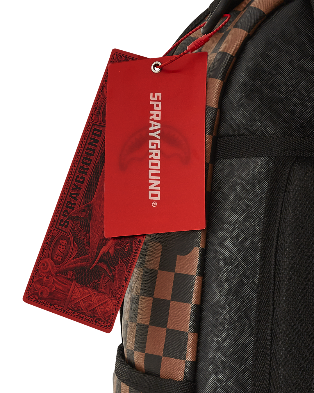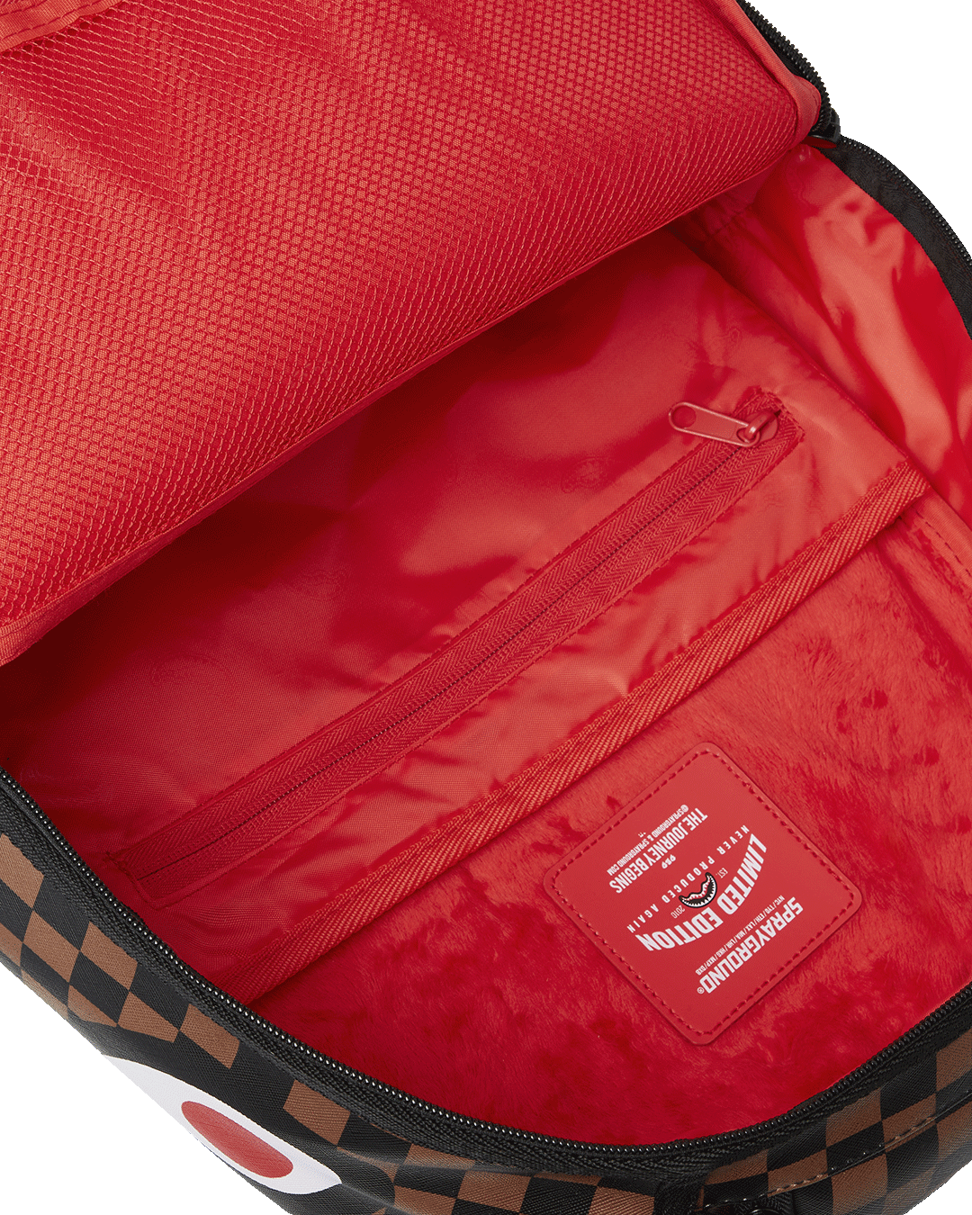 Dimensions: 18' x 6' x 11.5' • Front zipper pocket • Side pockets • Zippered Stash pocket • Separate velour sunglass compartment • Ergonomic mesh back padding • Adjustable Straps for custom sizing • Gold zippers with metal hardware • Metal 'Sprayground Authentic' badge • Slide through back sleeve connects to carry-on luggage to free your hands