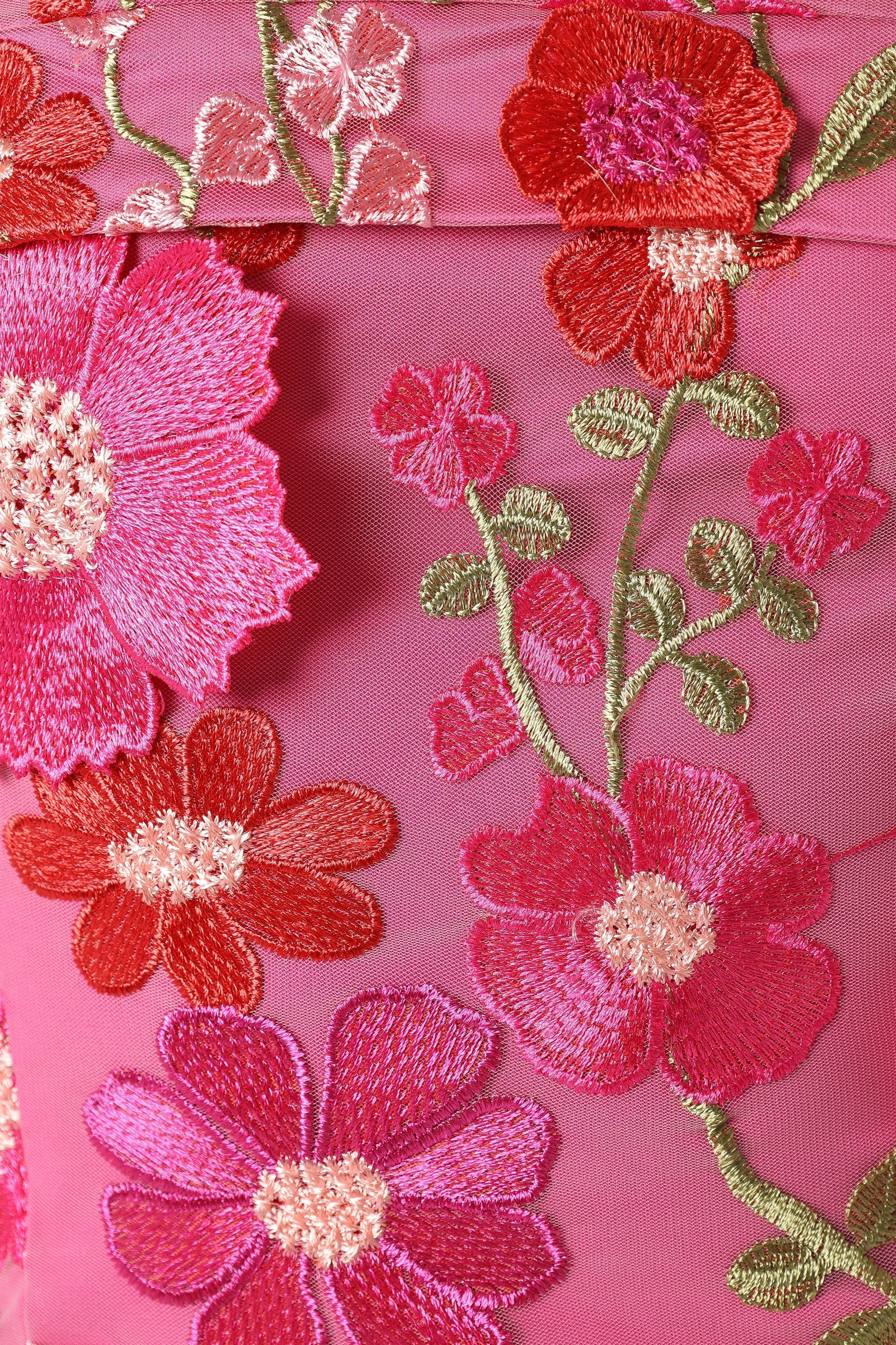 DETAILS This fashion-forward piece, with its playful mini length, allows you to show off your style. The strapless design and straight neckline beautifully highlight your shoulders, while the fold-over detail on the bust adds a touch of sophisticated allure. The multicoloured embroidered flowers that dance against the vibrant pink backdrop, promising to steal the spotlight wherever you go.