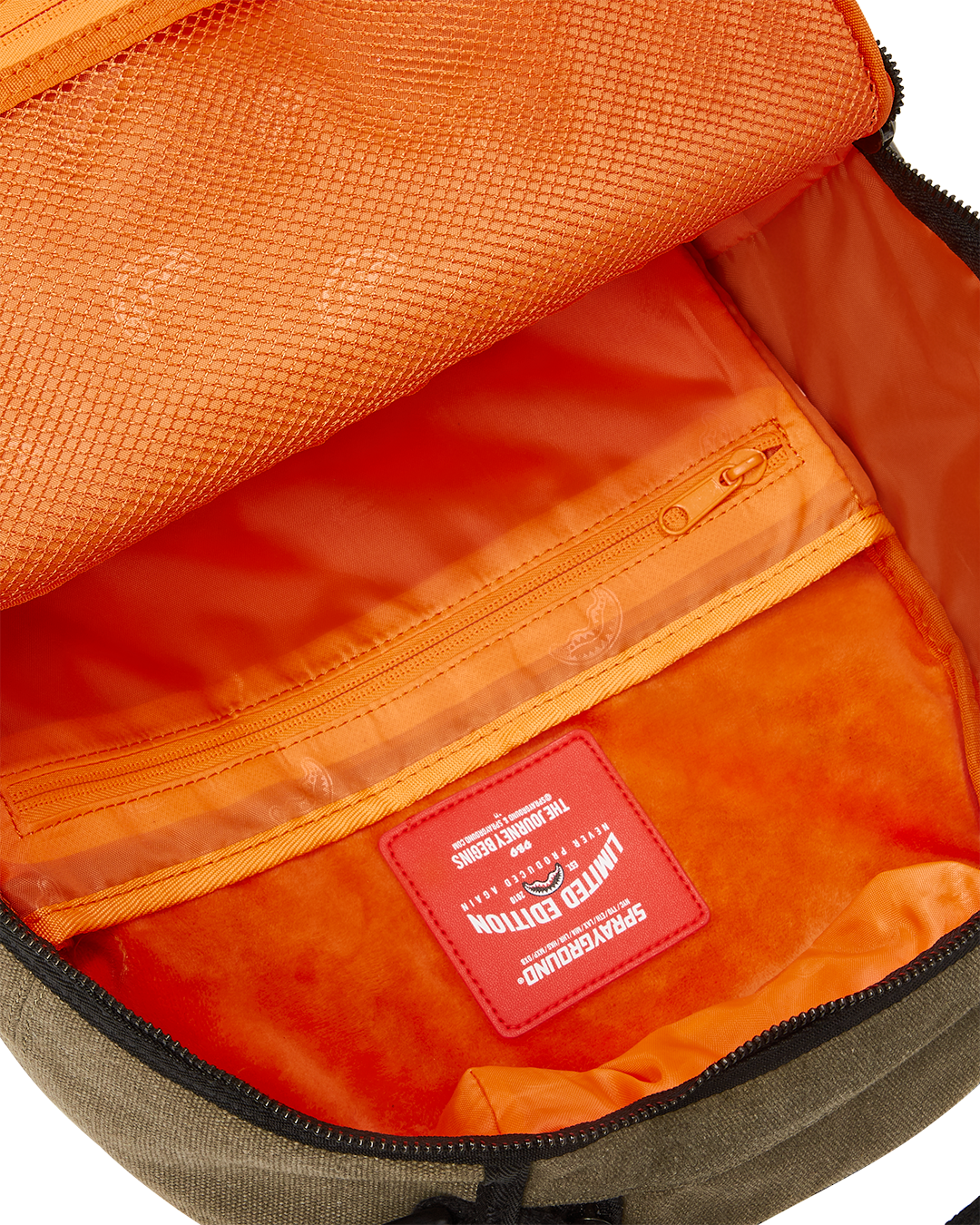ExteriorDimensions: 18' x 6' x 11.5' • Front zipper pocket • Side pockets • Zippered Stash pocket • Separate velour sunglass compartment • Ergonomic mesh back padding • Adjustable Straps for custom sizing • Green zippers with metal hardware • Metal 'Sprayground Authentic' badge • Slide through back sleeve connects to carry on luggage to free your hands