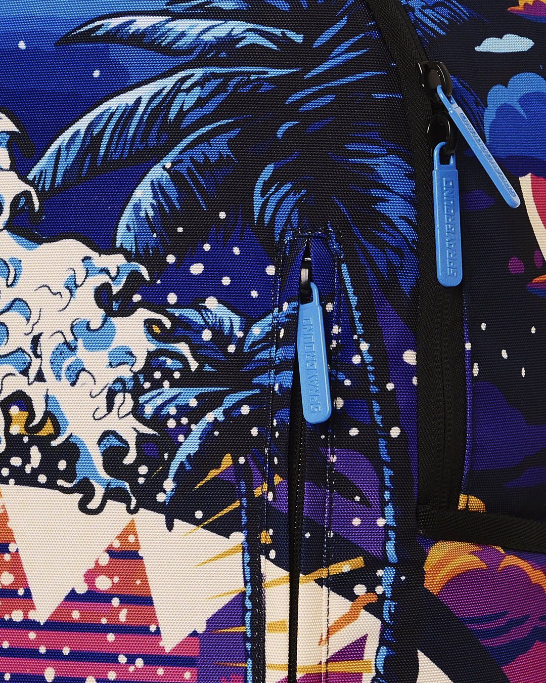 Dimensions: 18' x 6' x 11.5' • Front zipper pocket • Side pockets • Zippered Stash pocket • Separate velour sunglass compartment • Ergonomic mesh back padding • Adjustable Straps for custom sizing • Gold zippers with metal hardware • Metal 'Sprayground Authentic' badge • Slide through back sleeve connects to carry-on luggage to free your hands