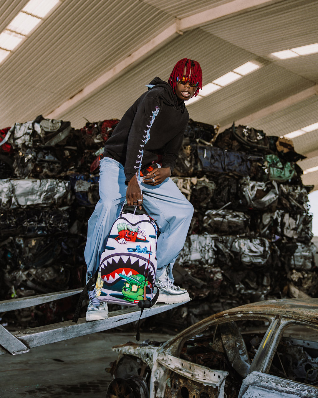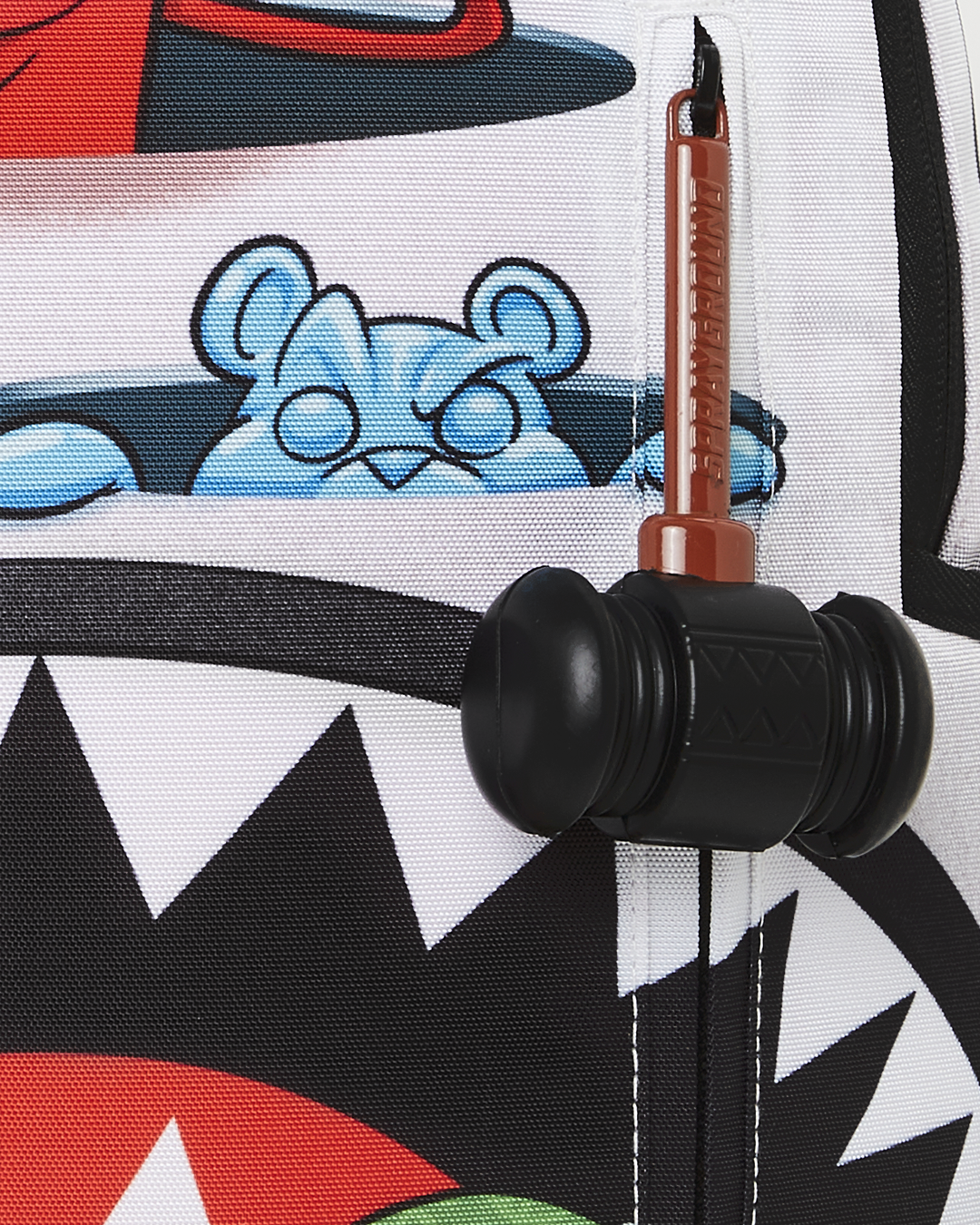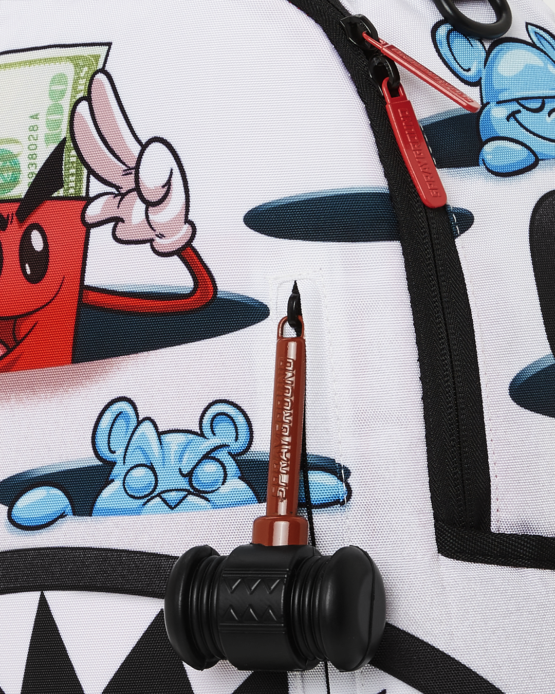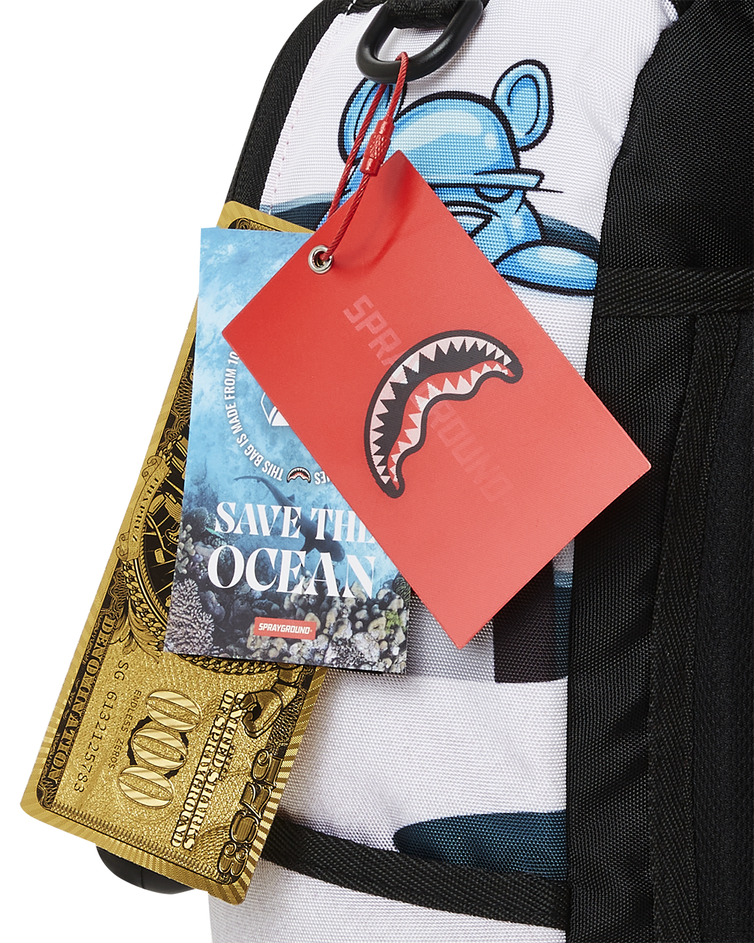 Dimensions: 18' x 6' x 11.5' • Front zipper pocket • Side pockets • Zippered Stash pocket • Separate velour sunglass compartment • Ergonomic mesh back padding • Adjustable Straps for custom sizing • Gold zippers with metal hardware • Metal 'Sprayground Authentic' badge • Slide through back sleeve connects to carry-on luggage to free your hands