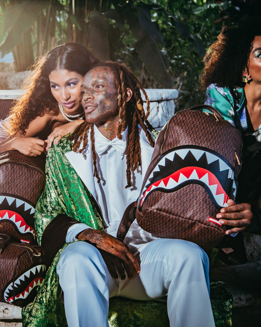 Dimensions: 18' x 6' x 11.5' • Front zipper pocket • Side pockets • Zippered Stash pocket • Separate velour sunglass compartment • Ergonomic mesh back padding • Adjustable Straps for custom sizing • Gold zippers with metal hardware • Metal 'Sprayground Authentic' badge • Slide through back sleeve connects to carry-on luggage to free your hands