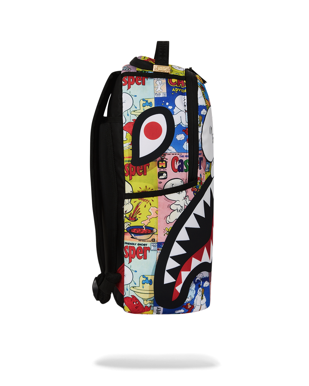 Dimensions: 18' x 6' x 11.5' • Front zipper pocket • Side pockets • Zippered Stash pocket • Separate velour sunglass compartment • Ergonomic mesh back padding • Adjustable Straps for custom sizing • Gold zippers with metal hardware • Metal 'Sprayground Authentic' badge • Slide through back sleeve connects to carry-on luggage to free your hands