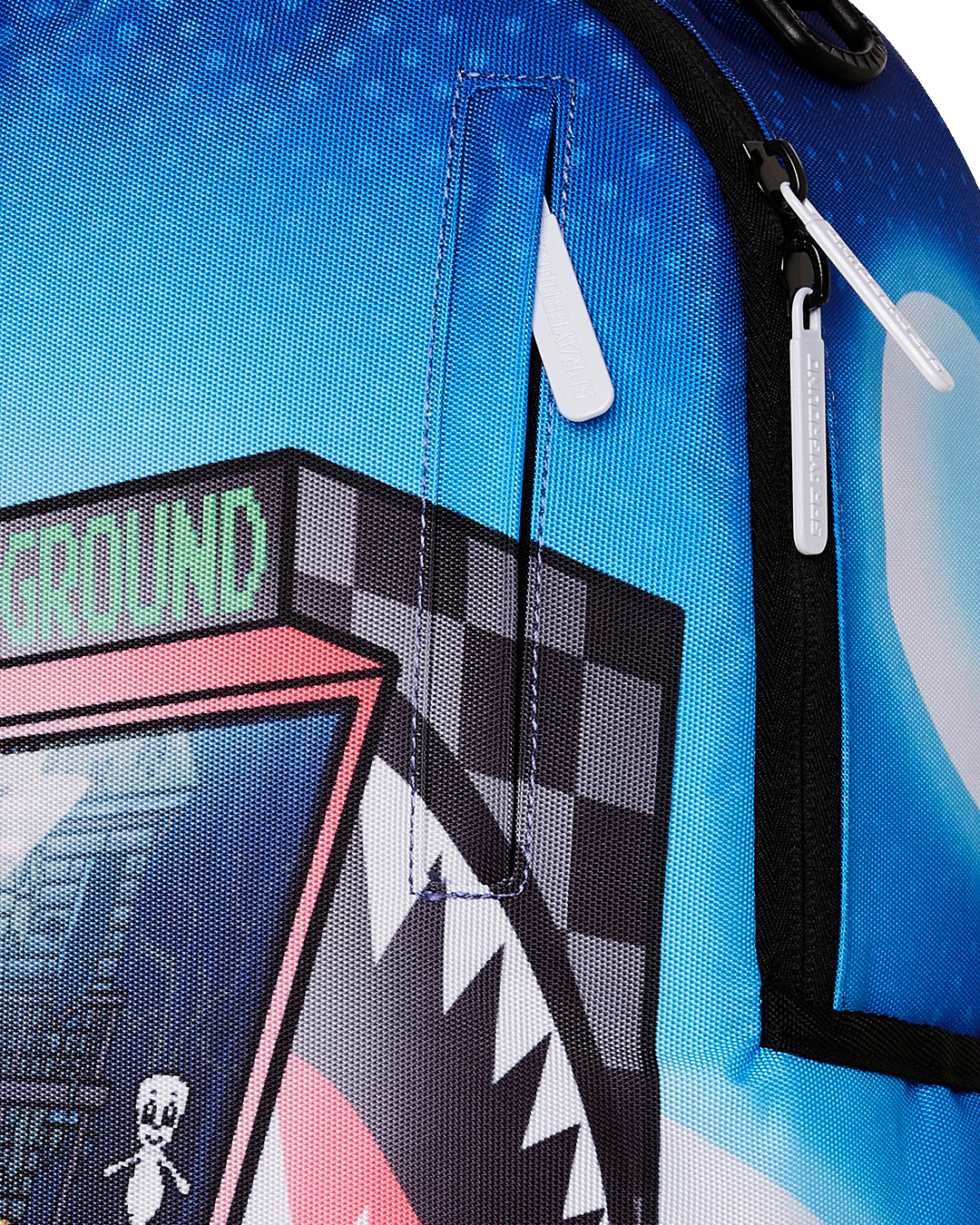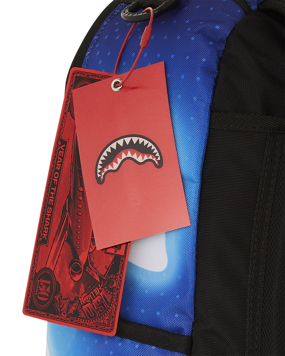 Dimensions: 18' x 6' x 11.5' • Front zipper pocket • Side pockets • Zippered Stash pocket • Separate velour sunglass compartment • Ergonomic mesh back padding • Adjustable Straps for custom sizing • Gold zippers with metal hardware • Metal 'Sprayground Authentic' badge • Slide through back sleeve connects to carry-on luggage to free your hands