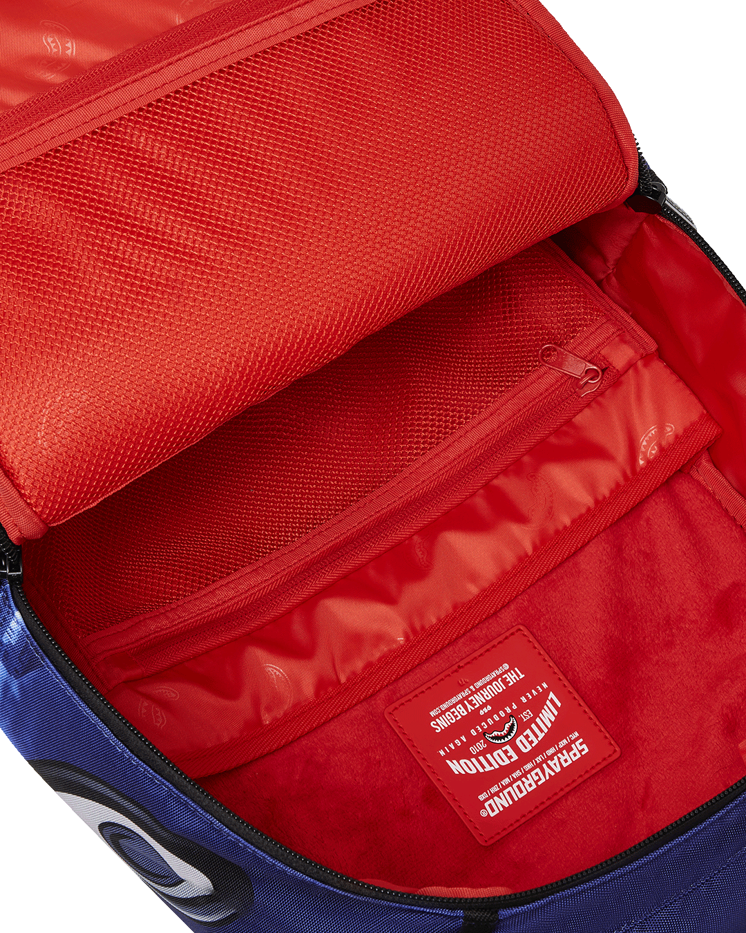Dimensions: 18' x 6' x 11.5' • Front zipper pocket • Side pockets • Zippered Stash pocket • Separate velour sunglass compartment • Ergonomic mesh back padding • Adjustable Straps for custom sizing • Gold zippers with metal hardware • Metal 'Sprayground Authentic' badge • Slide through back sleeve connects to carry-on luggage to free your hands