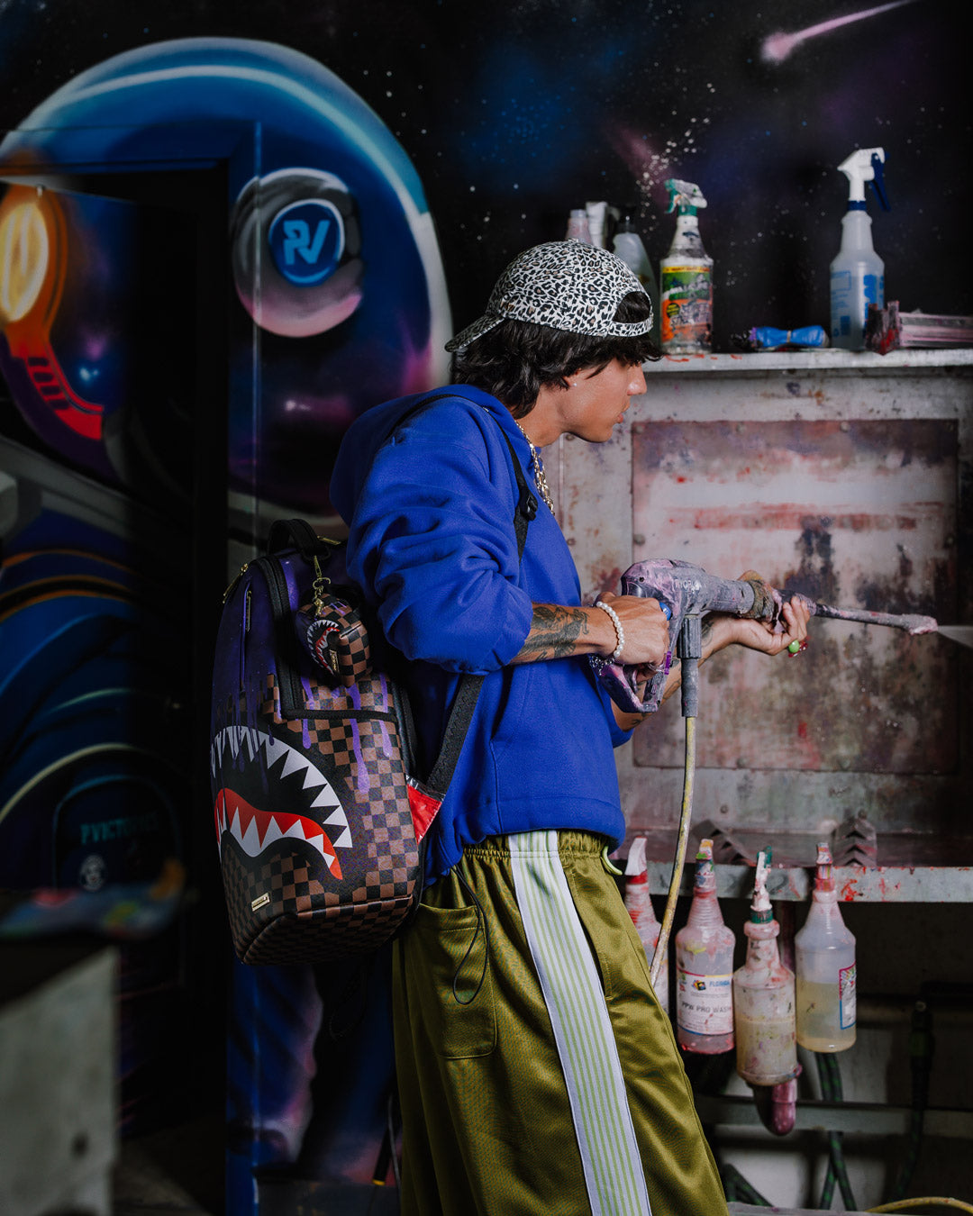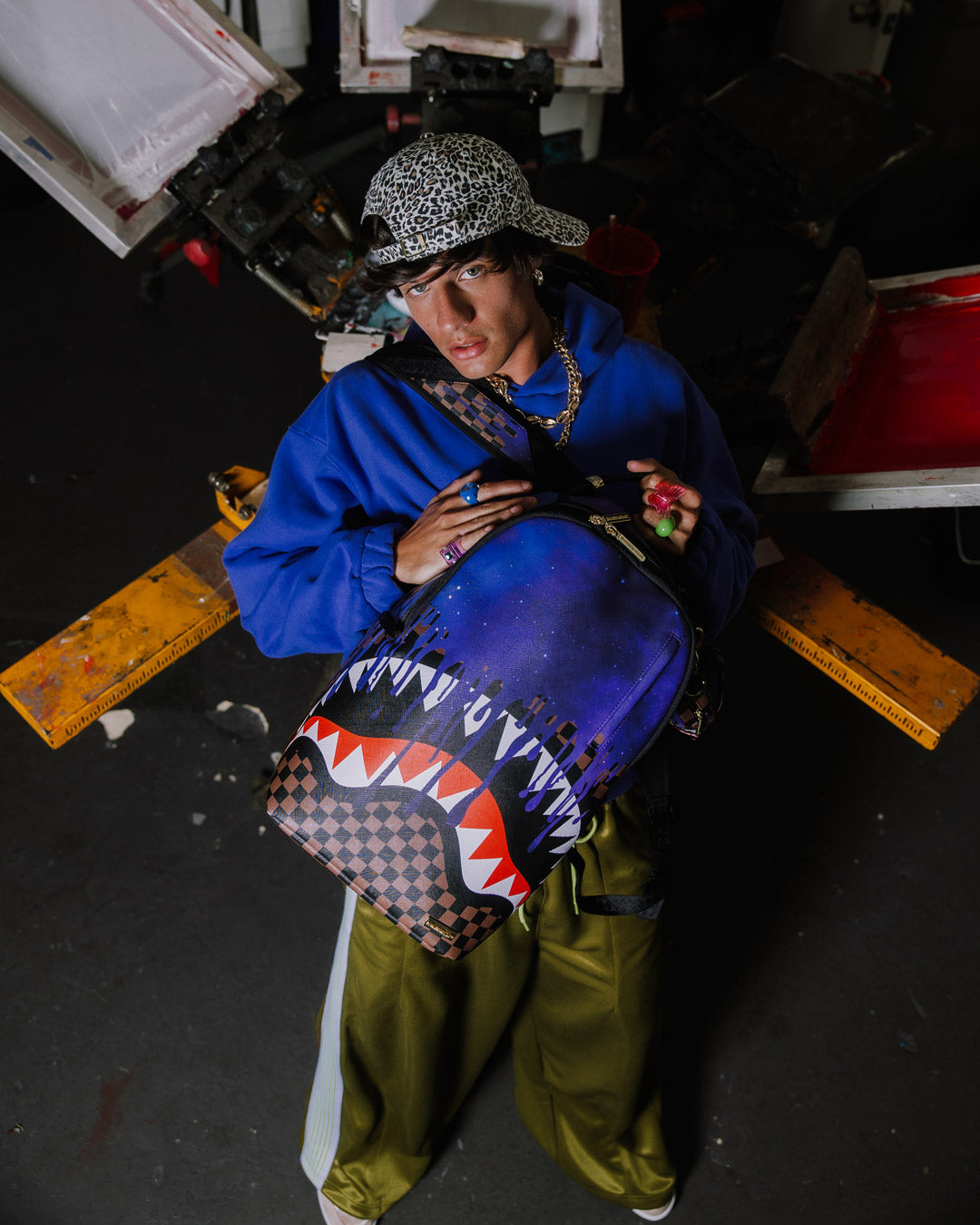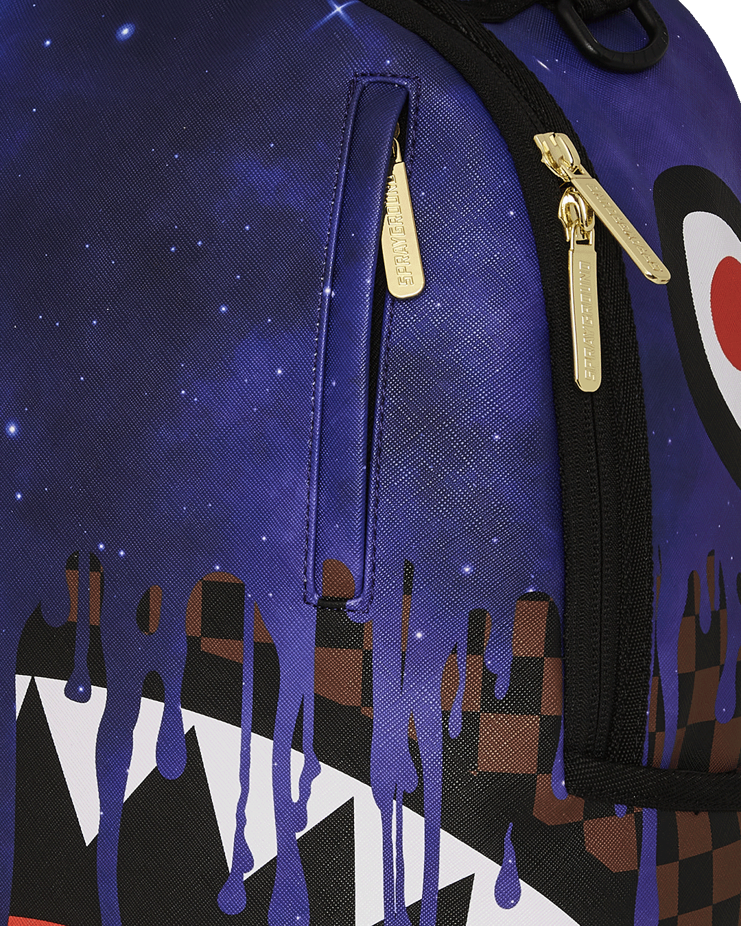 Dimensions: 18' x 6' x 11.5' • Front zipper pocket • Side pockets • Zippered Stash pocket • Separate velour sunglass compartment • Ergonomic mesh back padding • Adjustable Straps for custom sizing • Gold zippers with metal hardware • Metal 'Sprayground Authentic' badge • Slide through back sleeve connects to carry-on luggage to free your hands