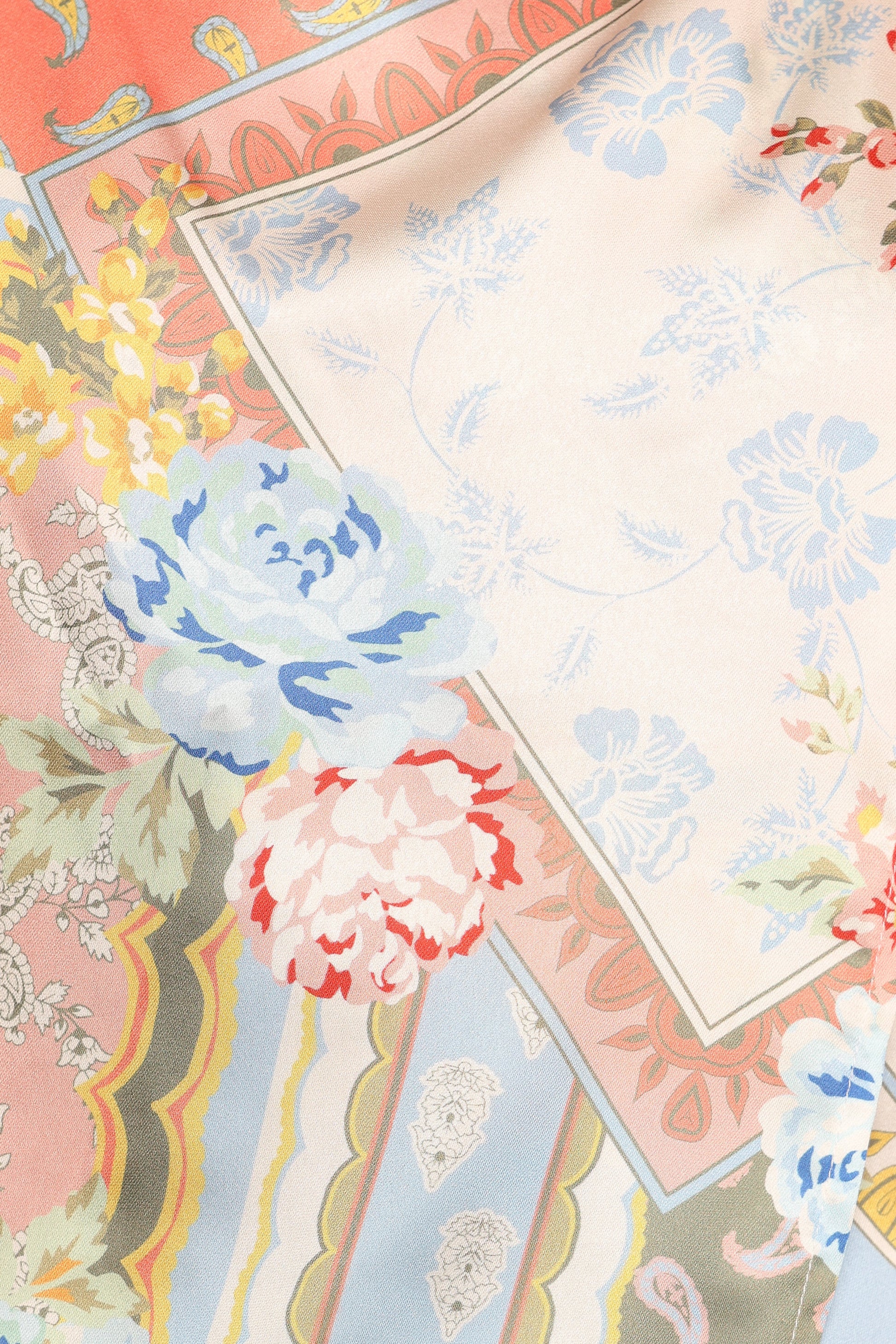 DETAILS Designed with a round neckline and a faux wrap silhouette, this top brings effortless sophistication to any look. The delicate floral paisley tile print adds a fresh, modern twist, while the soft satin-like fabric drapes beautifully, offering both comfort and a touch of luxury.