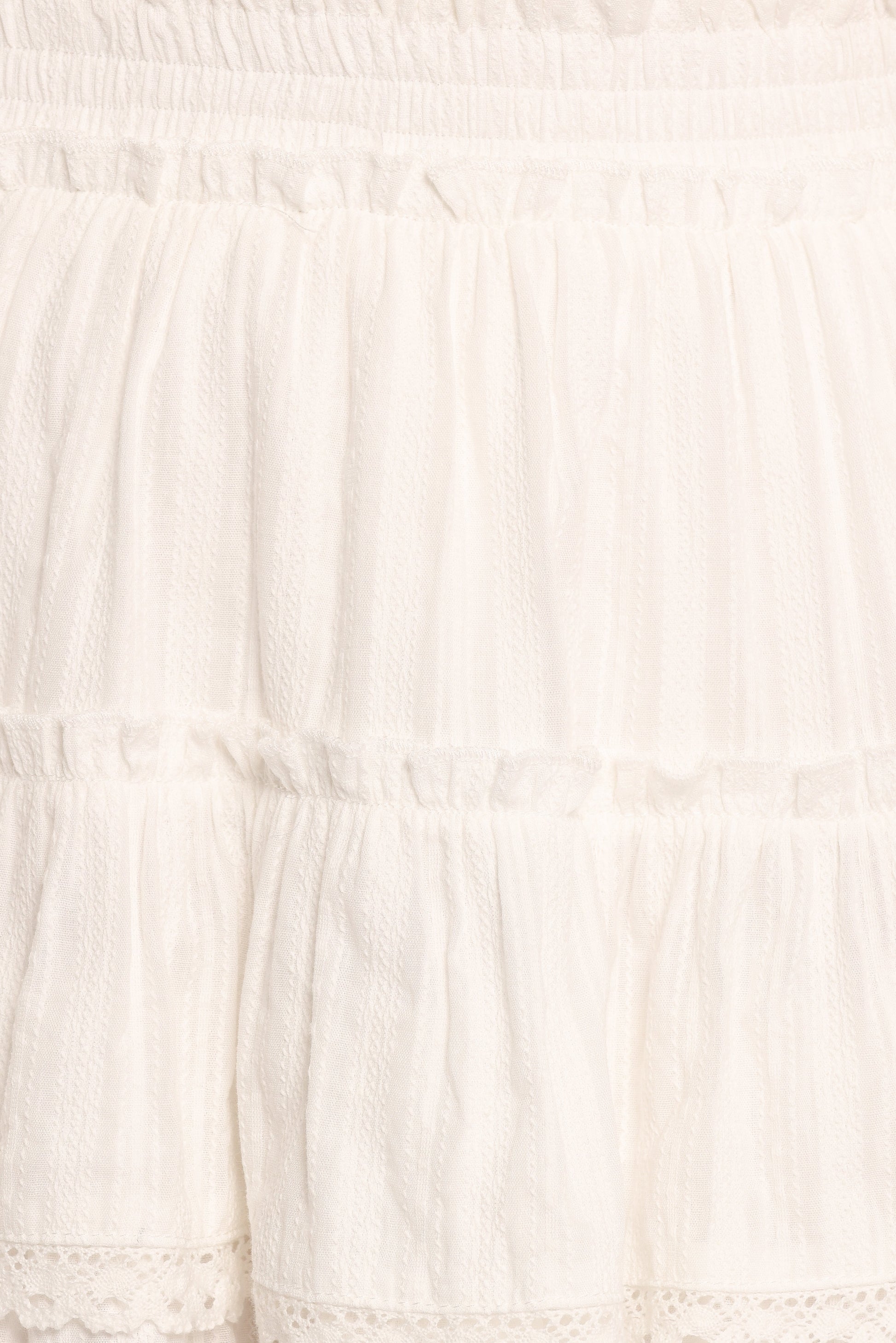 DETAILS This playful piece captures the essence of effortless chic. The tiered design adds a touch of whimsy and movement, ensuring every step you take is imbued with confidence. Delicate lace trim details elevate this skirt, making it the perfect companion for various occasions.